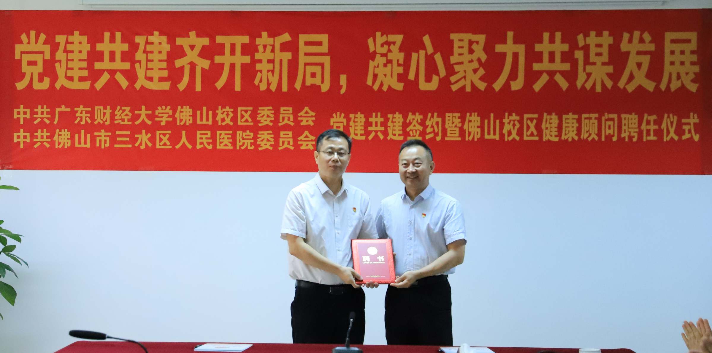 党建共建签约仪式后,举行了佛山校区健康顾问聘任仪式。钟智首先介绍了校区聘任健康顾问的背景和意义,并介绍了蔡敏同志基本情况。随后,王伟为蔡敏颁发了健康顾问聘书。