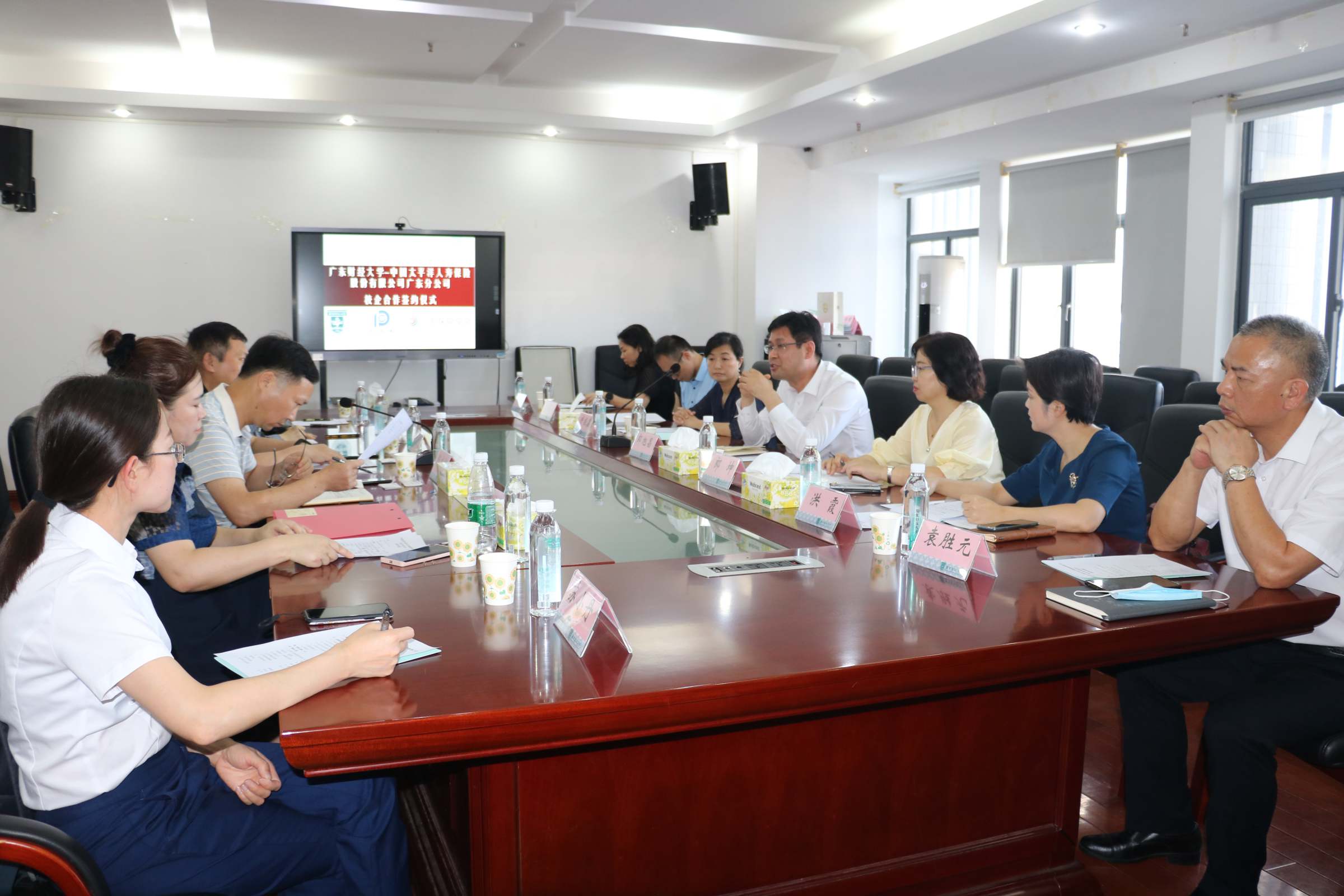5月21日下午,我校金融学院与中国太平洋人寿保险股份有限公司广东分公司在广州校区北二342会议室举行仪式,签订实践教学基地共建协议。太平洋寿险广东分公司党委书记、总经理郎旭昌,党委委员、资深副总经理郎坤,人力资源部总经理洪霞、办公室副主任袁胜元、人力资源部招聘岗苏小丹,广东保险学会秘书长唐振鑫、秘书长助理方凯波、业务部主任助理刘萍,金融学院党委书记陈木河、院长段军山、保险系主任马莉、副主任郑倩昀等出席签约仪式。