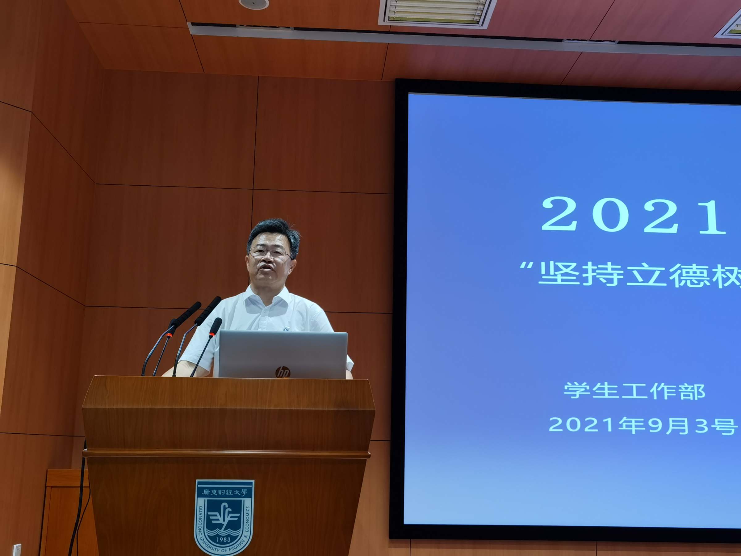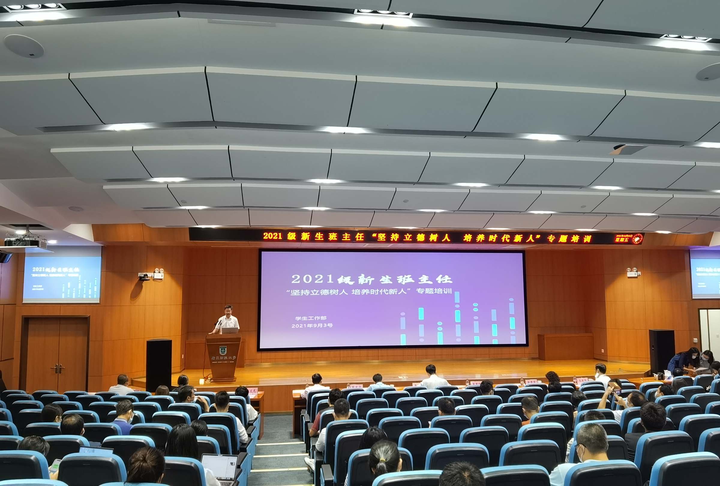 为更好落实立德树人根本任务,进一步加强班主任队伍建设,推进“三全育人”走深走实,9月3日上午,我校在广州校区正心堂报告厅举行了2021级新生班主任“坚持立德树人 培育时代新人”专题培训班。校党委常委、副校长陈国栋,党委学工部部长苏明华、校团委书记张鹏程、门诊部主任赵崇莲,党委教师工作部副部长王超杰、教务处副处长陈发健、心理咨询中心副主任王文龙,教师代表王方方、孙艳阳、陈冰川等出席了培训会,全体2021级新生班主任参加了集中培训。培训由苏明华主持。