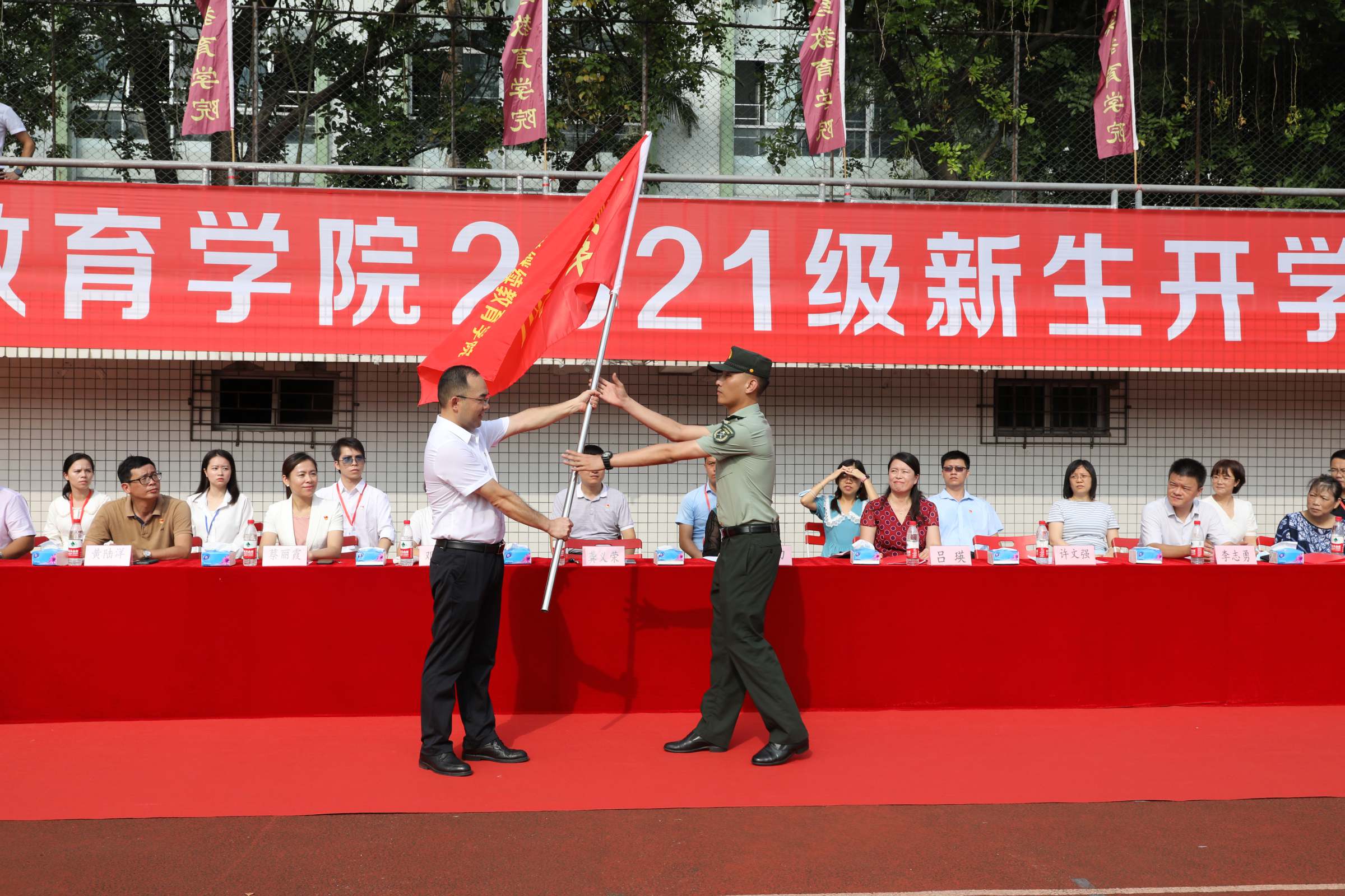 在军训动员大会上,龚义荣向军训团许文强队长授予新生军训团旗。许文强向高度重视军训工作的学院领导表示诚挚的敬意,并对参训新生提出要求。