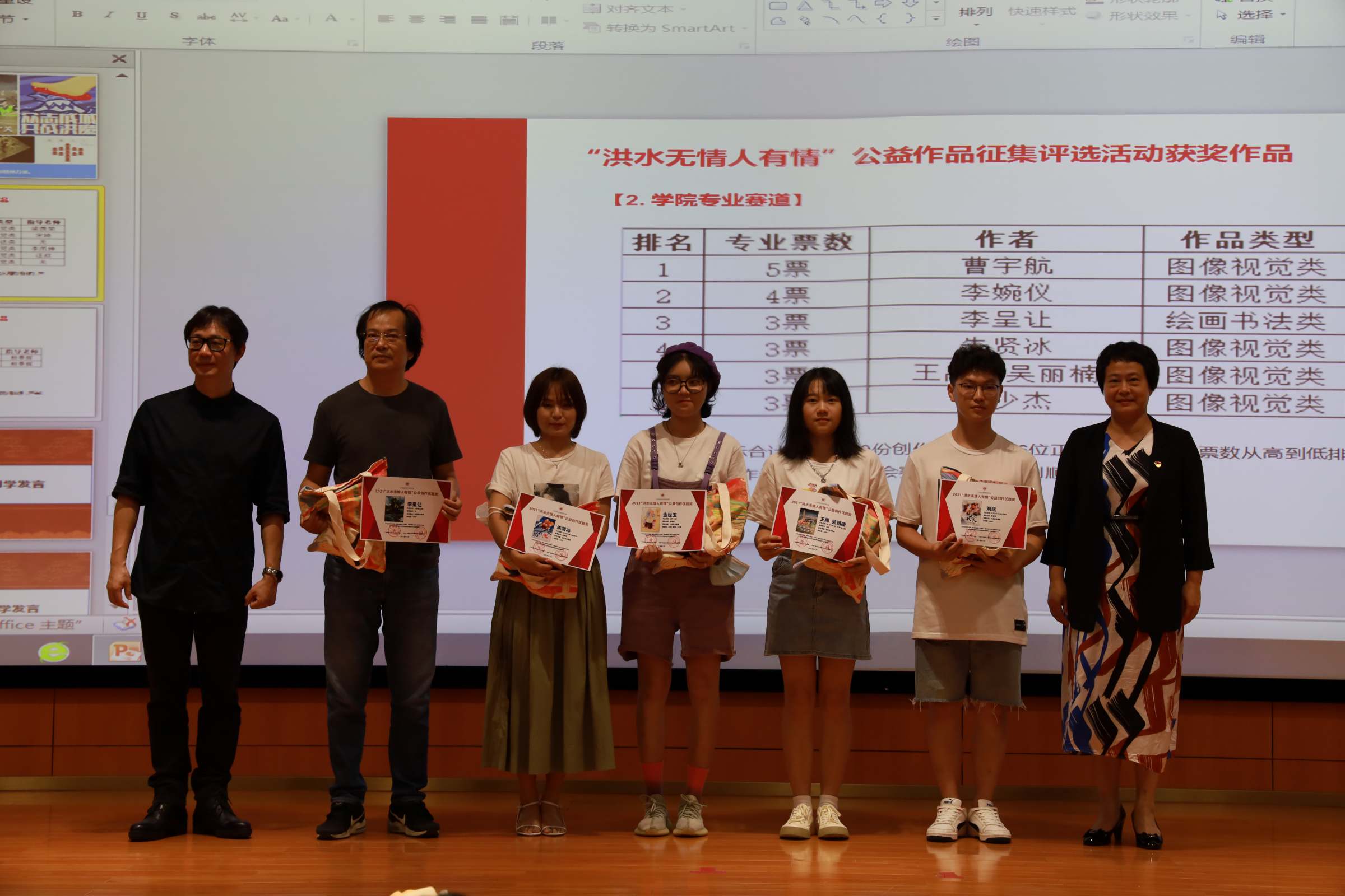 开学典礼上还举办“洪水无情人有情”公益作品征集评选活动颁奖仪式,以表彰今年暑假河南水灾期间,学院第一时间组织的公益宣传活动为榜样,引导新生积极参与“以艺抗疫”“以艺赈灾”,涵养家国情怀,肩负社会担当。