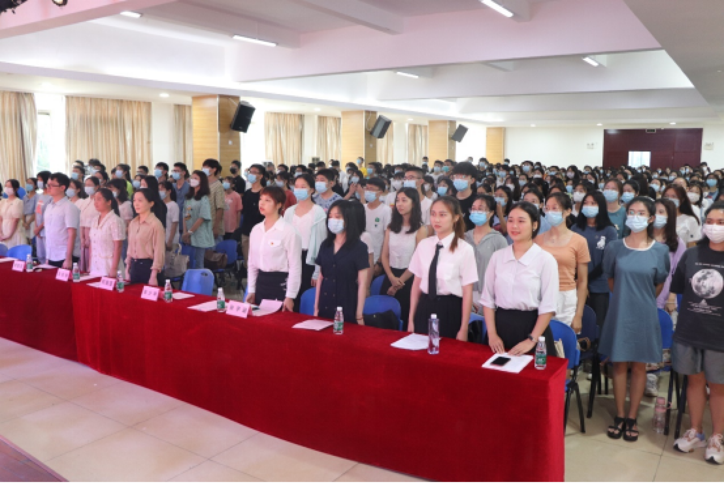 2021级本科商务英语1班陈柔燕同学代表全体新生发言表示,响应习近平总书记的号召,以实现中华民族伟大复兴为己任,牢记校训和老师们的教导,不负时代,不负韶华,做心中有光、脚下有路的广财外院追梦人。她倡议同学们做好规划,确定前进方向,脚踏实地循序渐进;保持自律,以高度的自律做出类拔萃的人、享受高度的自由;坚持不懈,以锲而不舍之精神雕镂金石。