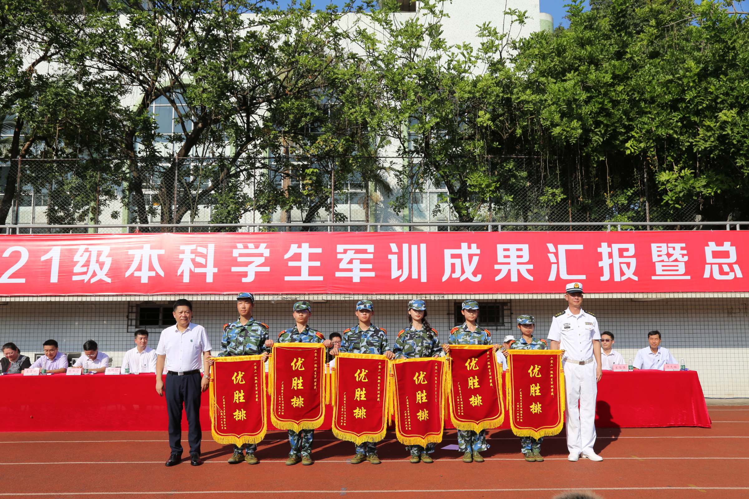 刘祖华、陈国栋作军训总结讲话。他们代表学校向承训部队教官们和师生工作人员表示衷心的感谢,向全体参训学员致以热烈的祝贺。他们对本次军训的成果给予了充分的肯定,希望同学们能把军训中吃苦耐劳、顽强拼搏的精神,令行禁止、严守纪律的作风,热爱集体、团结奋进的品格,融入到今后的学习和生活中去,在广东财经大学的大家庭里磨炼提升,真正成为德智体美劳全面发展的时代新人,不负伟大时代,不负青春韶华。
