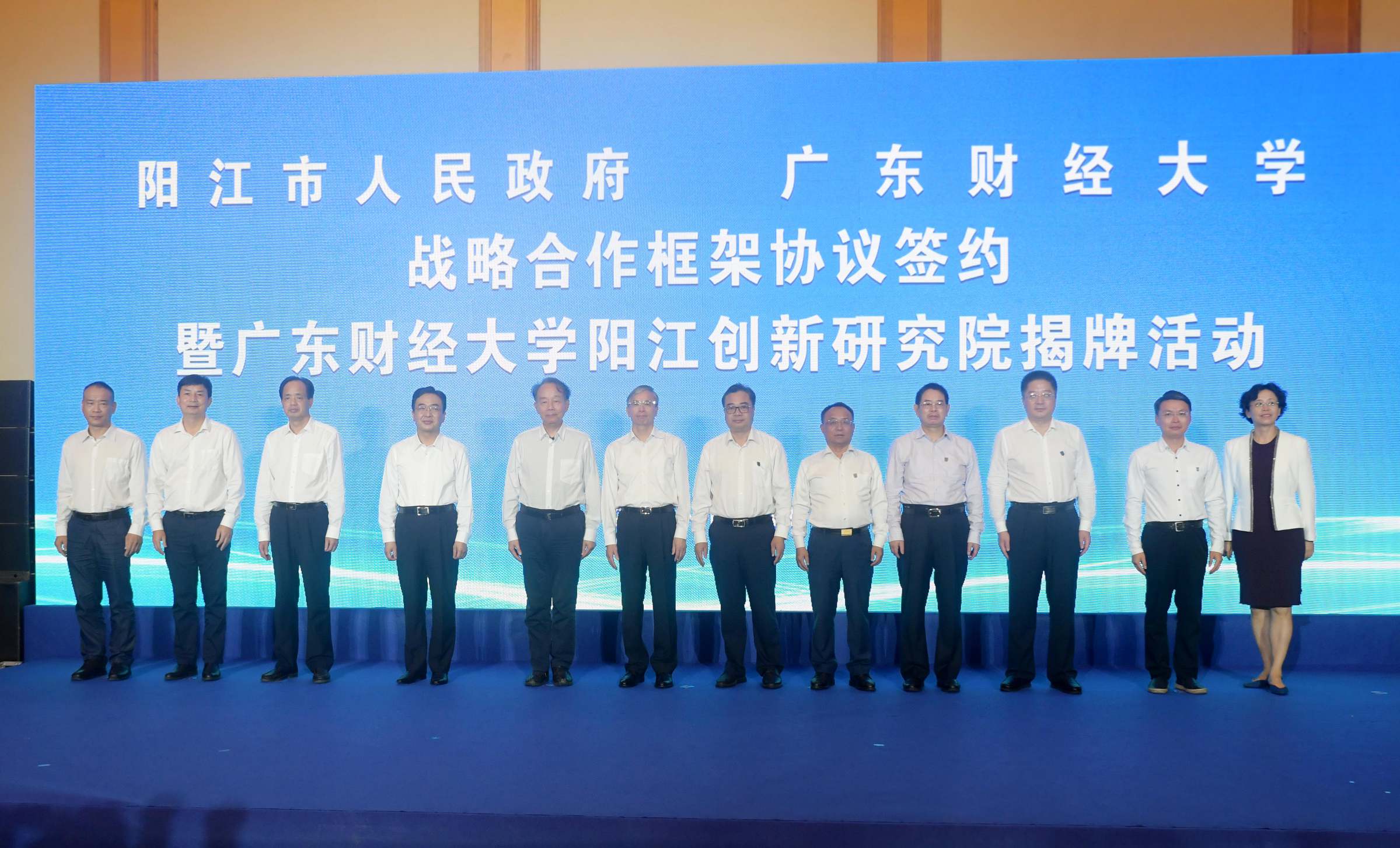 在领导嘉宾共同见证下,副校长邹新月与阳江市委常委、常务副市长张磊代表双方签订《阳江市人民政府 广东财经大学战略合作框架协议》。根据协议,双方将在合作共建实验实践基地、产业孵化中心、人才培养基地、高端智库等方面开展深度合作。随后,有关领导共同为“广东财经大学阳江创新研究院”揭牌。