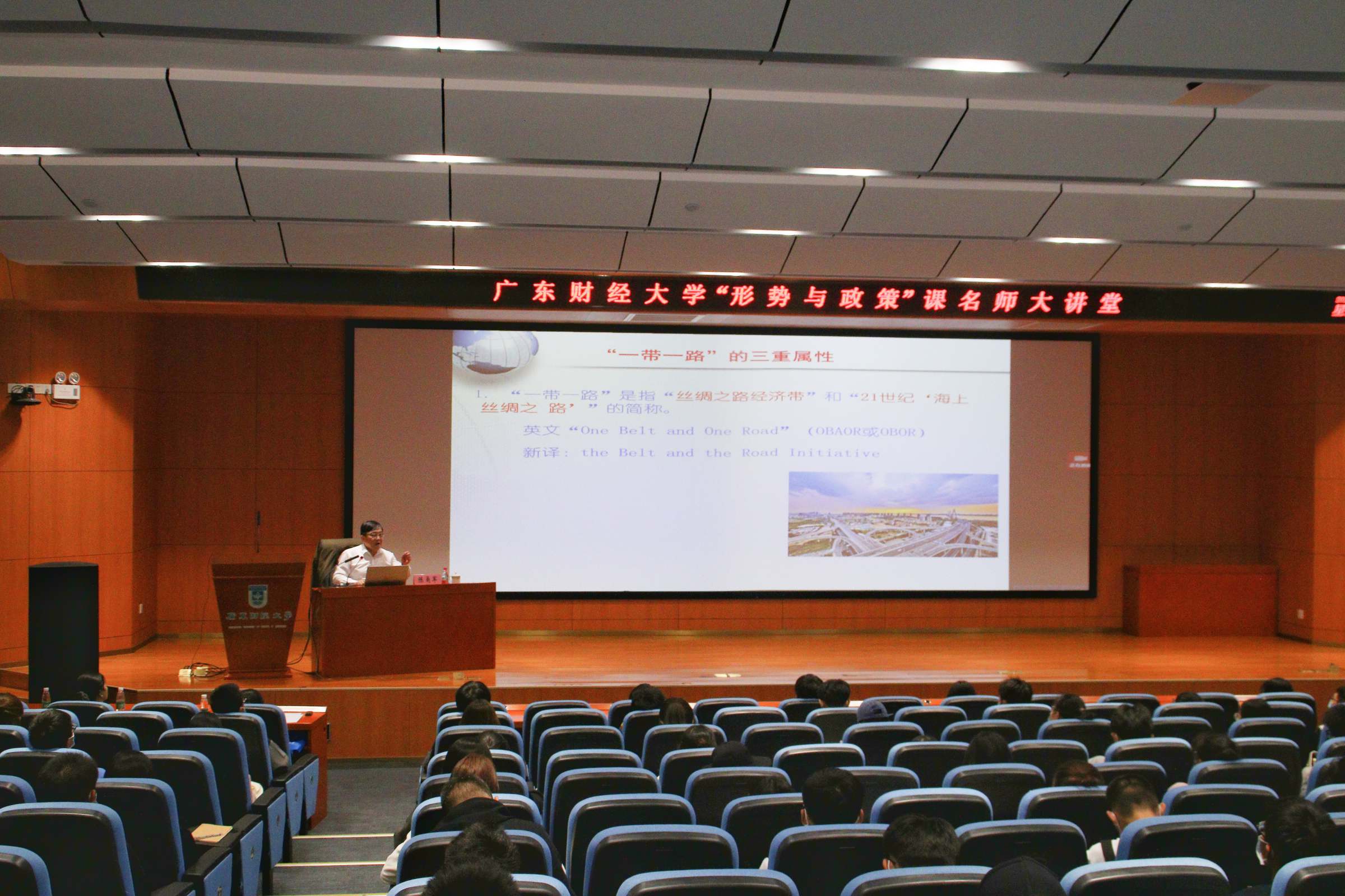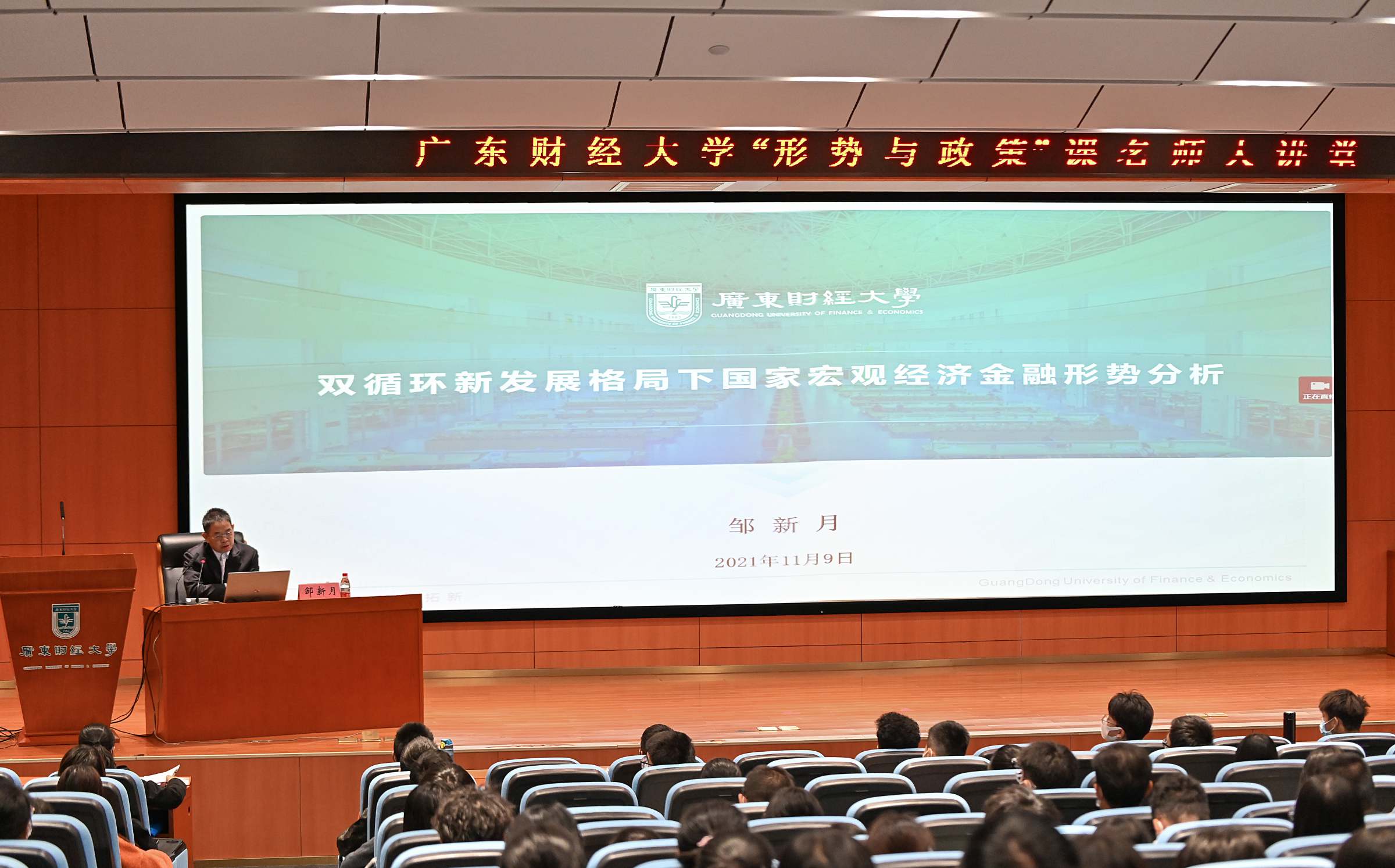 为进一步提升思政课教学质量和教学效果,本学期,我校进行“名师讲‘形势与政策’课”教学改革,推出授课新举措,校领导和名教授带头走上思政课讲台,讲授“形势与政策”课。11月9日下午,广东财经大学“形势与政策”课名师大讲堂第一讲在广州校区正心堂开讲。副校长邹新月和我校特聘教授、大湾区双循环发展研究院院长陈甬军,分两场在正心堂给本科生讲授“形势与政策”课,通过现场授课和网络同步直播的方式,实现两校区三个年级13000余名学生全覆盖同上一堂“形势与政策”课。