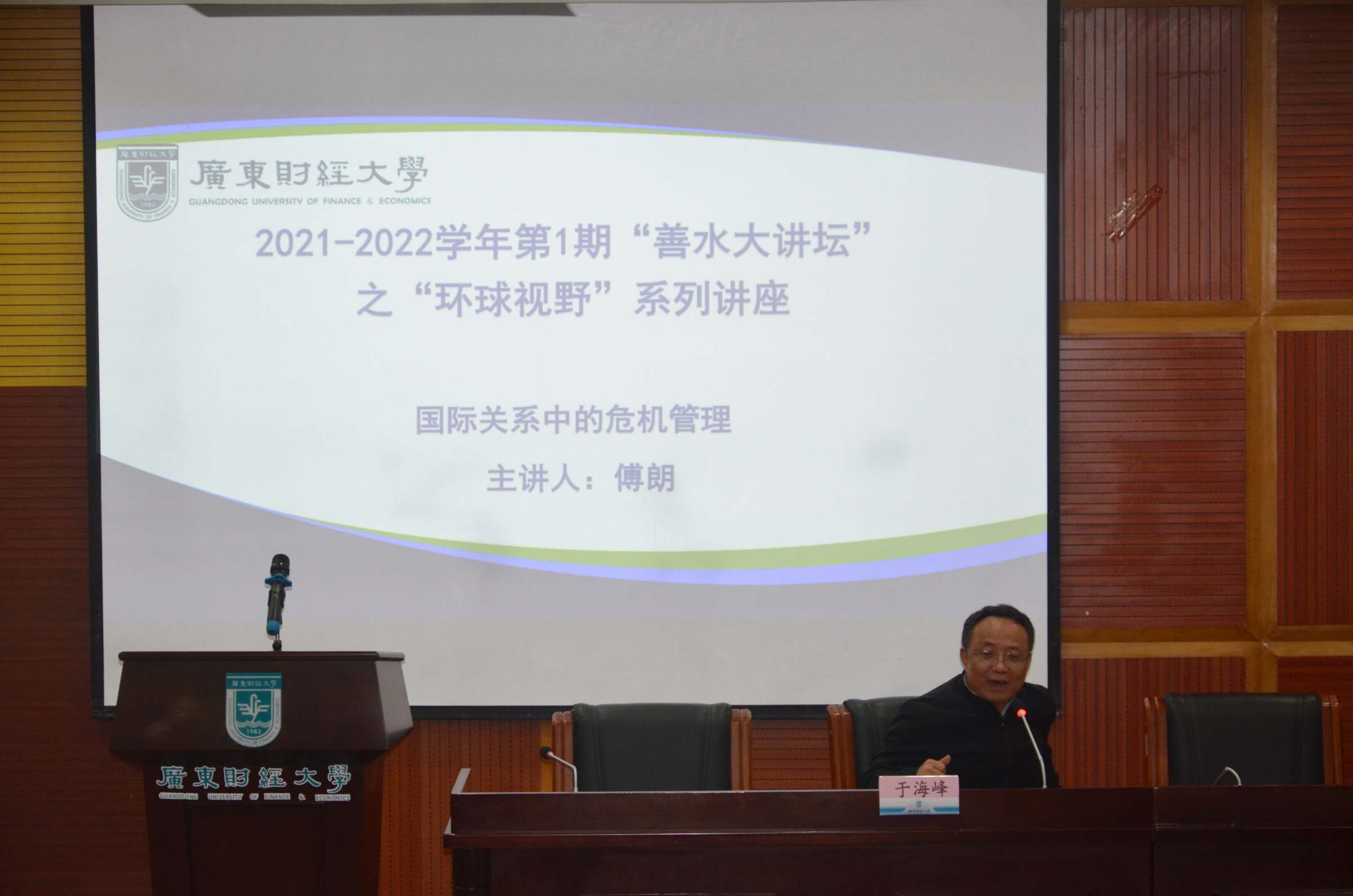 11月16日下午,2021-2022学年第1期(总第117期)“善水大讲坛”之“环球视野”系列讲座在佛山校区学术报告厅举行,校长于海峰主持讲座。广东公共外交协会常务副会长、广东省人民政府外事办公室原主任、广东国际战略研究院副院长、广东外语外贸大学非洲研究院院长傅朗教授主讲,题为《国际关系中的危机管理》。