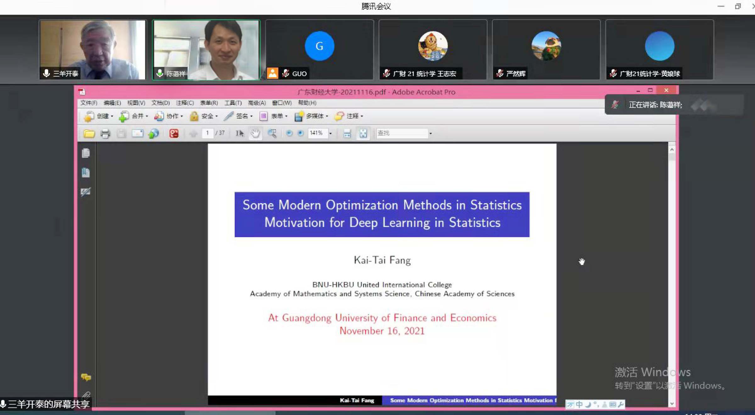 11月16日下午,北京师范大学--香港浸会大学联合国际学院、中国科学院应用数学研究所方开泰教授应邀为统计与数学学院师生做了一场主题为“Some Modern Optimization Methods in Statistics”线上学术报告。讲座由统计与数学学院郭影玲老师主持,副院长陈蔼祥、以及慕名而来的60位余名师生聆听了这场高水平的学术报告。