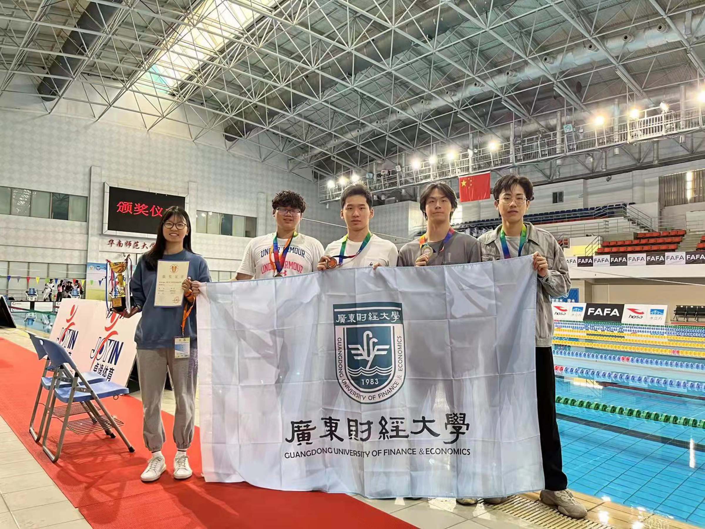 2021年广东省大学生游泳冠军赛于今年11月13日在华南师范大学(大学城校区)游泳馆举行。我校游泳队共有8名队员参赛,包括6名乙组队员和2名甲组队员,取得了14项好成绩。分别是:在大学乙B组比赛中,郑君行获男子100米自由泳第二名、50米自由泳第四名,鲍颉获男子200米蛙泳第三名、50米蛙泳第四名,黄喆获男子200米蝶泳第三名、100米蝶泳第四名,兰天哲获男子400米自由泳第三名、50米仰泳第八名,郑昕昀获得女子50米蛙泳第3名、200米蛙泳第4名,余帆获男子200米蛙泳第六名。甲组队员更是突破以往成绩,吴清瑶获女子50米自由泳第3名,陈欣获女子200米蛙泳第6名。