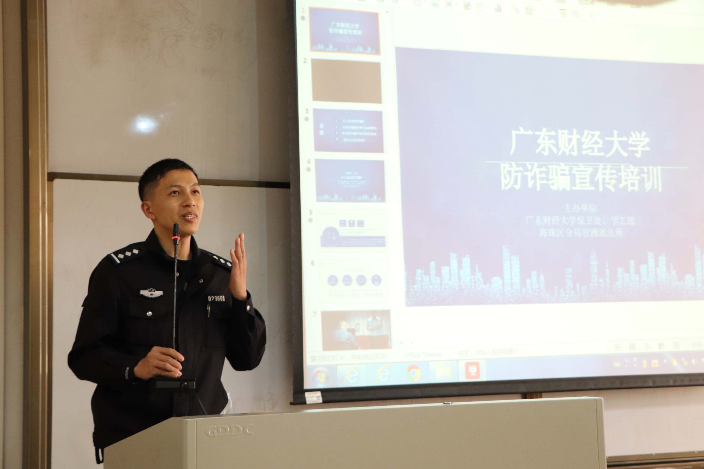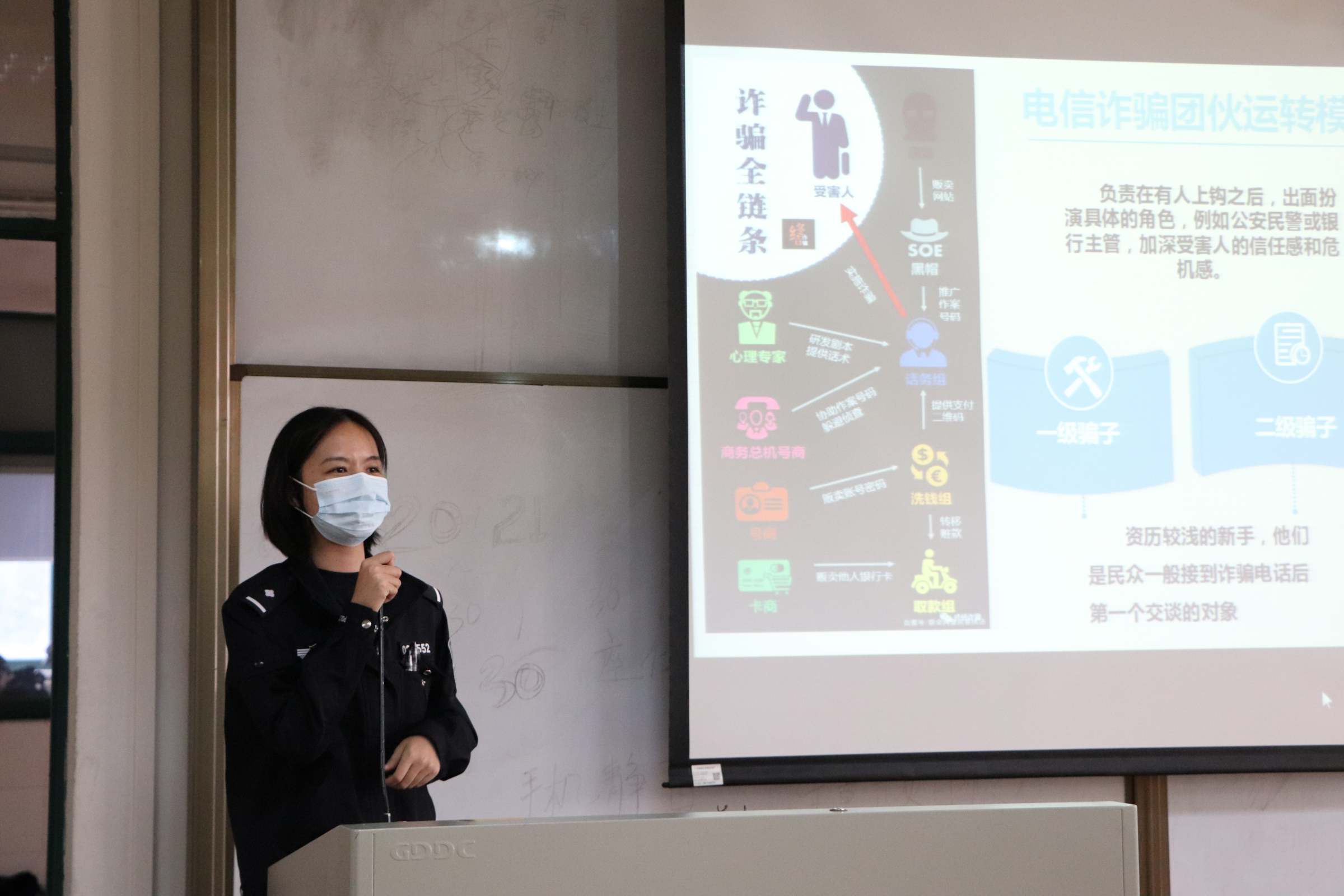 谢警官、唐警官分别以大量电信网络诈骗的案例说法,深入讲解什么是电信网络诈骗、分析电信网络诈骗境内外勾结的特点、不法分子常用的诈骗手法、新型诈骗伎俩的发展等知识。特别提示冒充客服、兼职刷单、虚假购物、游戏交易、“约爱”等诈骗方式为大学生群体中高发案类型,警醒同学们正视社会治安形势。两位警官还分享了他们跨境追捕诈骗犯罪嫌疑人的经历,同学们深受感动,体会到了警方工作的艰辛。大量活生生的案例让同学们清醒认识到当前高校人群已经成为蒙受诈骗的高发群体,理解了警方大力宣传和劝导群众下载国家防骗APP的苦心。