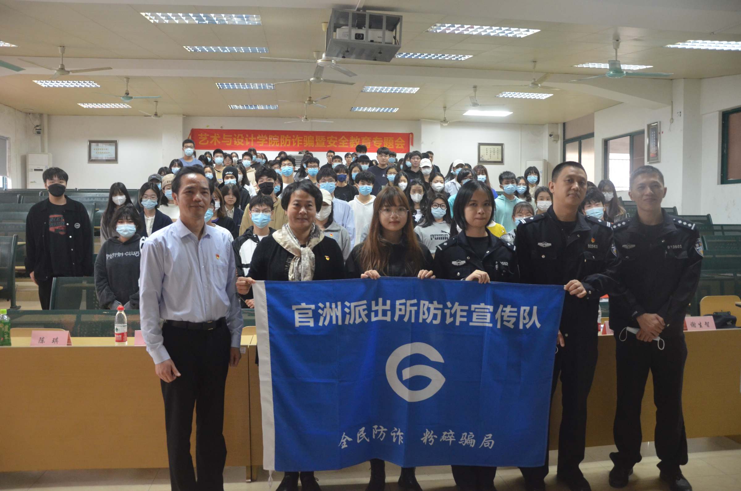 11月30日下午,艺术与设计学院携手官洲派出所干警在综合楼203教室开展防诈骗主题教育会,成立学院防诈骗宣传队,宣传和推广国家反诈中心APP。学院防诈骗志愿者、研究生、本科生代表以及辅导员老师120余人出席线下教育活动,并通过线上直播方式,组织全院师生参加学习。反诈民警谢警官、唐警官为全体师生授课。学院党委书记彭翠峰、副书记林强,官洲派出所所长刘海东出席活动。