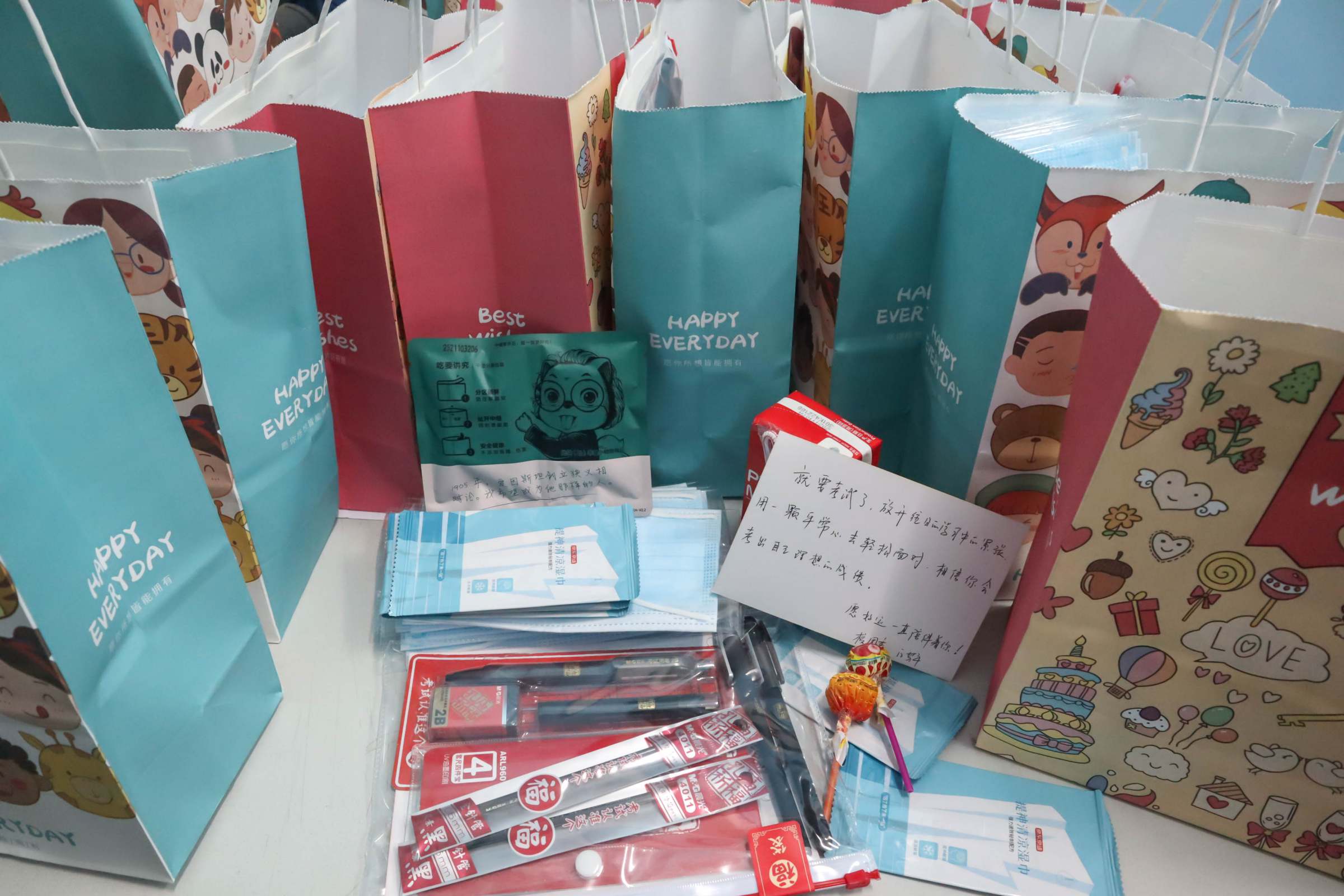 校学生会为考研同学精心准备了暖心助力用品,“金榜题名”文具福袋、“牛”气冲天牛奶、“坚”定信心坚果、“你最棒”棒棒糖、“全神贯注”提神清凉湿巾、“广财罩你”口罩……一件件寓意丰富、心意满满的物品装进了礼袋中。“当你拼尽全力,上天定不会辜负” “前途似海,来日方长” “要相信所有的努力定会有回报”“追风赶月莫停留,平芜尽头是春山”…… 学校老师、考研上岸师兄师姐、各学院师弟师妹亲手在卡片上写下祝福,用真诚温暖的话语为考研同学加油鼓劲。