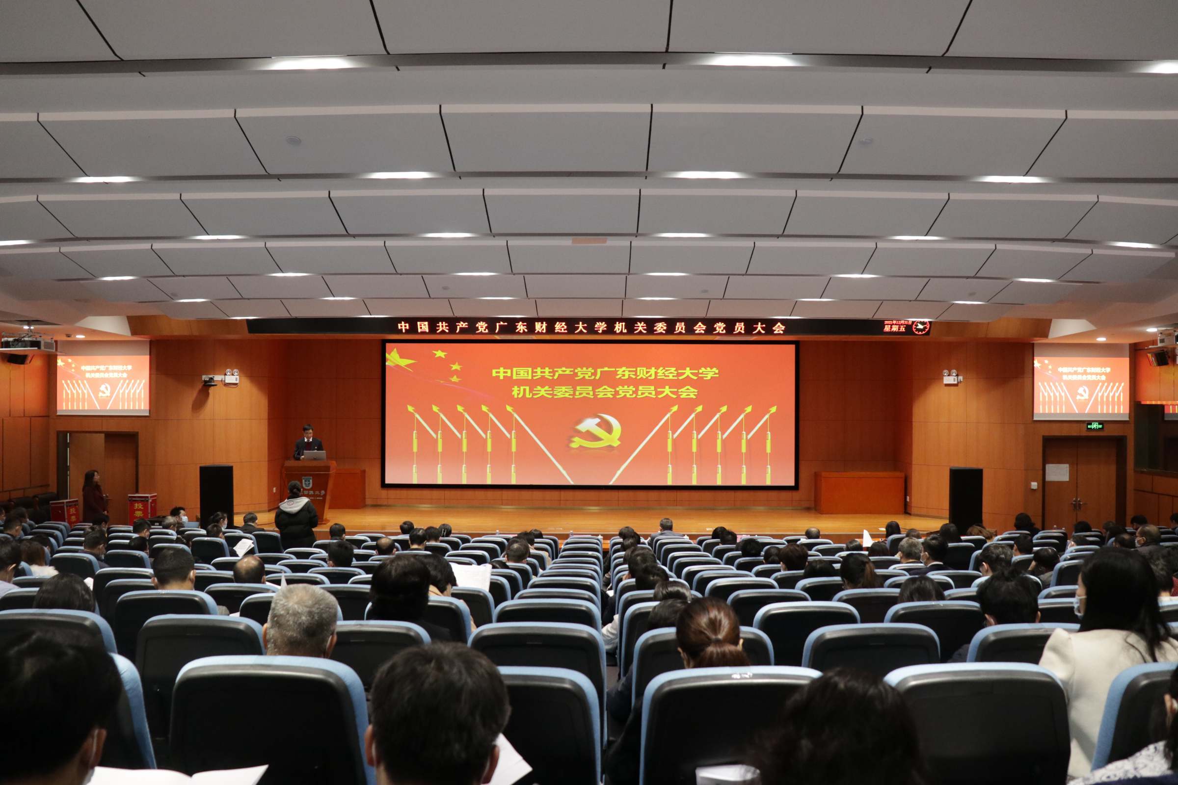 根据《中国共产党章程》《中国共产党普通高等学校基层组织工作条例》《中国共产党基层组织选举工作条例》等有关规定,经学校党委批准,12月31日上午,中国共产党广东财经大学机关委员会党员大会在正心堂召开,选举产生新一届机关党委委员。本次大会应到有表决权、选举权的党员243名,实到222名。校党委书记郑贤操,校长于海峰,校党委副书记、纪委书记陈树武,副校长陈国栋和丁友刚以普通党员身份参加会议。大会由机关党委专职副书记陈丽清主持。