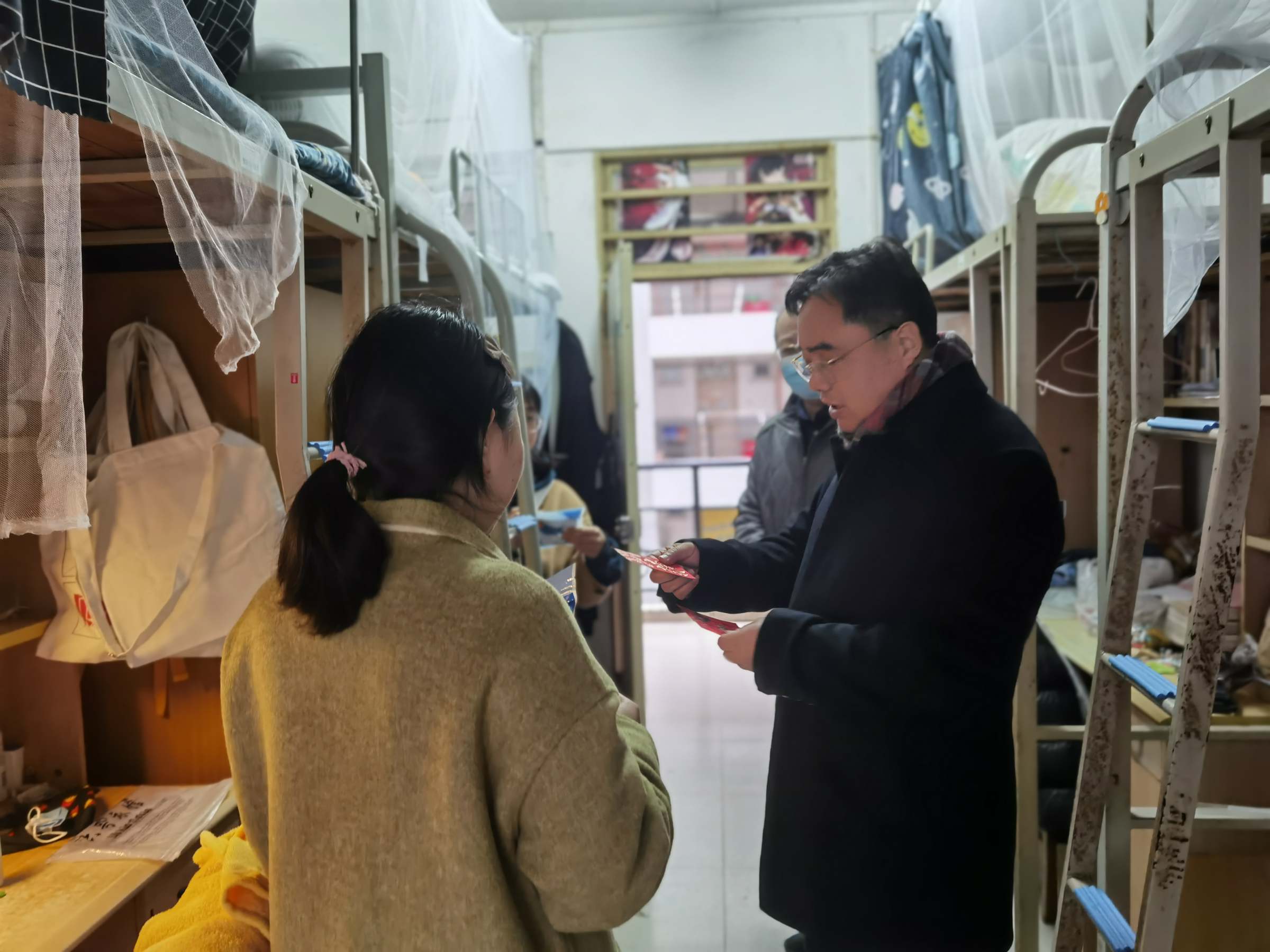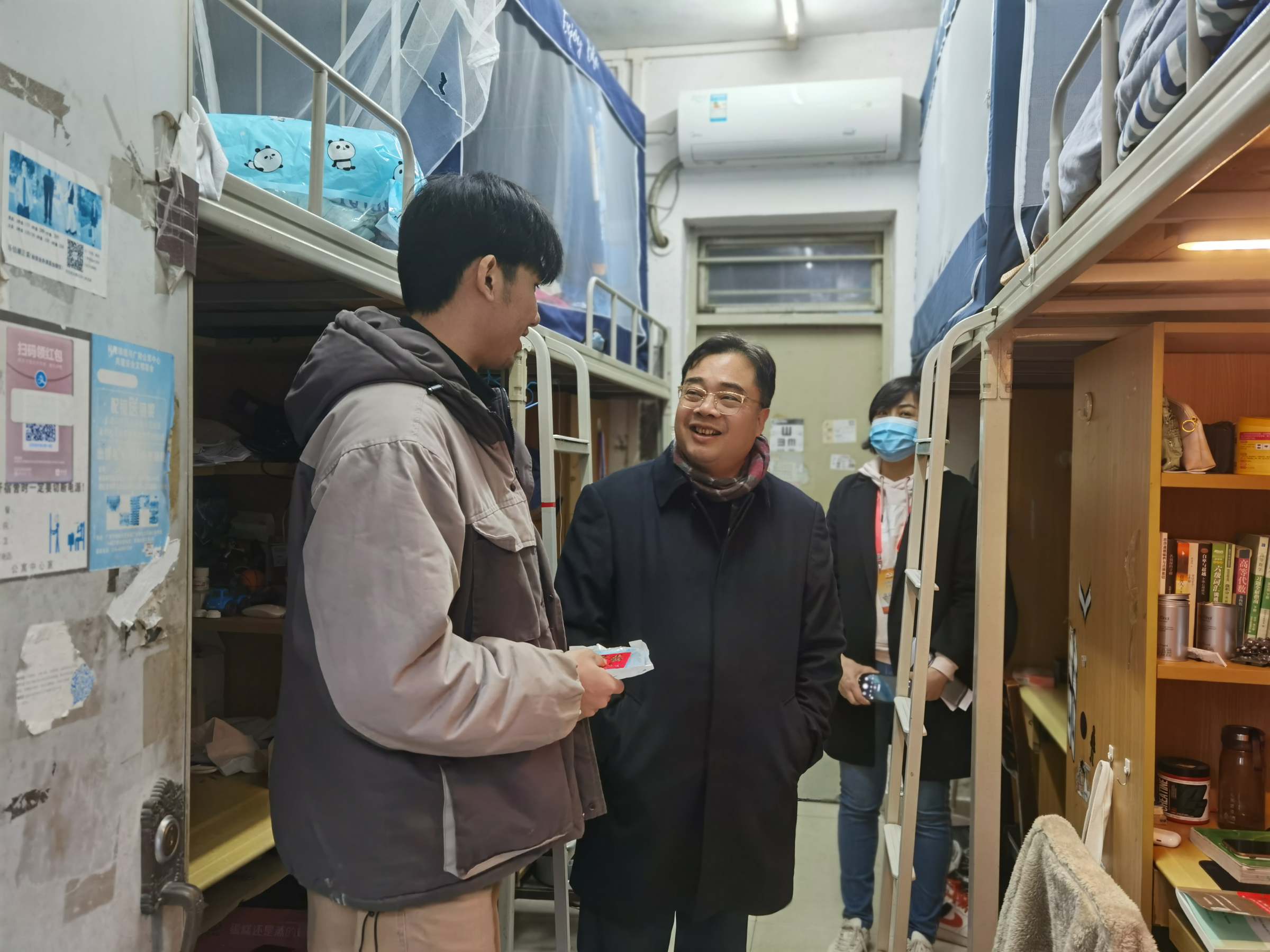 郑贤操一行深入学生宿舍,详细了解同学们的学习、生活情况以及假期安排,与同学们交流就业实习、雅思考试、司法考试等问题,同时也叮嘱大家要增强个人防护意识,尤其注意疫情防控,保持良好生活作息,加强体育锻炼,度过一个快乐充实的假期。