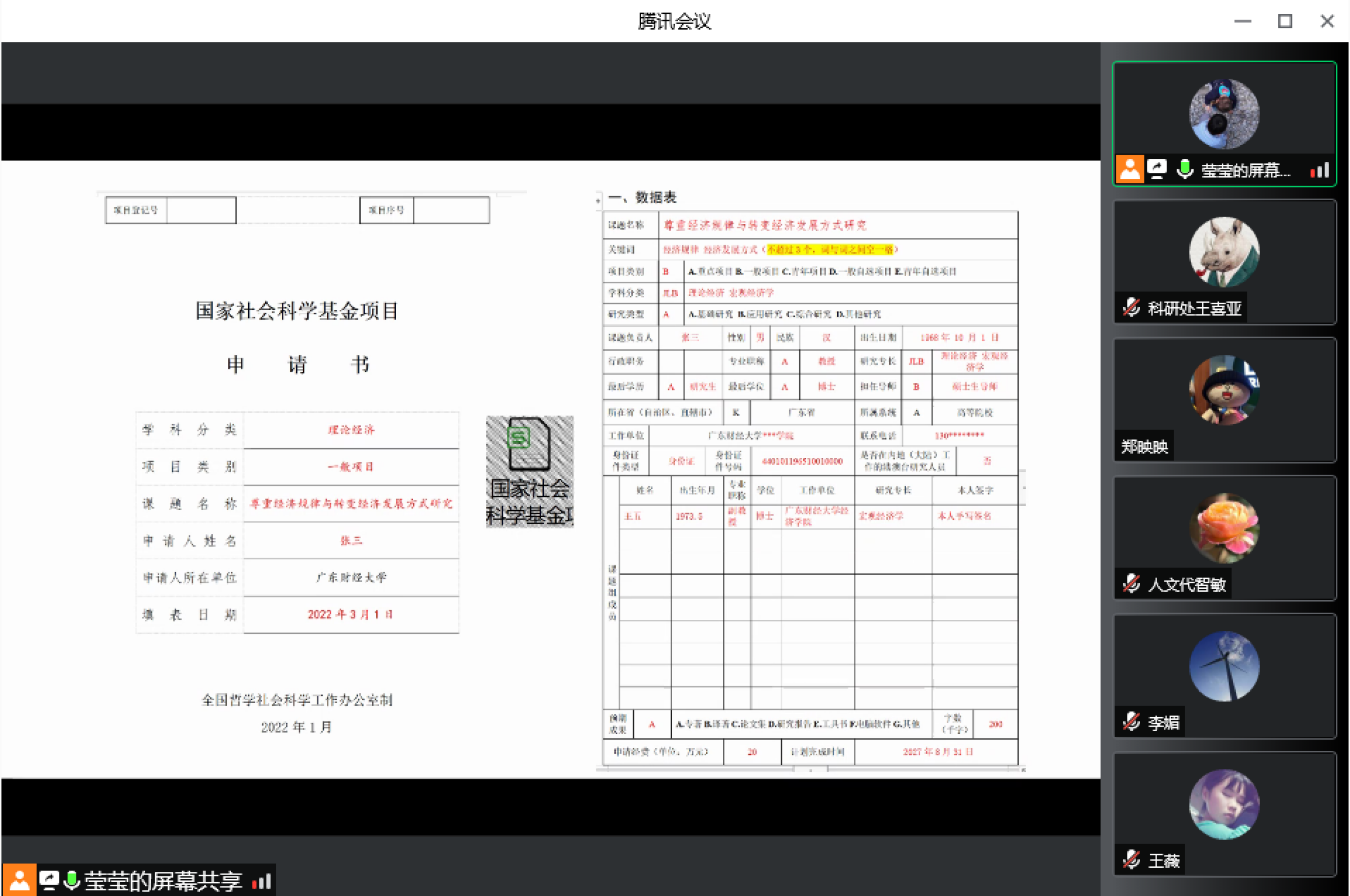 科研项目管理科科长崔晓莹就2022年国家社会科学基金项目、国家自然科学基金项目、教育部人文社科研究项目的申报书审核进行了专题辅导培训,说明了审核工作要求,分享了审核工作经验,并重点重申了科研诚信要求。