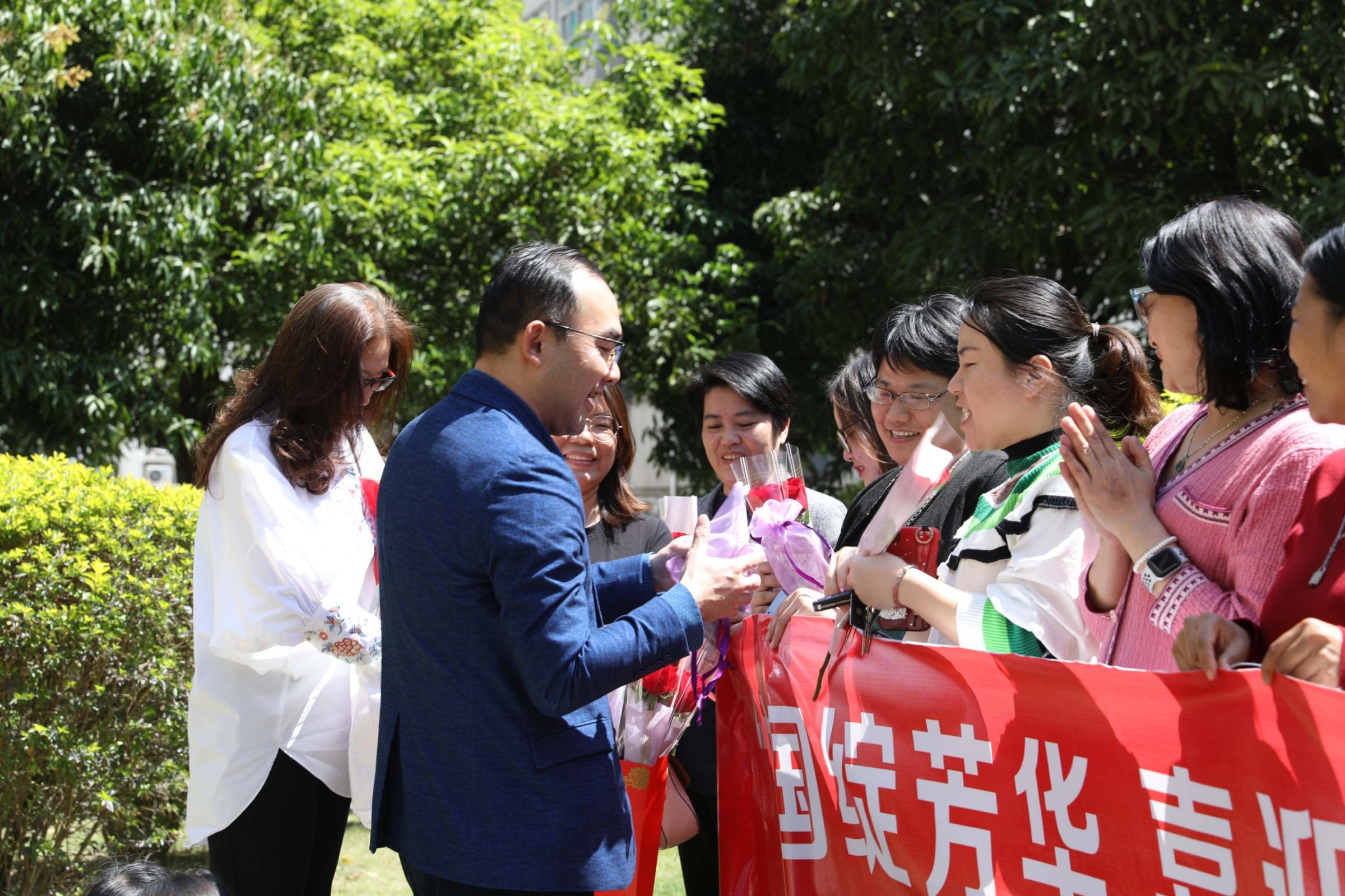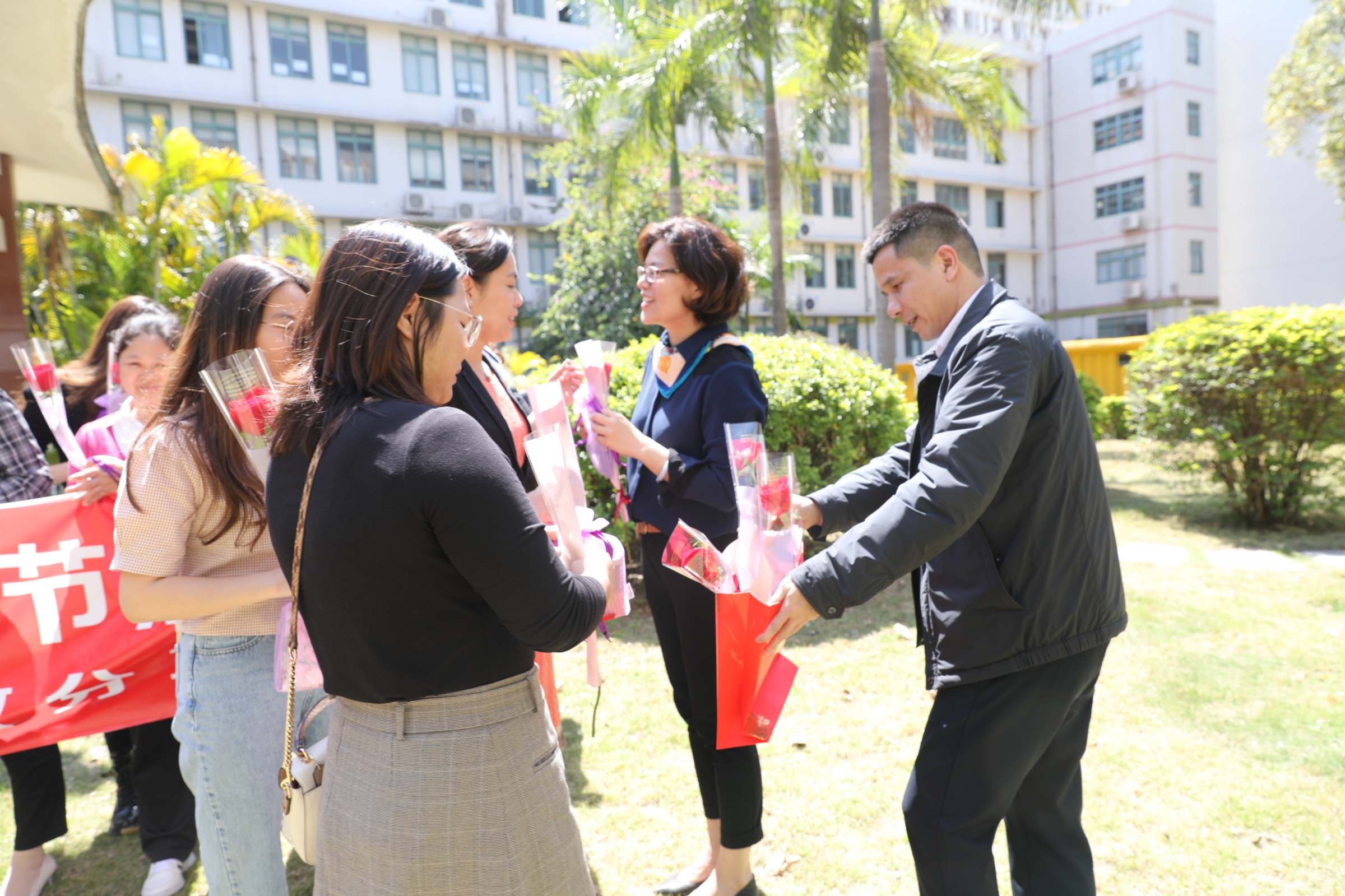 龚义荣、何雄卫代表联教分工会同级党组织,为女同胞们送上了玫瑰鲜花和节日祝福,传递党组织的关心关怀。