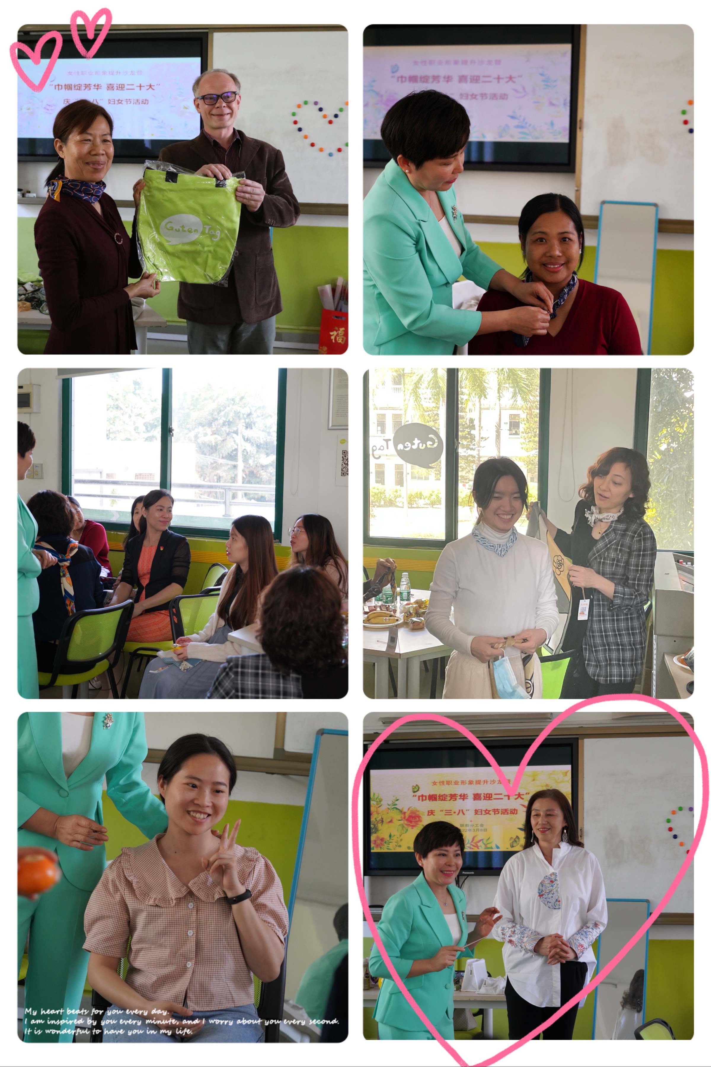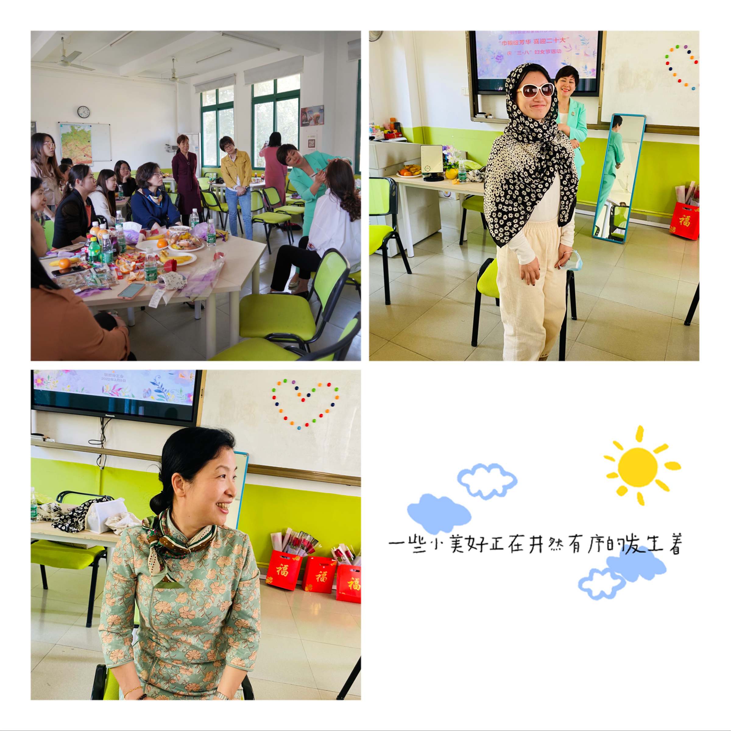 “老师,防晒和隔离哪个先用?”职业形象提升沙龙温馨现场,大家边品尝美味的茶点,边提出自己在实操中碰到的问题。礼仪培训师以点评现场女教职工的妆容,导入如何通过淡妆提升职业形象,以学员为模特进行描眉画眼演示,并围绕职业淡妆的步骤、技巧、误区进行讲解。在巧用丝巾环节,主讲老师在演示中讲解各式丝巾与衣服的搭配及各种丝巾结的打法。在主讲老师的巧手下,丝巾秒变“玫瑰”领结、“钻石”项链、沙滩裙、披肩、头巾……在丝巾的衬托下,学员愈显知性优雅、端庄大方、美丽自信。“我这个一字结打对了吗?”“怎样才能抖出这么漂亮的蝴蝶结?”……大家交流互动,现场气氛轻松愉快,欢声笑语一片。“你们好!节日快乐!”歌德语言中心德方主任福马鼎先生来到沙龙活动现场,送上节日祝福。