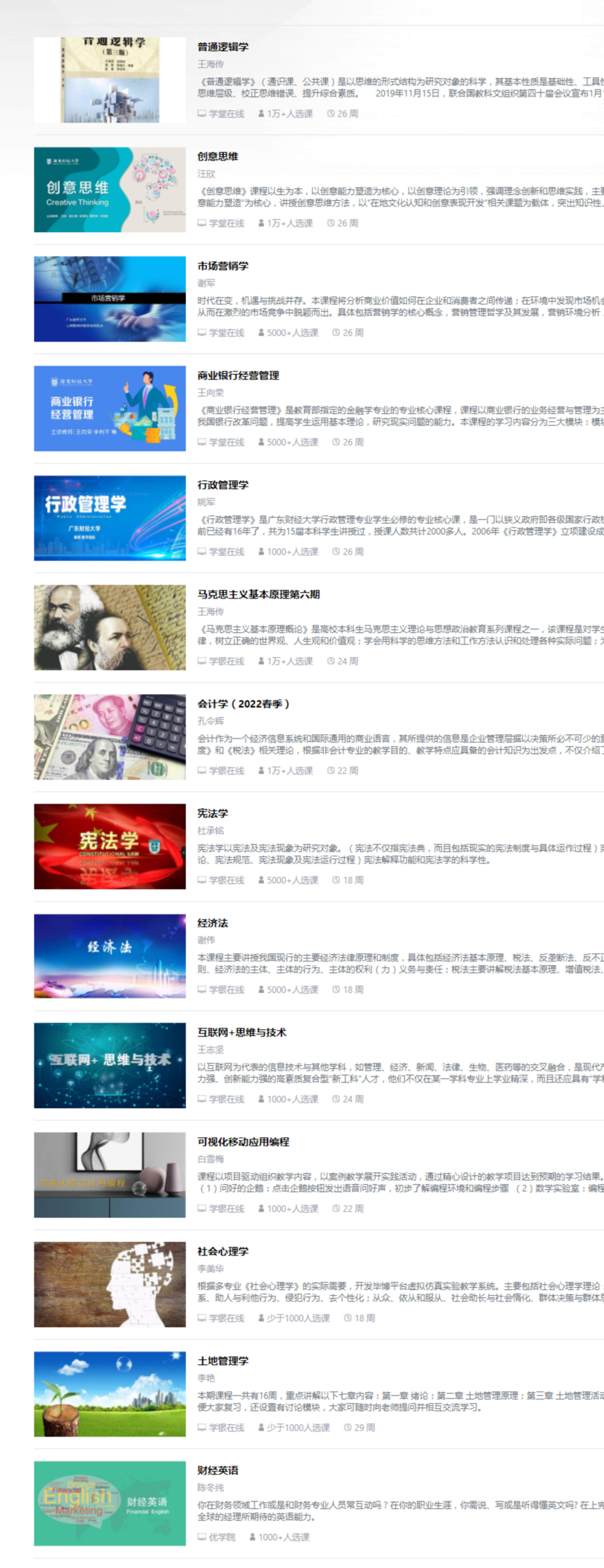 我校共14门高水平课程上线国家高等教育智慧教育平台,分别是:《普通逻辑学》《创意思维》《市场营销学》《商业银行经营管理》《行政管理学》《马克思主义基本原理》《会计学》《宪法学》《经济法》《互联网+思维与技术》《可视化移动应用编程》《社会心理学》《土地管理学》《财经英语》。