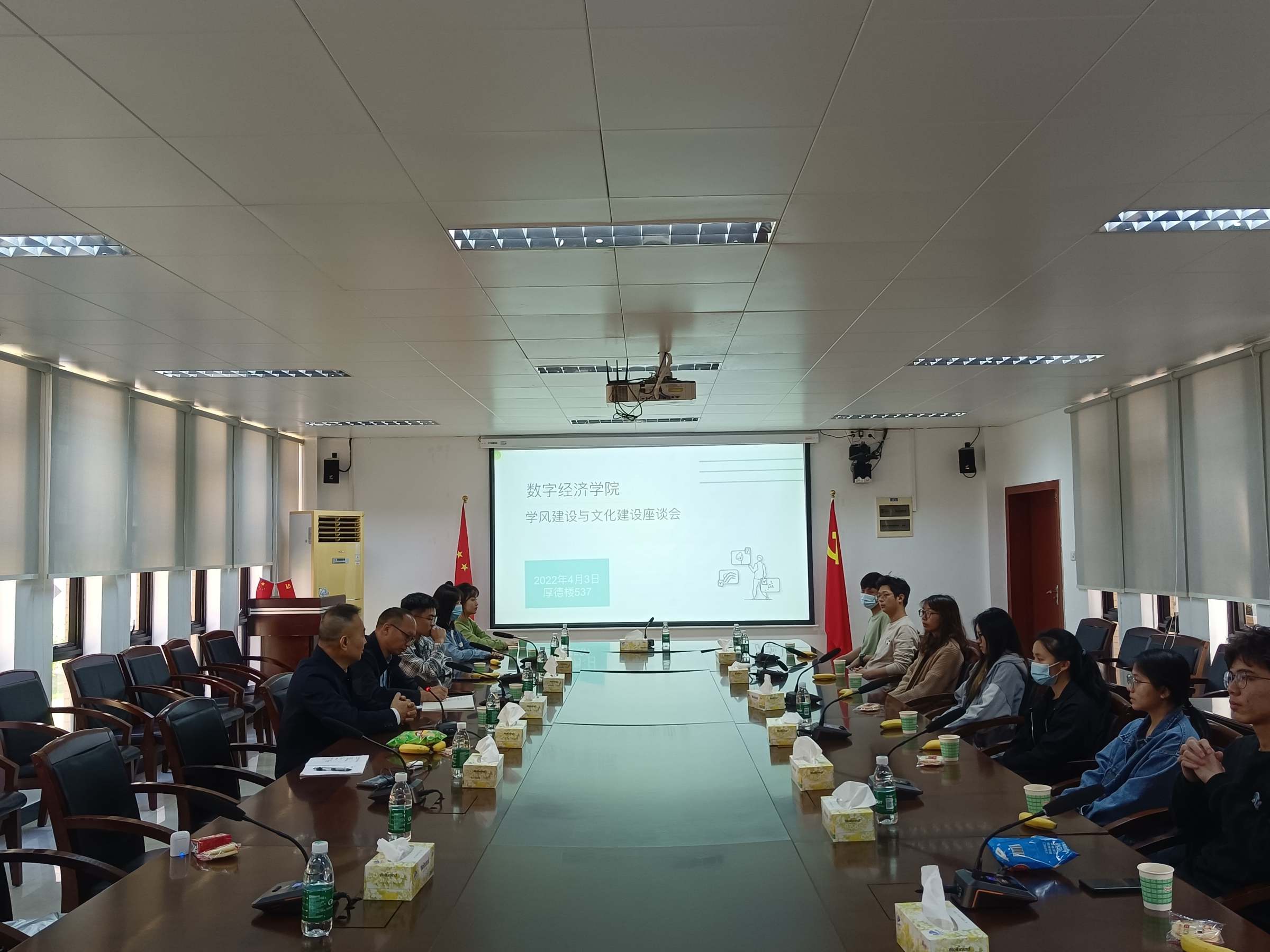 4月3日上午,清明假期的第一天,数字经济学院在厚德楼237会议室召开学风建设与文化建设座谈会。校党委常委、佛山校区管委会主任王伟作为2021级大数据管理与应用1班的联系党委常委参加座谈;学院党委书记李恩华、辅导员钟程凯和2021级学生代表参加活动。座谈会由李恩华主持。