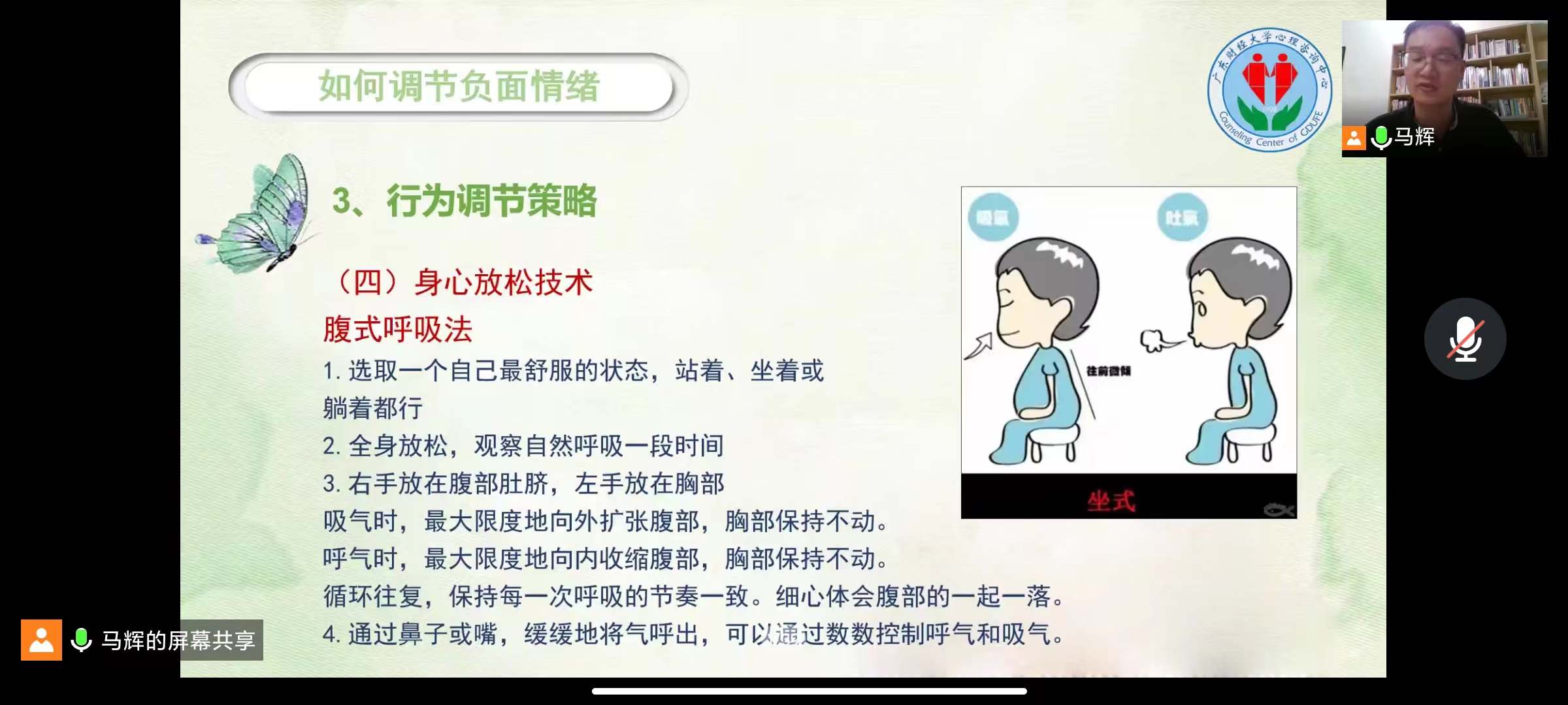 讲座由门诊部心理咨询中心马辉老师主讲。马老师首先与同学们探讨了疫情期居家可能产生的消极情绪,然后讲述了如何从情绪调节、认知调节、行为调节和社会支持四个方面保持良好的情绪状态,并演示了简单有效的放松训练。最后的讨论环节,马老师还对同学们提出的心理困惑进行了解答。