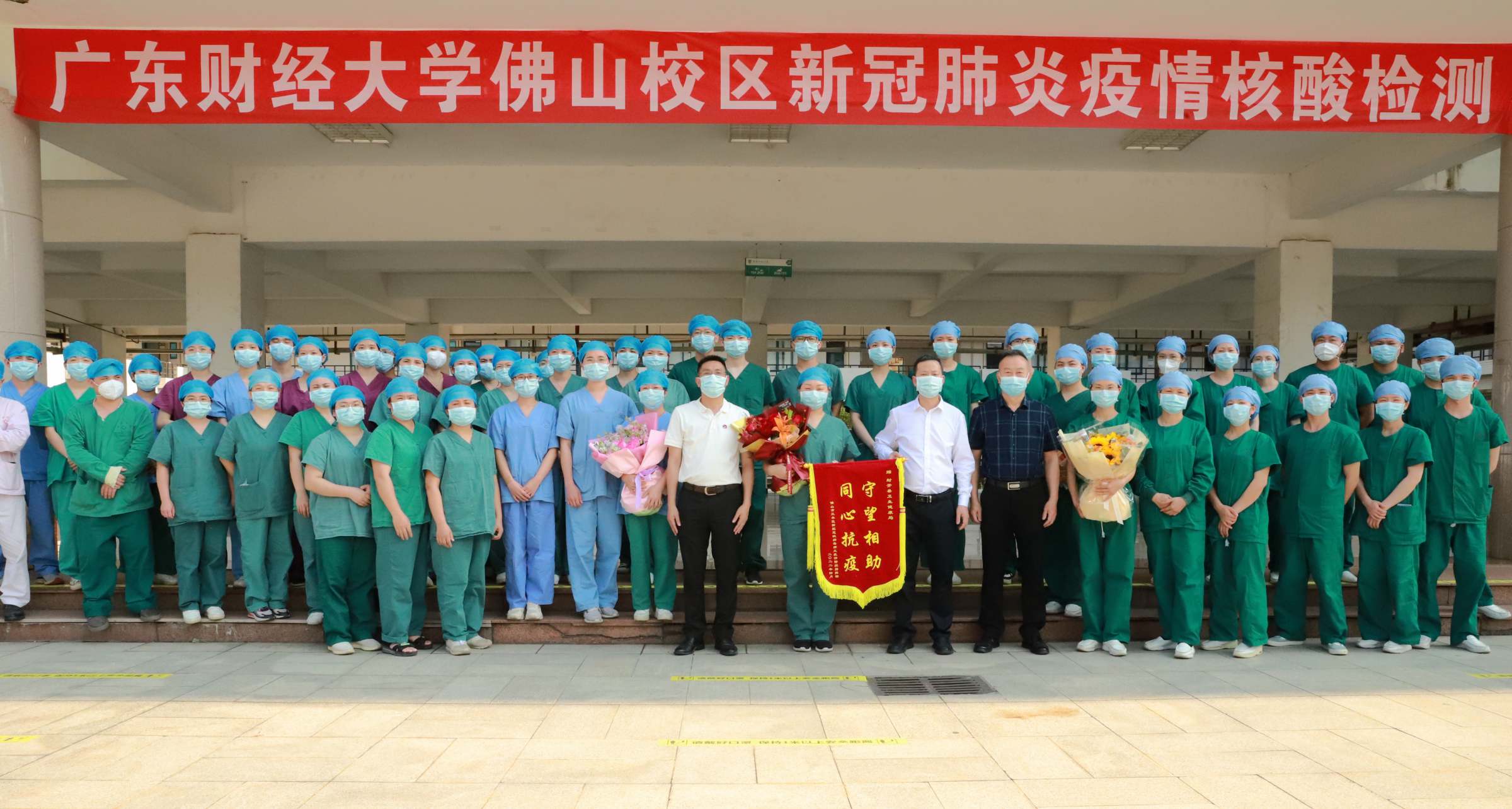 本次核酸检测从上午9点45分持续到中午2点15分,共计核酸13095人。核酸工作结束后,三水区委常委吴可望、云东海街道办书记刘勇海和王伟一起为驰援此次核酸检测的肇庆市封开县医疗队伍赠送“守望相助、同心抗疫”锦旗,表示诚挚谢意。