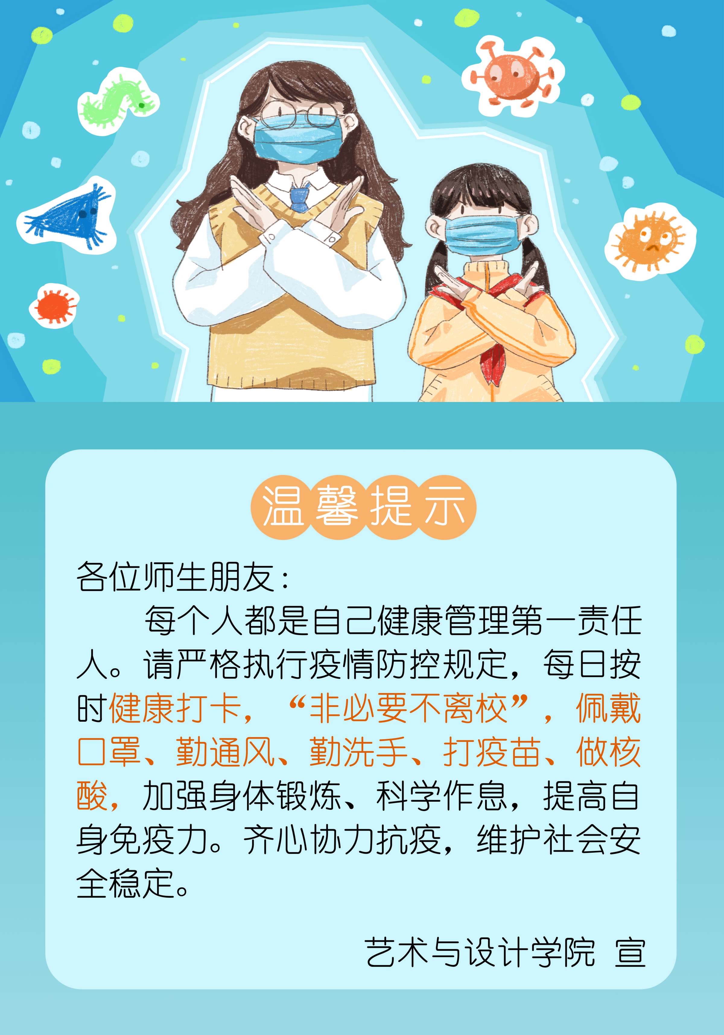 为进一步做好封闭管理宣传和思想教育工作,开学以来,艺术学院多形式多渠道开展防疫宣传教育和督导工作:建立师生志愿者先锋队,开展封控应急物资配送演练以及核酸检测等相关志愿服务工作;组建舍长工作群,党委副书记组织召开舍长工作动员会议,宣传防疫政策,解读管理文件;学院领导、老师和志愿者全面深入学生宿舍派发宣传单,加强日常防疫管理,打通防疫信息传导最后一公里;封闭管理期间,党委副书记与辅导员驻守学校值夜,巡查校园劝导缺乏自律的人群严守防疫措施,深入宿舍了解网课状况;为营造良好宣传氛围,专门设计橱窗防疫宣传海报;把“抗疫主题”植入设计专业课堂,专业教师指导同学们开展防疫视觉设计,提升个体防疫意识;学院团委将“抗疫精神”教育纳入第二课堂成绩单实践项目,组织党团员志愿者走进教工宿舍区开展“学雷锋爱国卫生志愿服务”活动,为群众办实事,厚植爱国爱校思想。