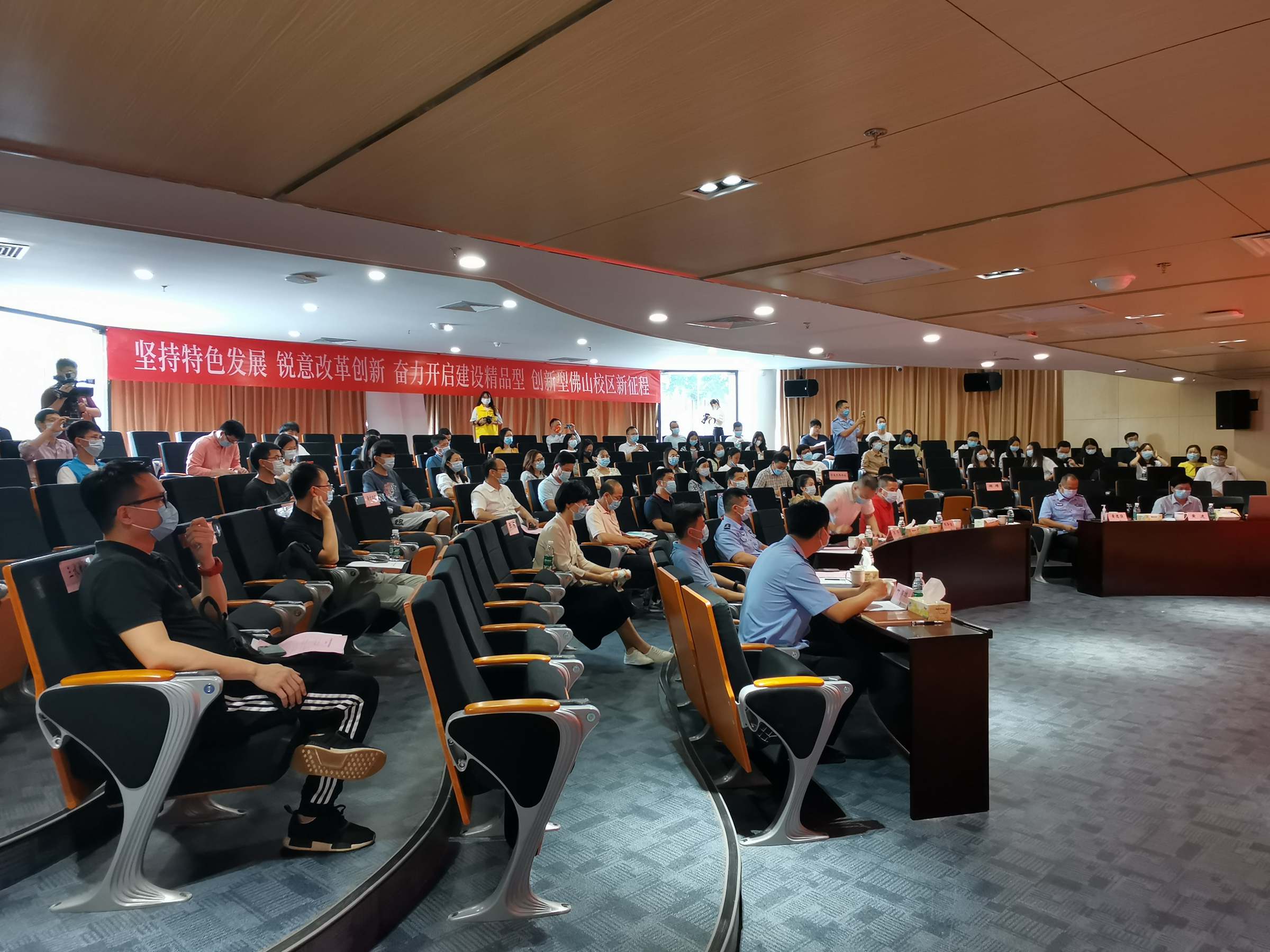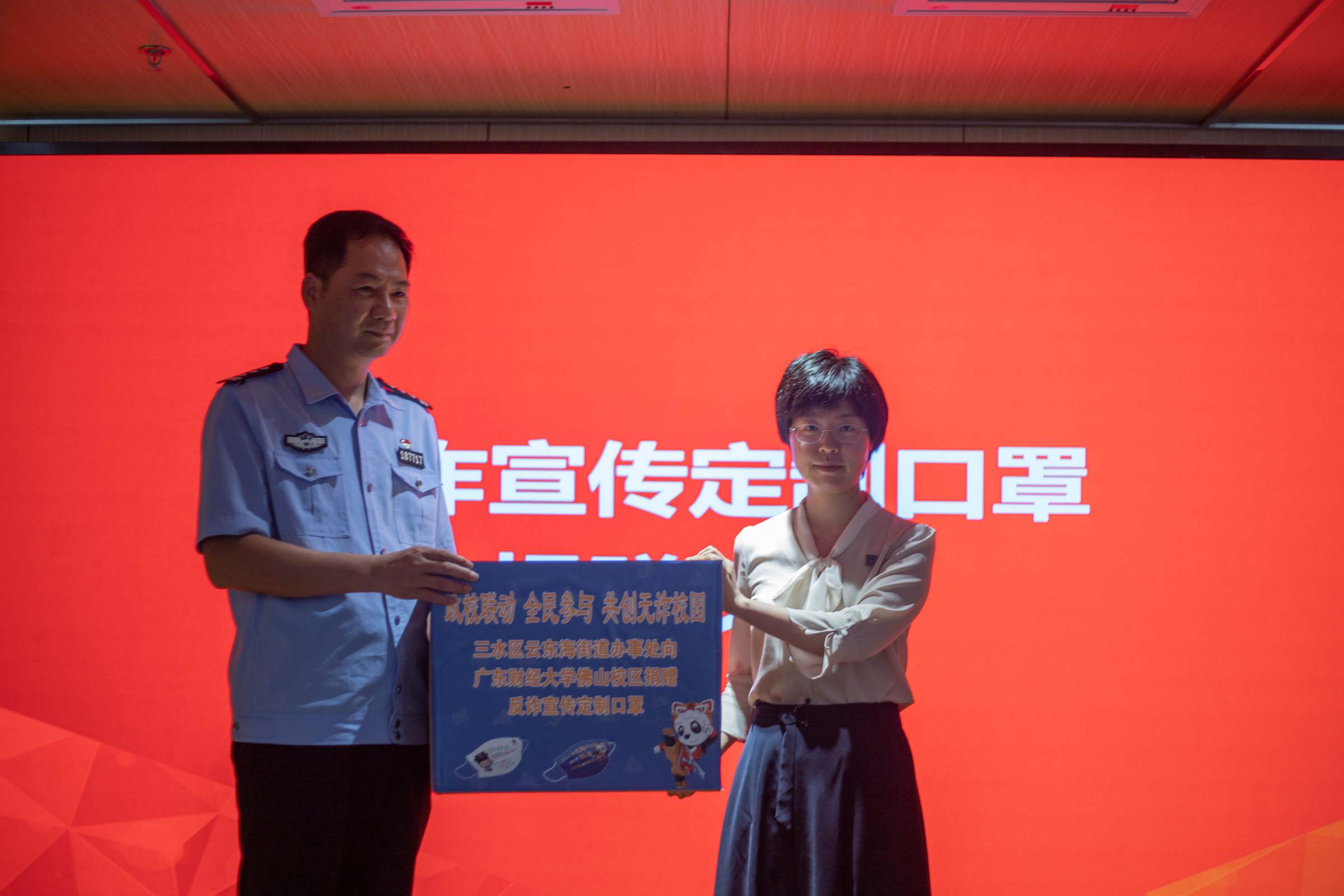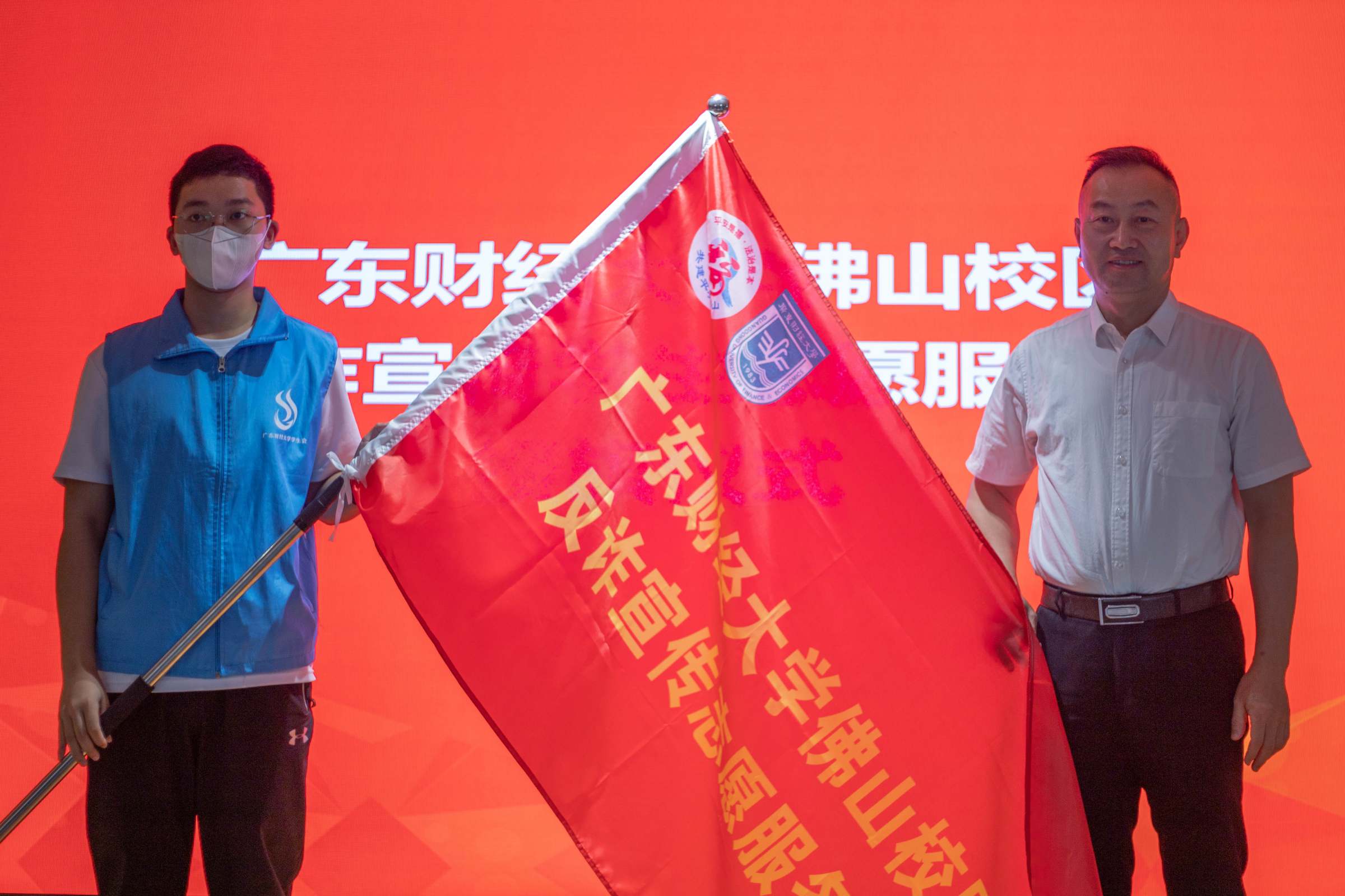 会议还举行了广东财经大学佛山校区反诈宣传学生志愿服务队授旗仪式和反诈宣传定制口罩捐赠仪式。