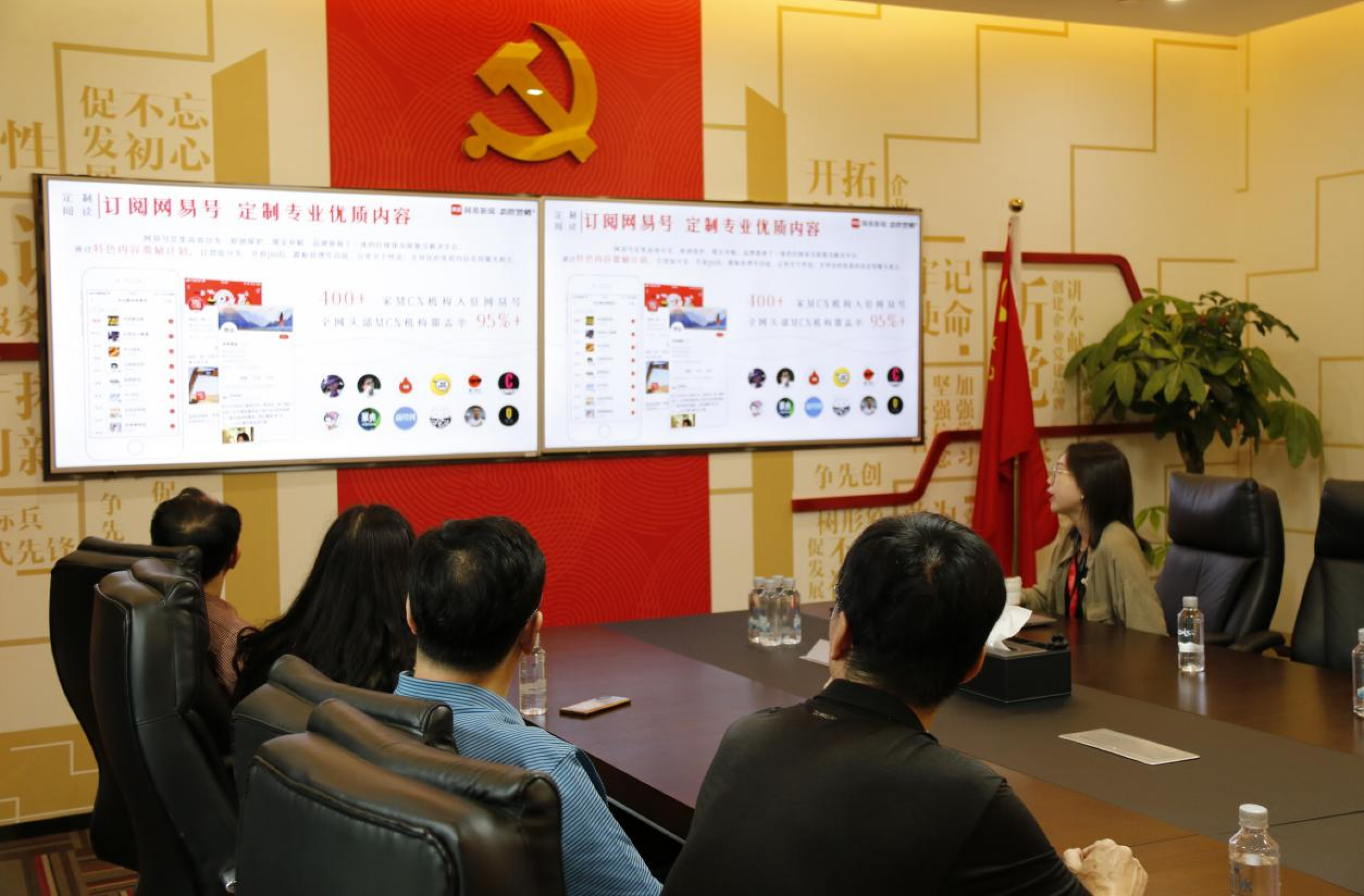 参观结束后,双方座谈交流。会上,工作人员介绍了网易新闻客户端平台及其营销优势,突出网易新闻内容为主、态度营销、跟贴文化等特色优势,特别是以全景咨询、定制阅读、内容社交为特点的社交功能,并通过网易未来大会等项目介绍网易营销项目内容在影响力、深耕力、知识力、互动力、传播力等方面的建设成果,以及网易云音乐的基本情况、现有成就及营销内容等。