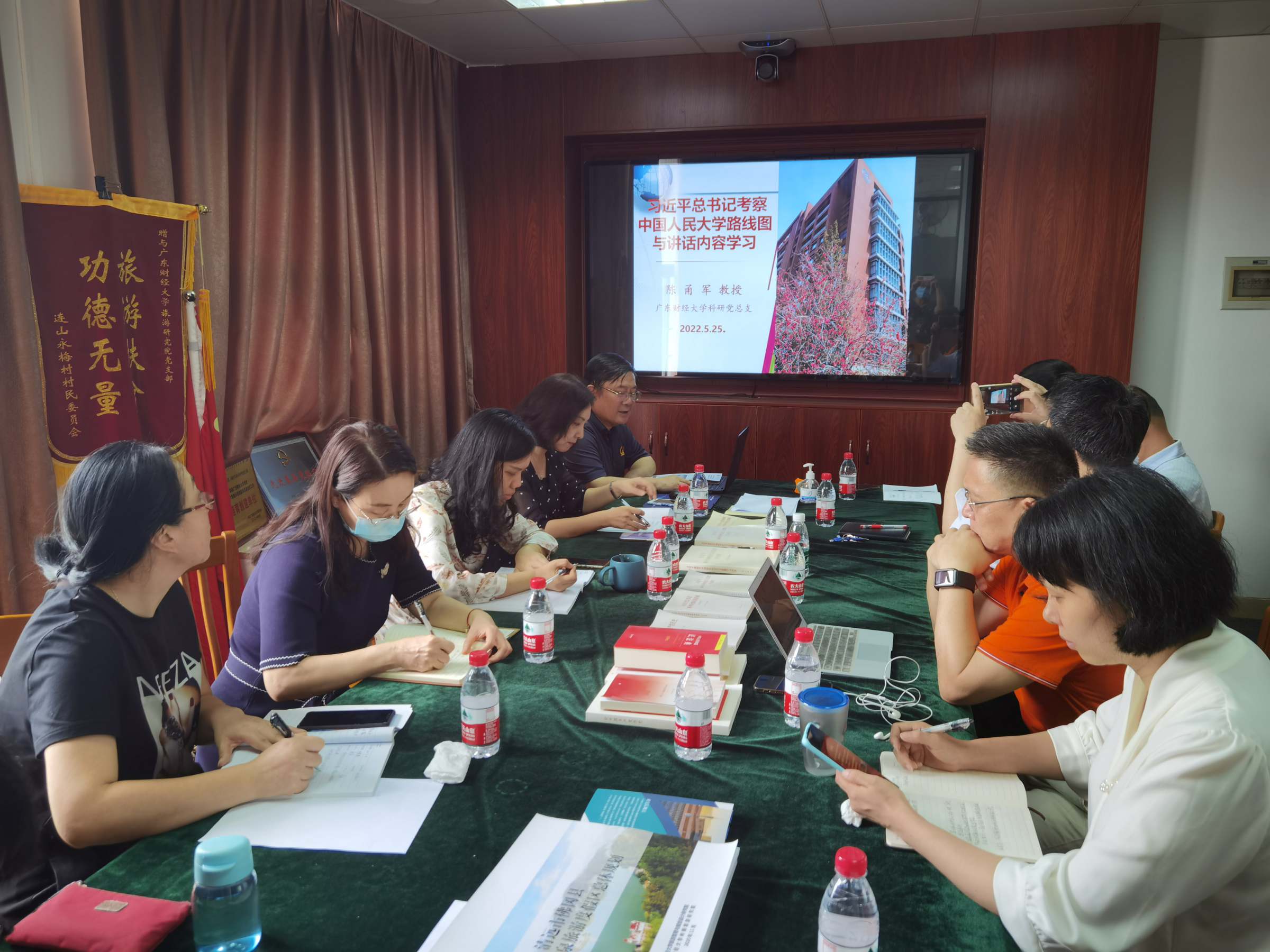 5月25日上午,中国人民大学商学院教授、广东财经大学大湾区双循环发展研究院院长陈甬军在综合楼813为科研党总支的党员师生讲授主题为“深入学习习近平总书记考察中国人民大学重要讲话精神”的党课。本次活动由科研党总支主办,大湾区双循环发展研究院党支部和岭南旅游研究院党支部承办。党课采取线上线下相结合方式举行,党总支纪检委员兼保卫委员、大湾区双循环发展研究院党支部书记矫萍主持。