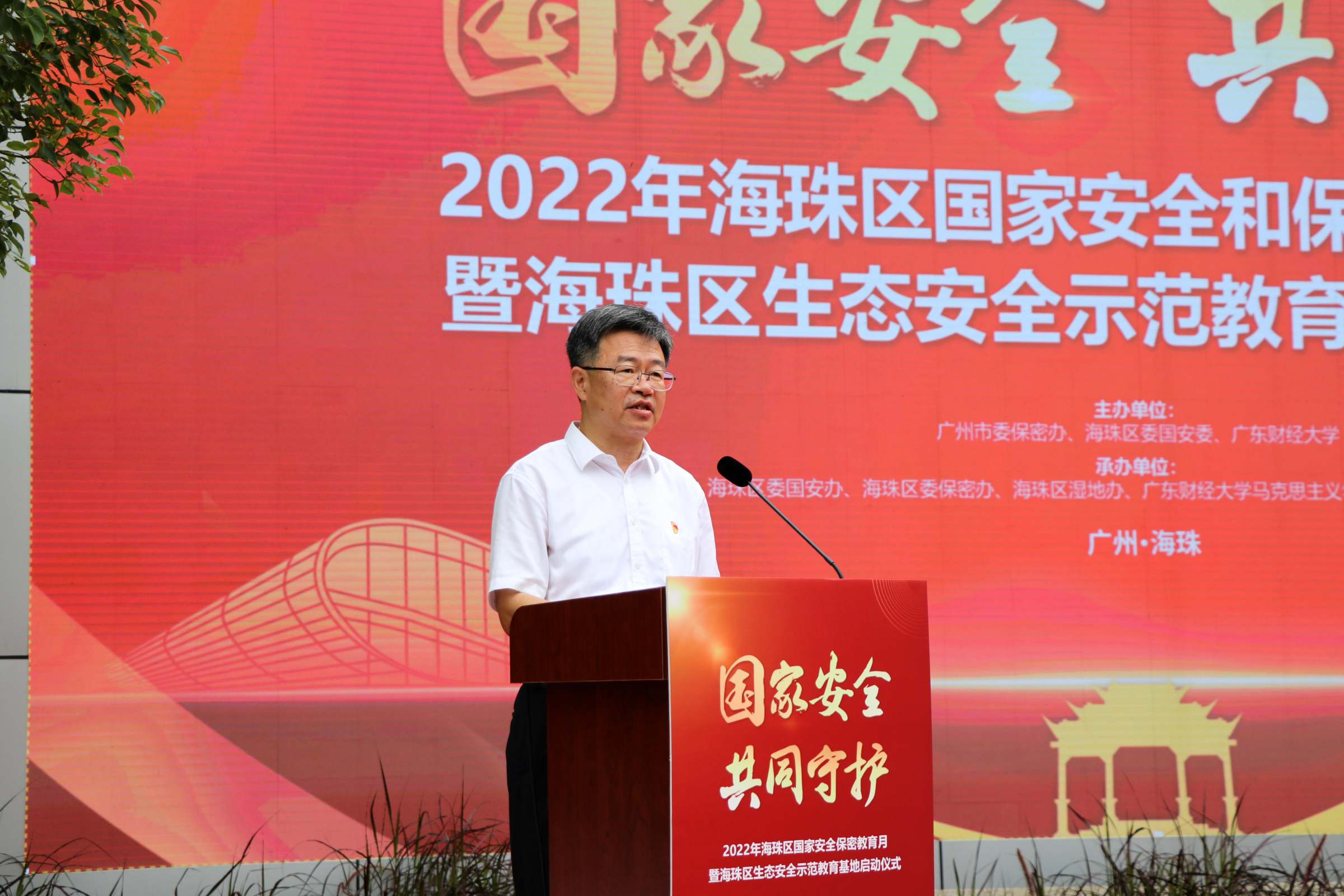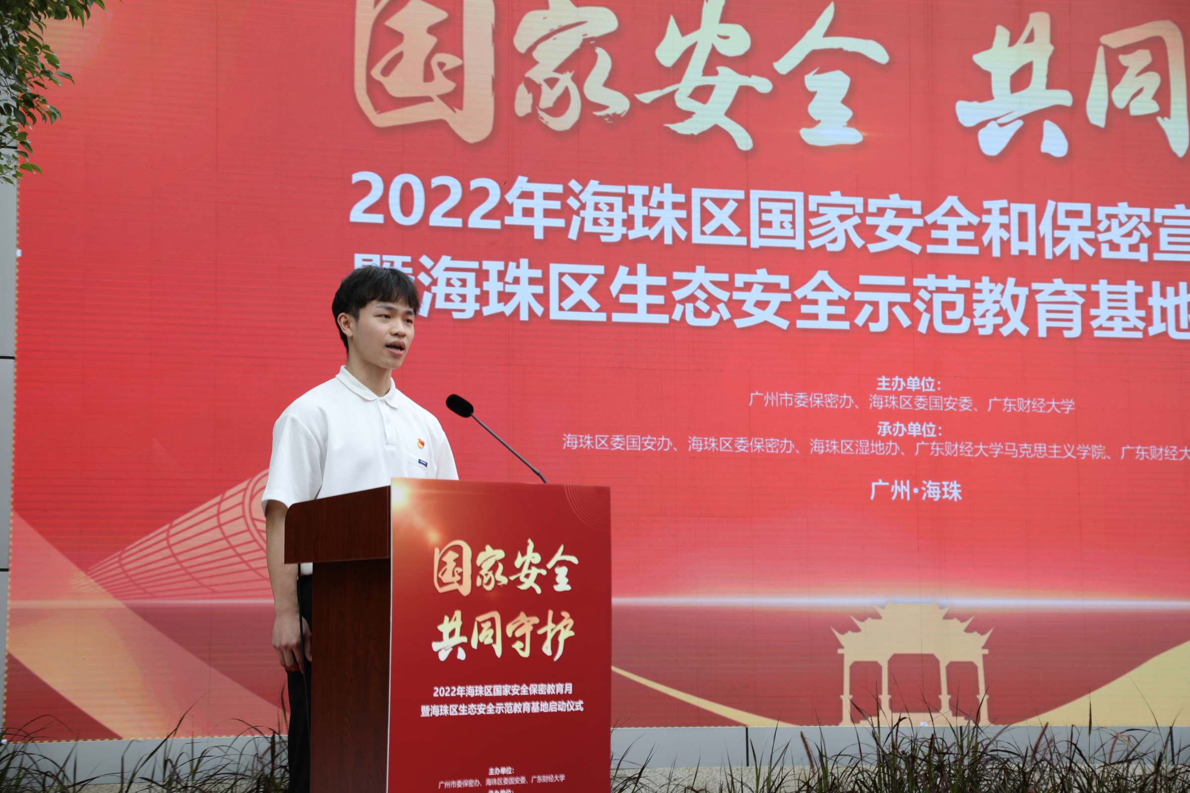 陈永宏在致辞中表示,近年来,海珠区坚持统筹好发展和安全两件大事,坚定不移推动城区高质量发展,不断在国家安全和保密宣传等领域取得新进展、新成效,感谢市委保密办、市委国安办对海珠区一直以来的关心支持和广东财经大学的大力配合。他表示组织开展海珠区国家安全和保密宣传教育月活动和建设海珠区生态安全示范教育基地,既是海珠区贯彻落实总体国家安全观的创新举措,也是着力加强保密宣传教育的生动实践,更是依托于海珠湿地生态优势、广东财经大学人才优势,实现资源互补、强强联合的校地合作。将以此为契机,进一步强化全民国家安全意识和保密意识,坚决筑牢国家安全和保密工作的钢铁长城。