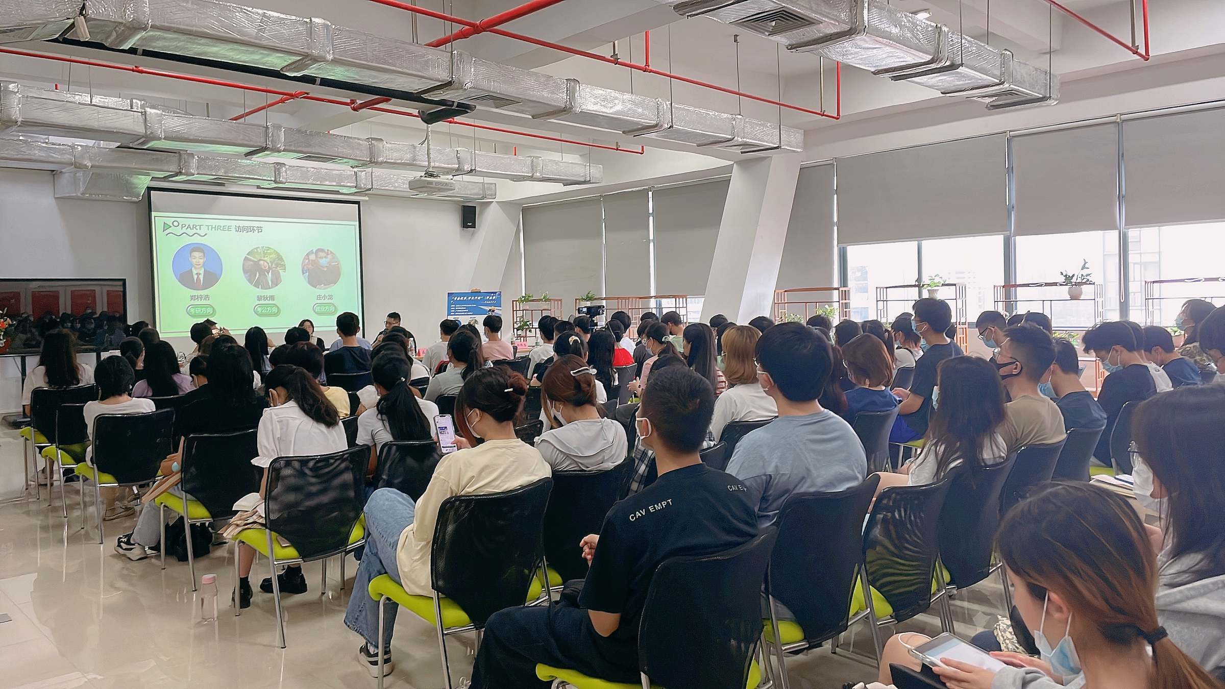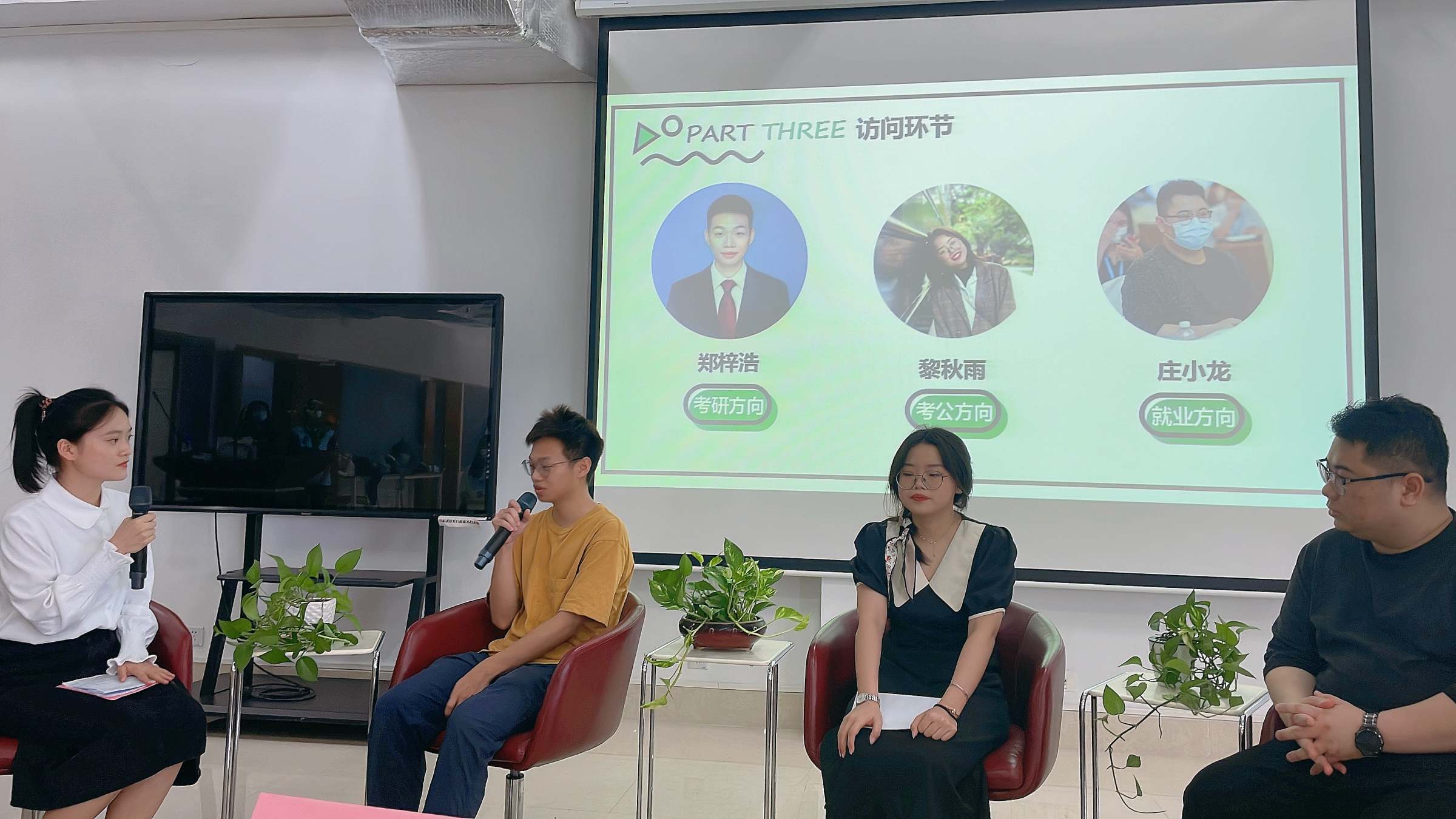 活动以访谈形式,围绕考研、考公、创业、就业等主题展开,涉及如何选择就业方向、考研考公复习经验与建议、备考时间安排、心态调整、实习经历、简历制作、面试技巧等。三位嘉宾与同学们热烈互动交流,同学们纷纷提出了一些现实中遇到的比较困惑的问题,三位嘉宾有针对性地一一解答。