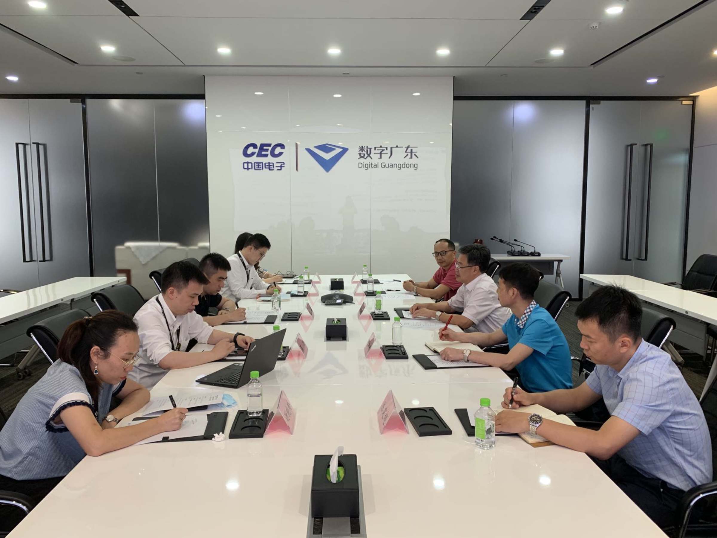 参观结束后,双方座谈交流。高晶详细介绍了数字广东公司的建设情况,指出公司目前急需懂技术、懂业务、懂公关、懂运营的人才;韦力从成立背景、企业概况、业务介绍、生态理念4个方面介绍数字广东公司的基本情况;张晨介绍了数字广东公司关于毕业生和实习生招聘的需求规划。