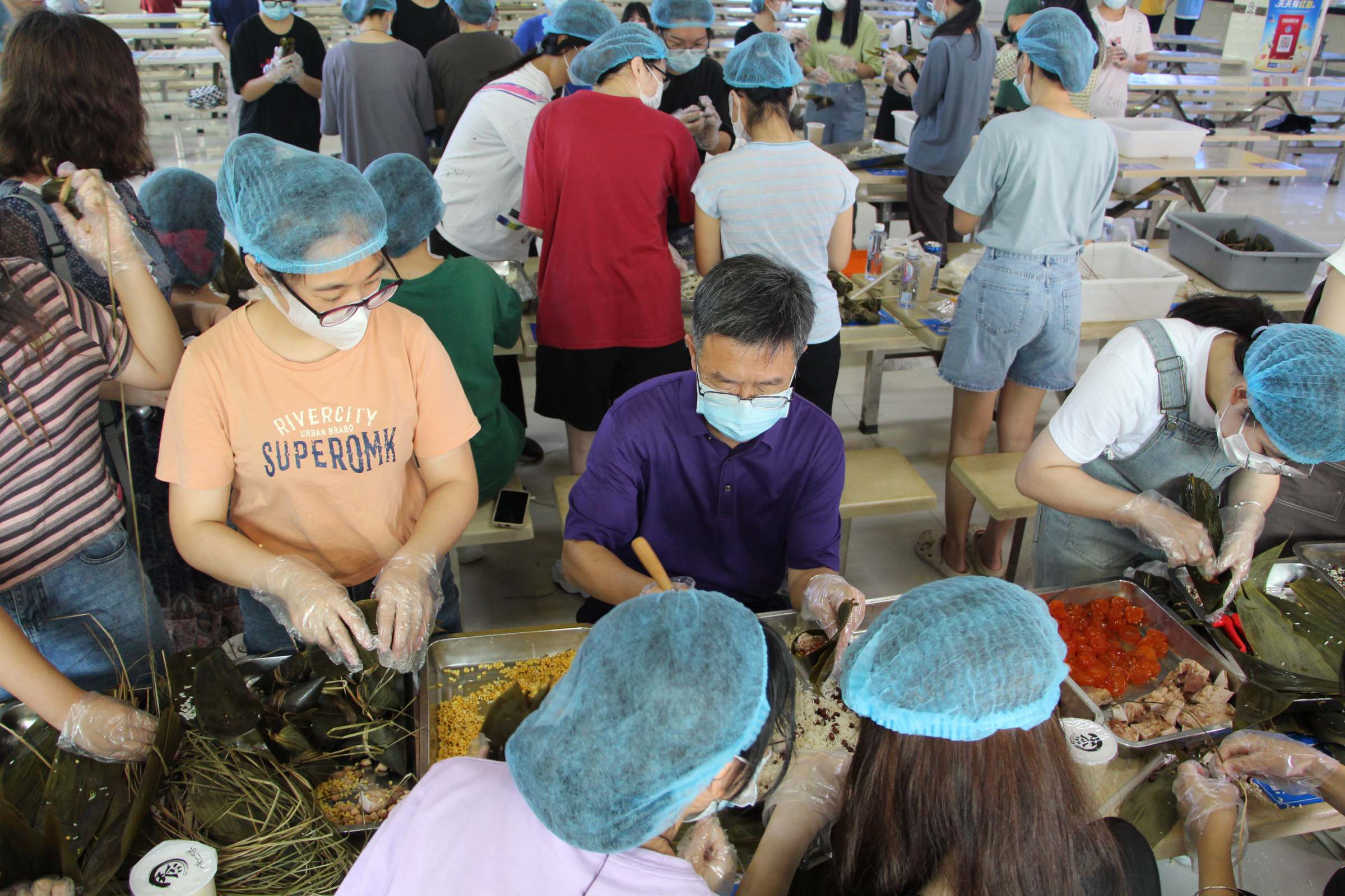 饭堂工作人员拿出提前精心准备好的粽叶、糯米、红豆、蛋黄、花肉等材料,并指导老师和同学们制作节日粽子。师生握粽叶、放馅料、绑粽绳,乐在其中。期间校学生会组织大家围绕端午节开展了趣味知识问答,同学们认真聆听问题,踊跃抢答,从端午节的由来传说到“喝雄黄酒”“赛龙舟”等端午传统活动的意义,再到讲述自己家乡的端午特色民俗,现场欢声笑语一片。
