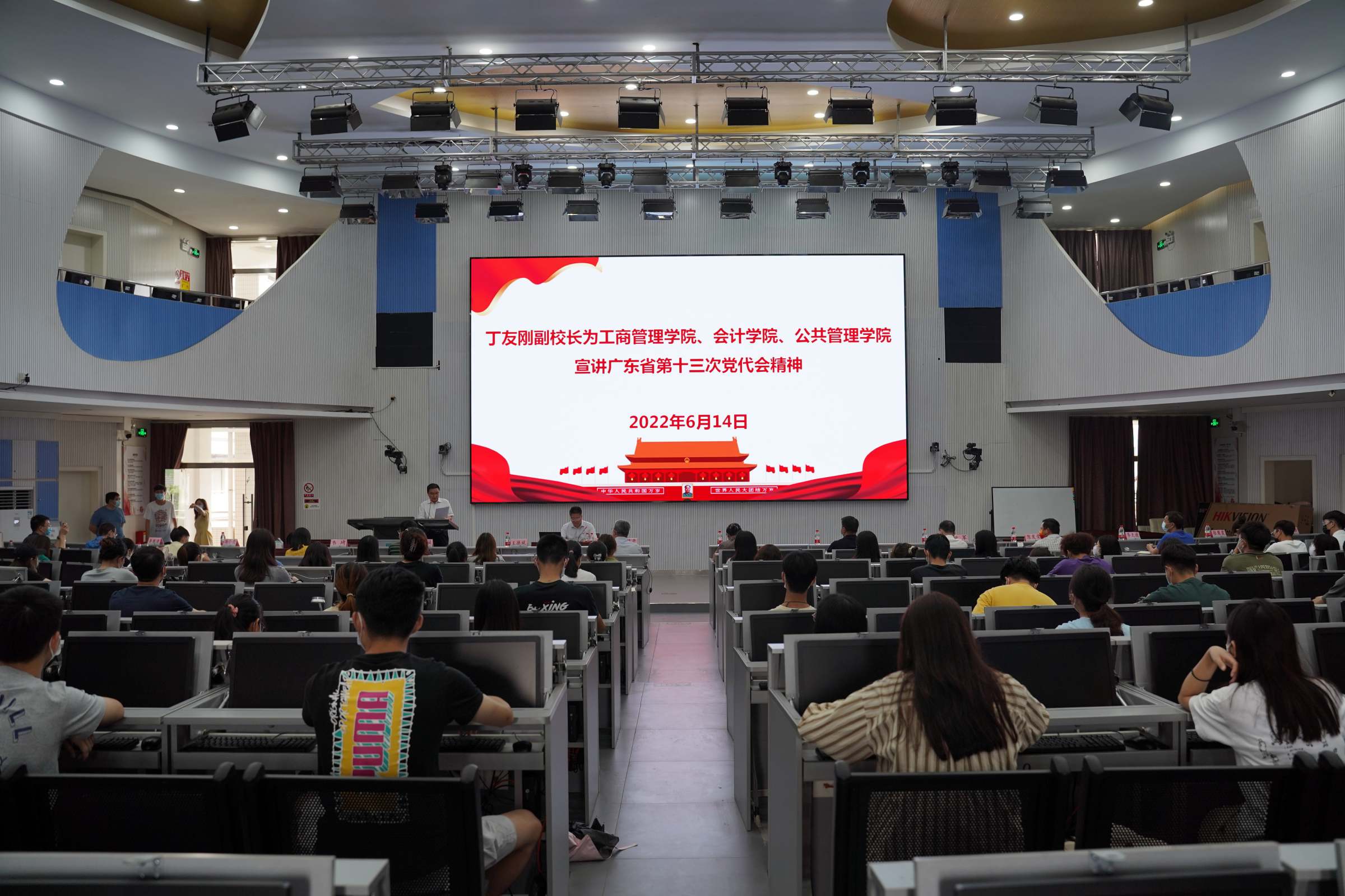 6月14日下午,副校长丁友刚在广州校区经管中心为工商管理学院、会计学院、公共管理学院三个学院近200名师生代表讲授思政课,宣讲广东省第十三次党代会精神。