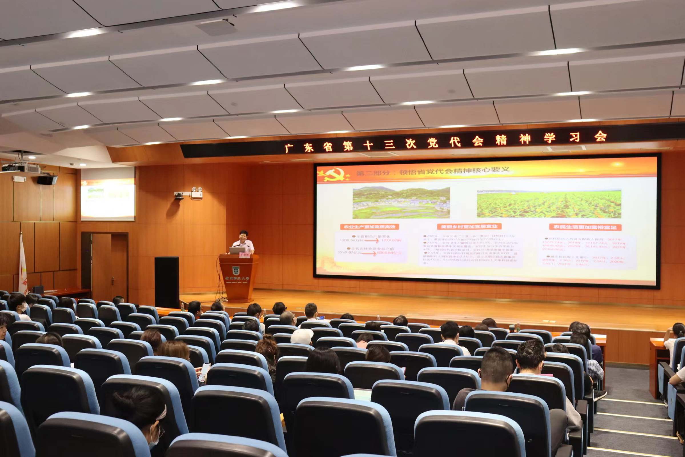 6月14日下午,学校党委副书记罗贤甲在广州校区正心堂为艺术与设计学院全体教师、艺术与设计学院和外国语学院学生党员及入党积极分子代表近200人讲授思政课,宣讲广东省第十三次党代会精神。讲座由艺术与设计学院党委书记彭翠峰主持。