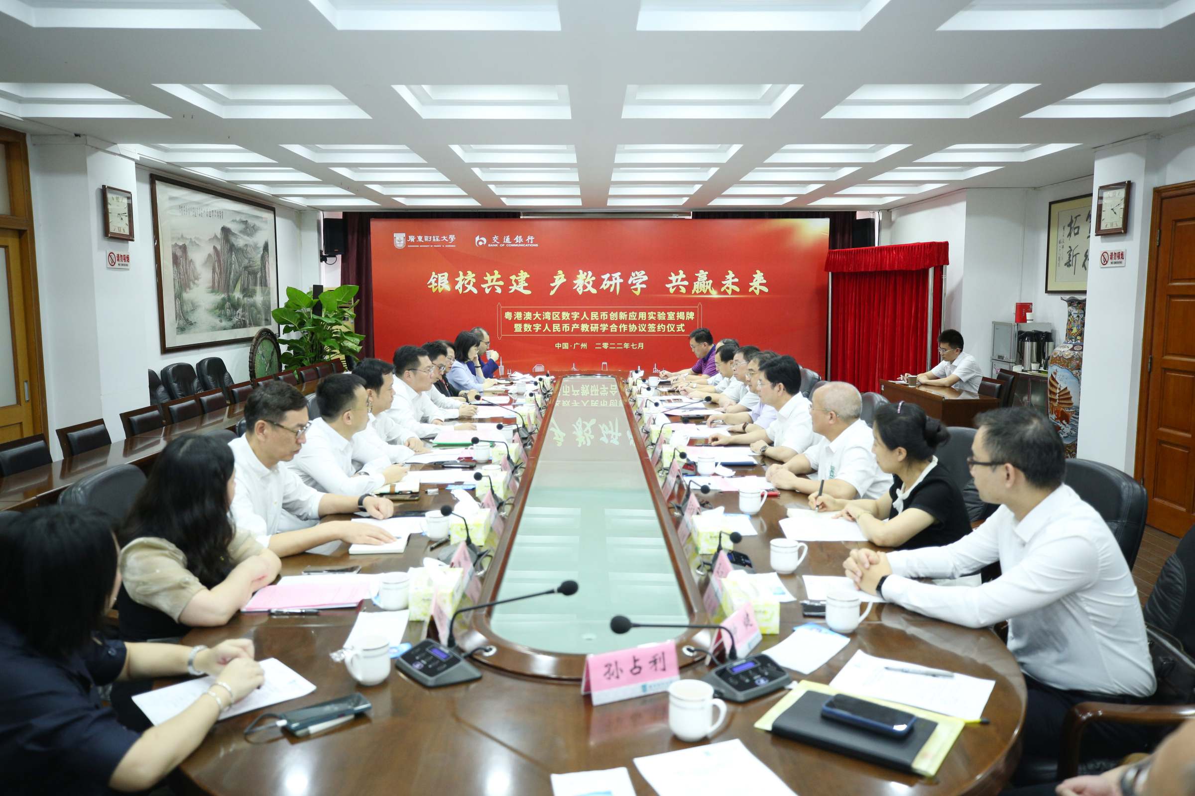 随后,邹新月、黄海代表双方签署了数字人民币产教研学合作协议。郑贤操、唐朔等与会领导共同为“粤港澳大湾区数字人民币创新应用实验室”揭牌。