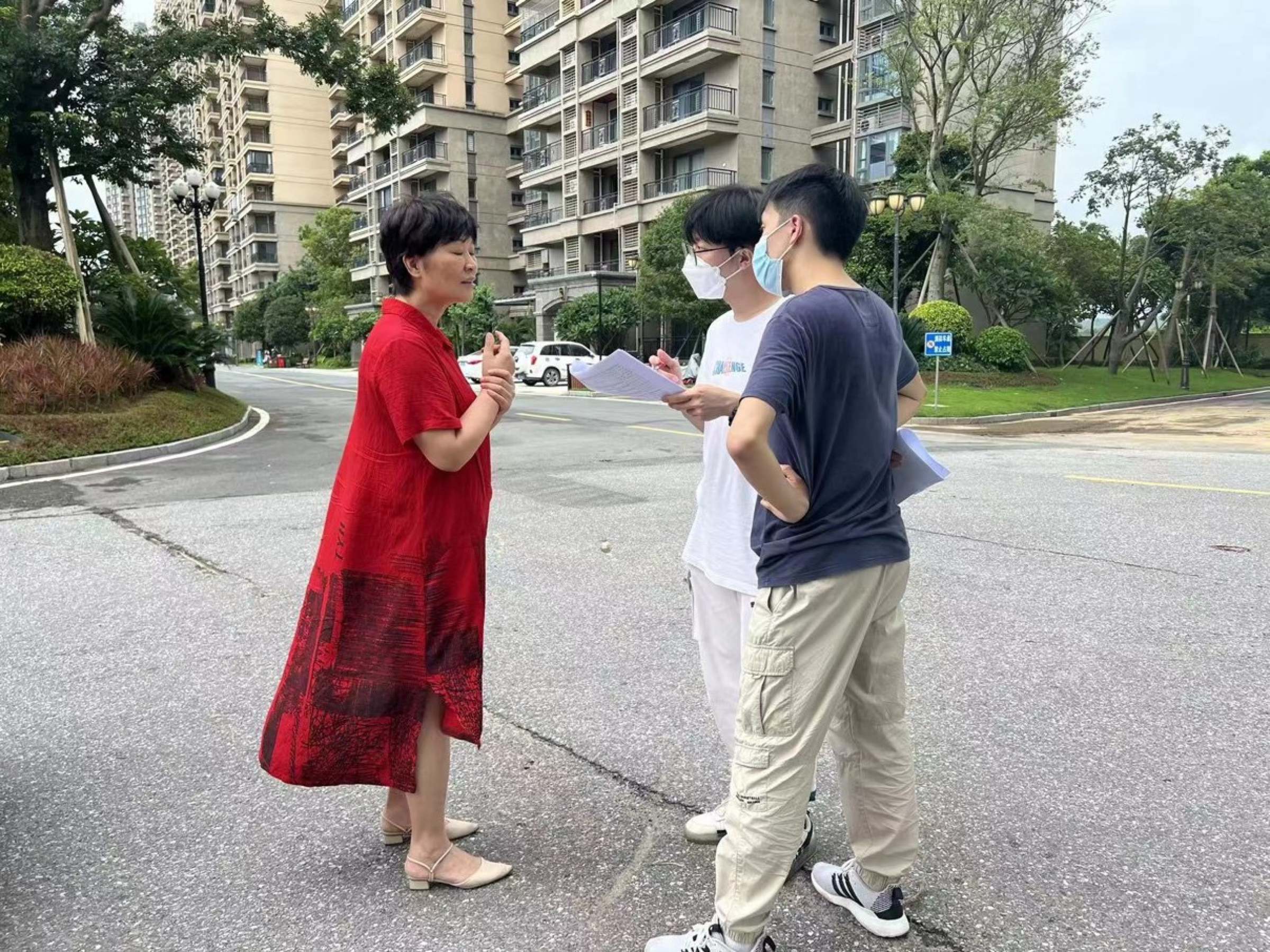 7月7日,团队到江门开平市继续开展调研活动。上午9点,到达祥龙公园后便迅速展开了针对老年群体的随机问卷调查。当日下午,团队来到开平市长岭村,与该村村干部进行了交流访谈。访谈中了解到,长岭村辖区共有7条自然村落,村内设施大部分由华侨捐赠,村委进行维护。村内配备政府指派的一位“家庭医生”驻扎,每年会为该辖区老年人提供体检服务。村内有专门的质保主任承担法律顾问的角色,协助警察调解纠纷,并定期对老年人进行反诈宣传。