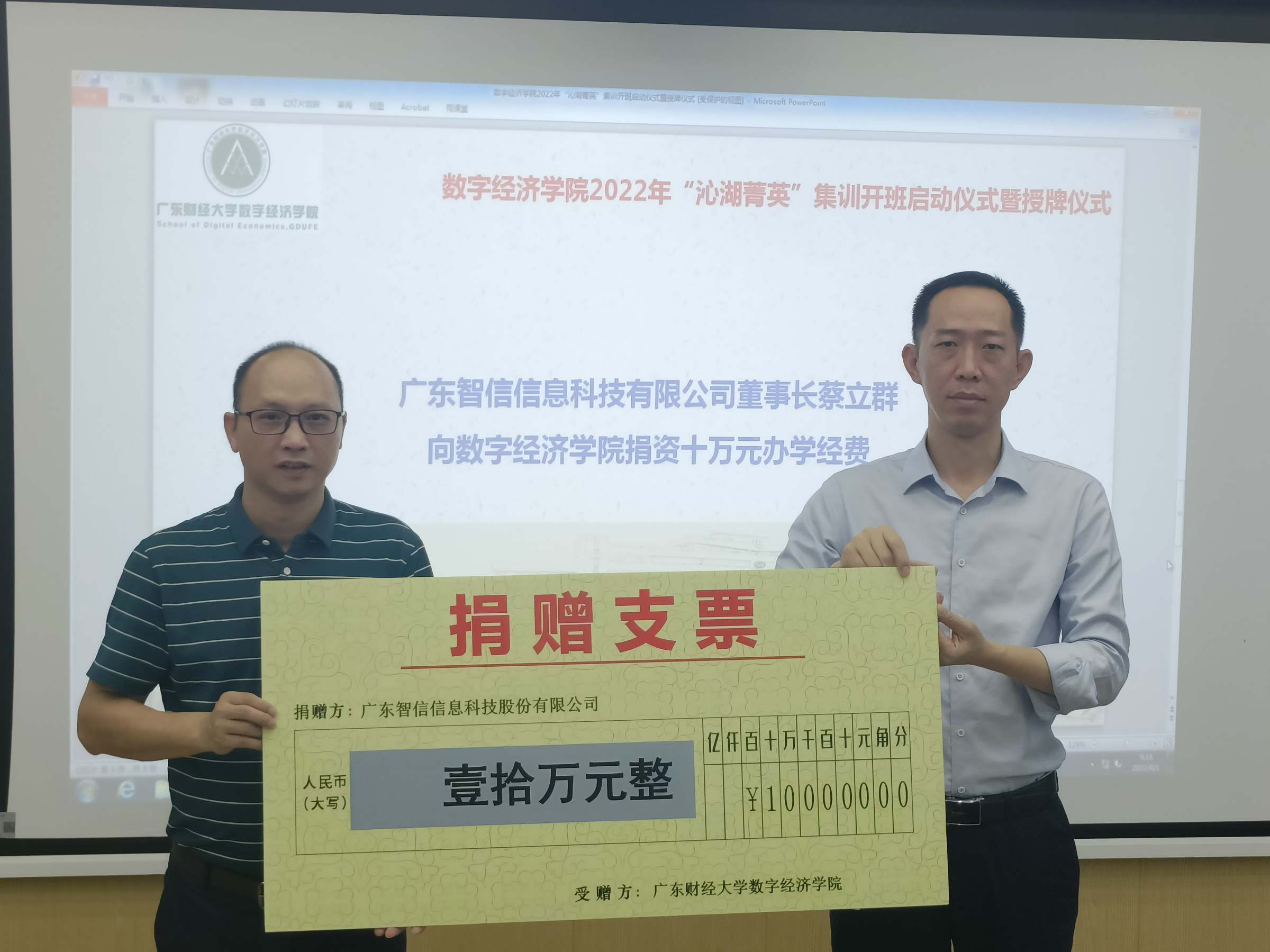 在开班仪式上,广东智信信息科技股份有限公司向数字经济学院捐赠了十万办学经费。蔡立群在致辞中表示,城市经济进行数字化转型是大势所趋,数据将成为继土地、劳动力、资本、技术构成的全球竞争的生态新的赛道,但是要完成数据的资源化、产品化,不仅要依靠技术进步,更加需要搭建一个能够进行数据处理及交易的智能平台,还需要许多制度的支持。企业通过合理的运用数据,能够有效地驱动助力企业的各类经营运营,实现企业运营的降本提现。蔡立群通过智能化停车场这一具体的实例,阐述了城市的数据中心及应用的决策中心,是如何运用大数据来精准分析城市各类车辆在不同场合的停放问题,以及如何通过数据分析与政府合作来更好地服务城市居民,真正做到数据惠民。