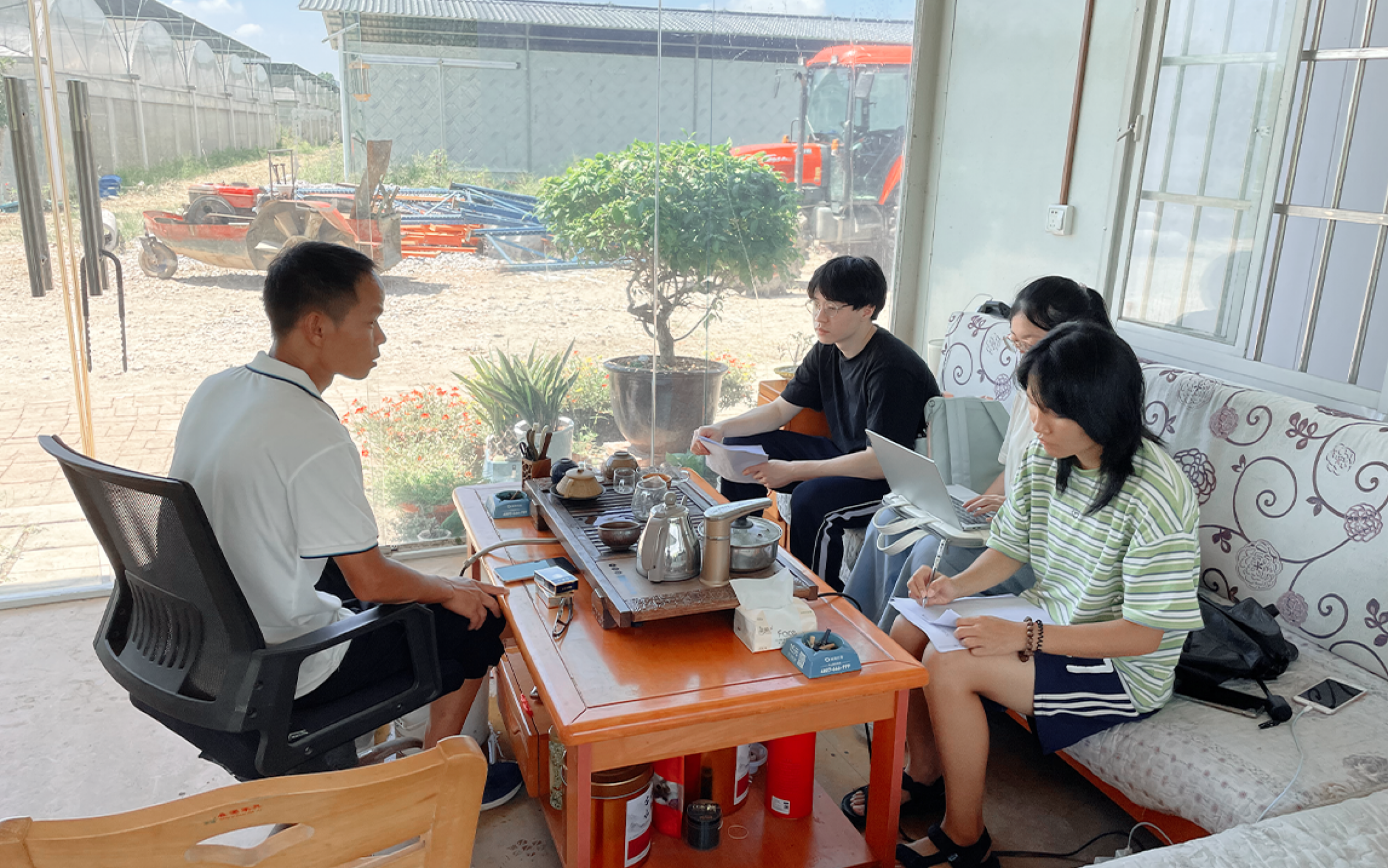 团队成员此次调研的重要关注点落脚于仁化县的“一村一品”政策,即不同村的特色种植业发展状况,围绕此方面,江头村与安岗村特色种植基地负责人交上了截然不同的答卷。在与被誉为“粤港澳大湾区‘菜篮子’生产基地”的江头村蔬菜基地承包公司——丹霞女农业科技有限公司负责人的交谈中,团队成员了解到,该公司几年来通过土地流转而将最初仅20多亩的基地壮大至5000多亩,凭借培育8个品种的瓜果蔬菜、将其销往珠三角,当下已达到1年5000多万元的营业额,原本的家庭式经营公司现如今正朝规模化转变中,励志从“人管人”转型为“企业文化管人”;针对团队成员重点关注的“人才空心化”问题,该公司提倡与高校、农校合作,同时利用好政府政策补贴来吸引外来人才,并通过完善企业文化氛围以留住年轻人才。在与植根于红色安岗村的仁化县雪梅果园农场负责人的交谈中,团队成员了解到,该基地现如今乃至未来主要采取的路线是“文旅结合”,充分利用好当地的红色旅游资源,通过观光游、亲子游的方式扩宽瓜果蔬菜种植、畜牧养殖道路,以便留住散客、盘活经济、形成更高的后续效益;针对团队成员重点关注的“规模化”问题,负责人反映农业经济十分仰仗市场行情,培育农户的时间成本又极其昂贵,故该基地更采纳无人机播种的方式来压缩成本。