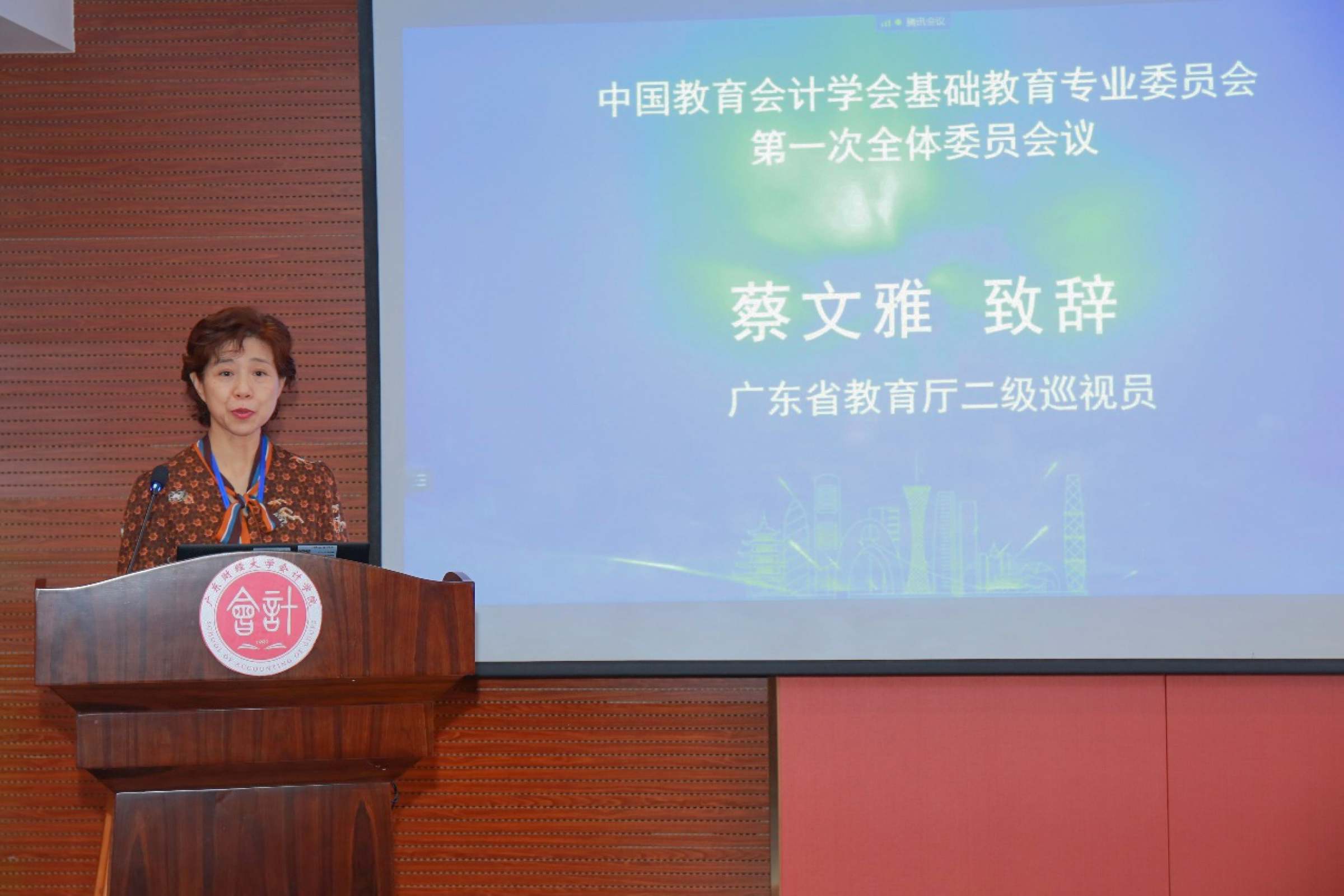 蔡文雅代表广东省教育厅和基础教育专业委员会对会议的召开表示祝贺,并对基础教育专业委员会第一次全体委员会议在广东召开感到荣幸。她在致辞中表示,此次会议内容丰富、责任重大,也是广东教育财务工作者十分难得的学习机会。她指出,党的十八大以来,习近平总书记对广东的发展高度重视并寄予厚望,广东省委省政府坚持以习近平新时代中国特色社会主义思想为指导,奋力推动广东高质量发展迈出坚实步伐。本次会议的召开体现了中国教育会计学会对广东省教育工作的信任,基础教育专业委员会将以本次会议为指导,认真履行职责,全面系统深入学习研究解决教育财务重大现实问题,为提高基础教育财务治理水平,助推基础教育高质量发展而努力。