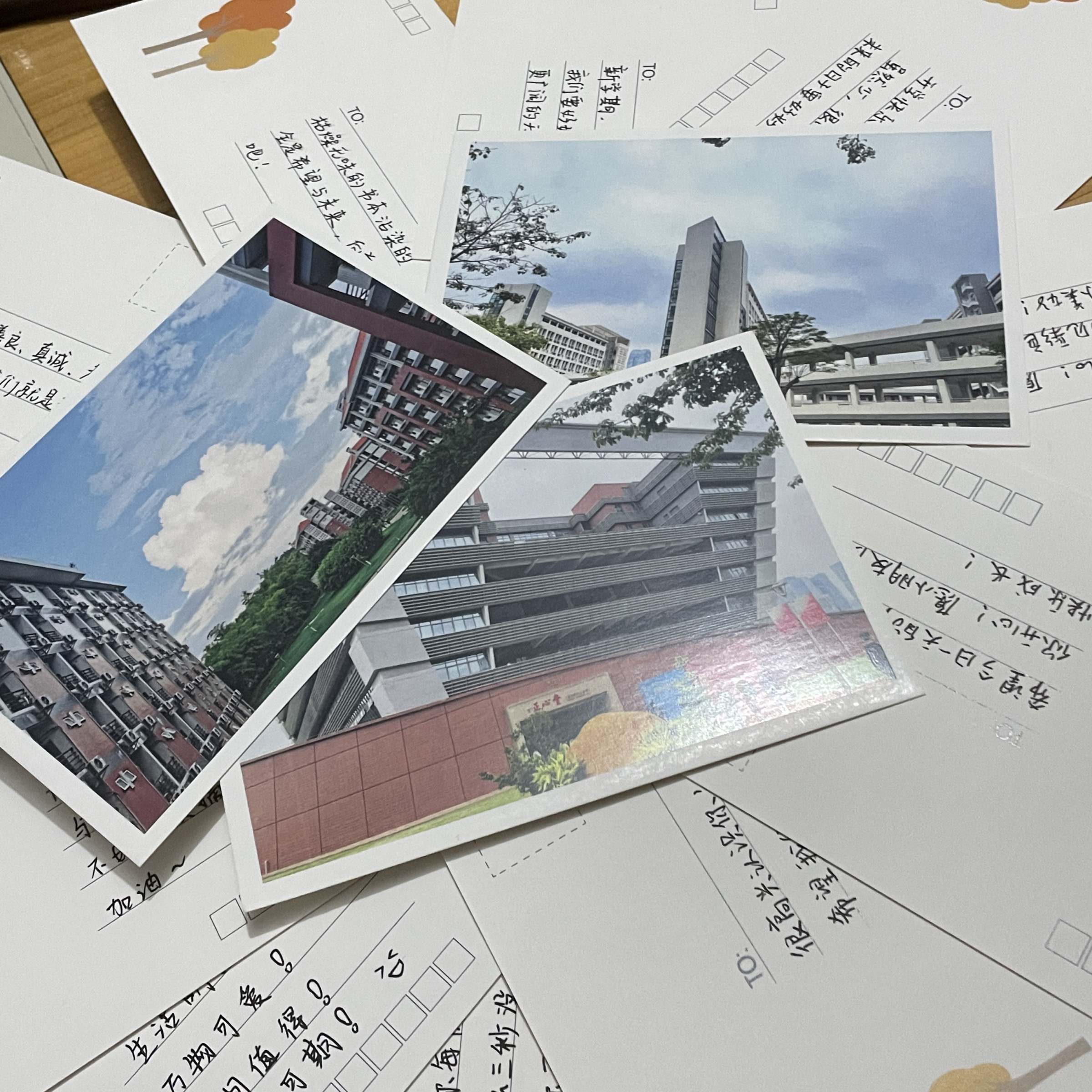 活动结束后,团队通过自己拍摄的广财校园图片制作成明信片,并写上寄语送给学生,希望通过这些明信片,让他们看到广财大学美丽的校园风光和良好的学好环境,激励他们努力学习。
