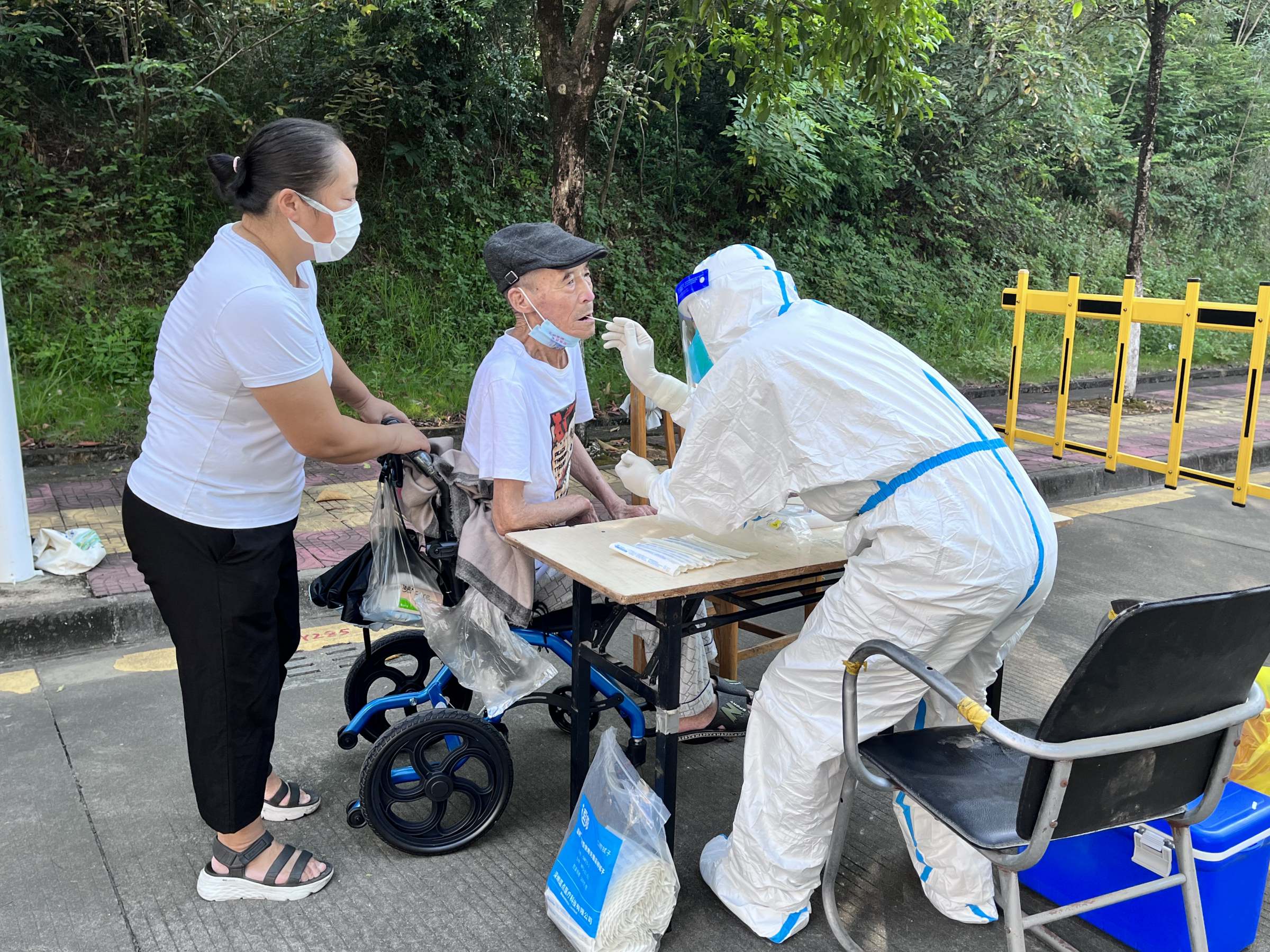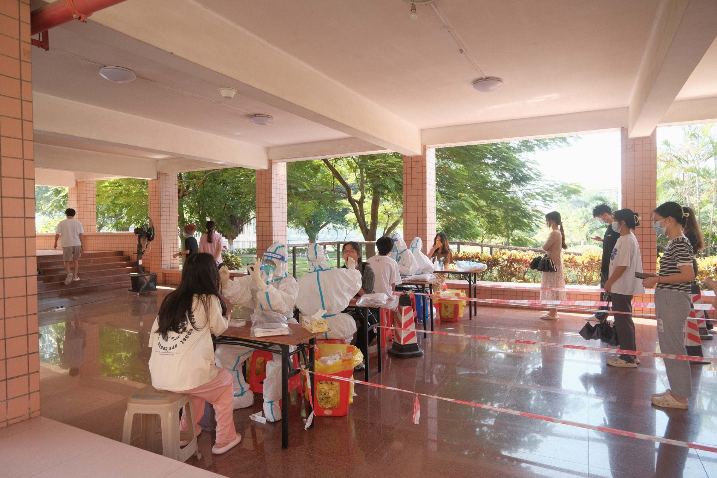 为全面阻断新冠肺炎疫情扩散蔓延,助力打赢佛山校区疫情防控阻击战,佛山校区始终坚持以师生为中心,严格落实属地疫情防控要求,持续优化核酸检测工作。9月6日上午,校区内组织开展了本学期以来第五轮大规模全员核酸检测。为了保障学校线上教学秩序,实现学生上网课和核酸检测两不误,佛山校区进一步优化前四轮核酸检测位置,在原校内核酸采样点的基础上增加了励学楼、桃园两个点,全面满足“就近核酸,即来即检”的防控要求。每一个核酸点配备校区医护室工作人员1名、校区工作人员1名,配备足量风扇与物资等。周转房核酸采样点自9月3日设置以来,受到周转房居住人员的“青睐”,解决了不少退休老师、腿脚不方便老人的“核酸之忧”。为做到“应检尽检”,学工系统人员深入学生宿舍园区采用“喊麦”“唱歌”等形式通知师生,力求提供更好更贴心的核酸服务。