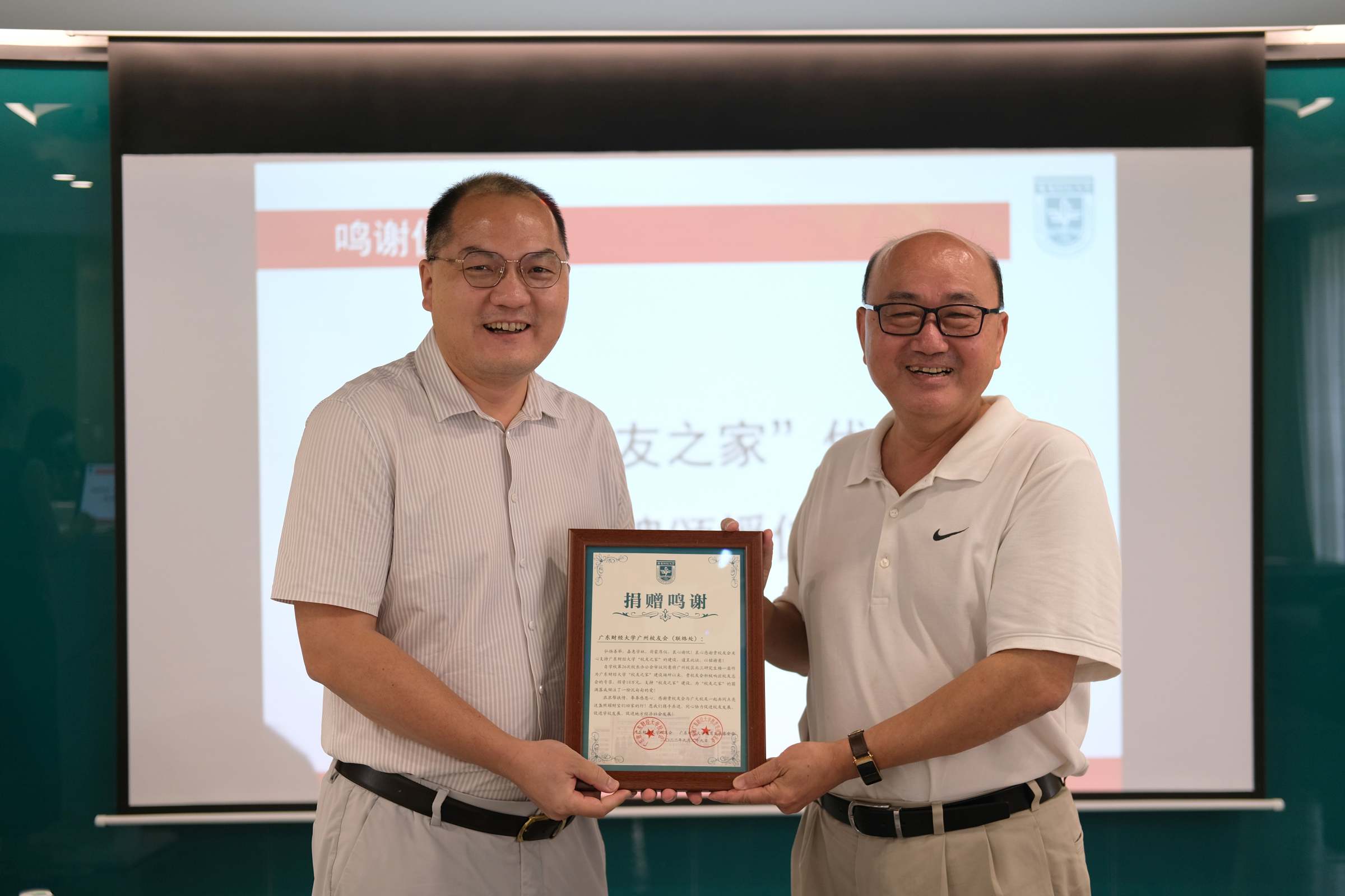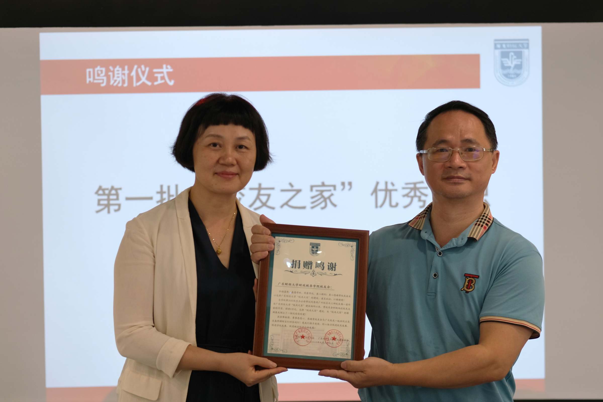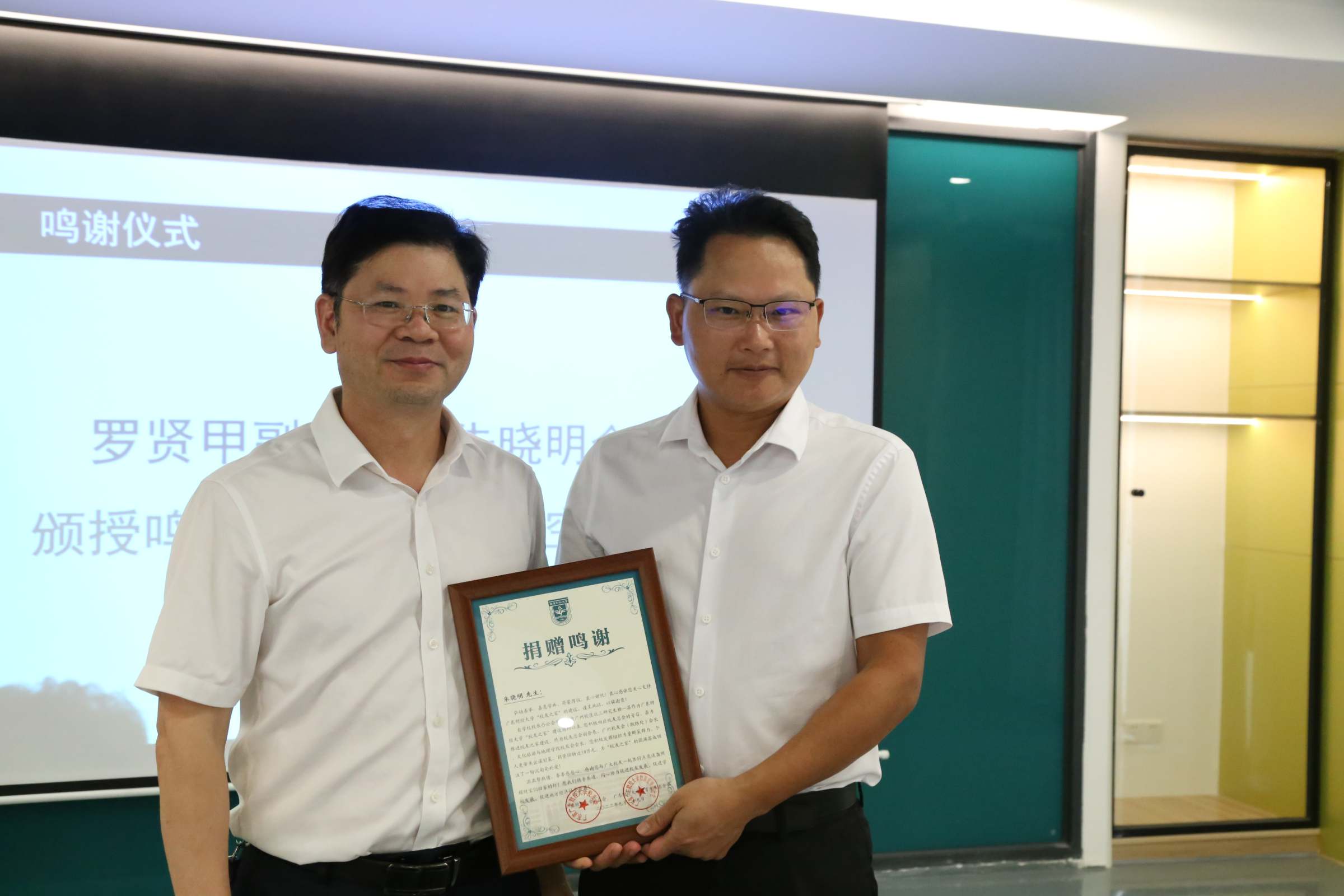 罗贤甲为广州校友会(联络处)会长朱晓明颁授鸣谢牌并颁发茶话空间钥匙,为洪武桂(1999级旅游管理)、陈崇文(2003级市场营销)校友颁授鸣谢牌,并向他们为“校友之家”作出的贡献表示感谢。