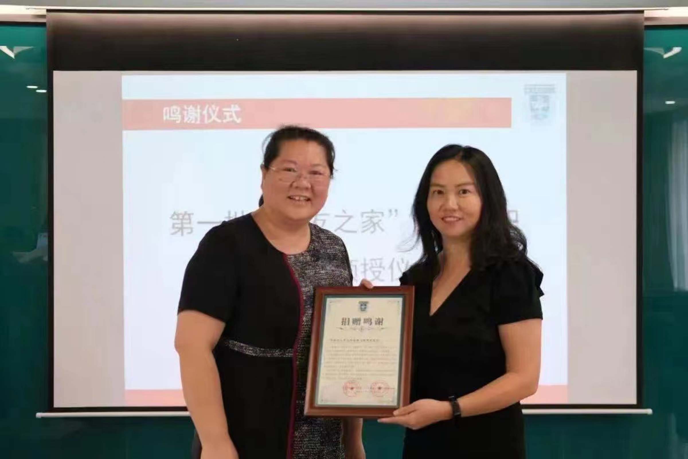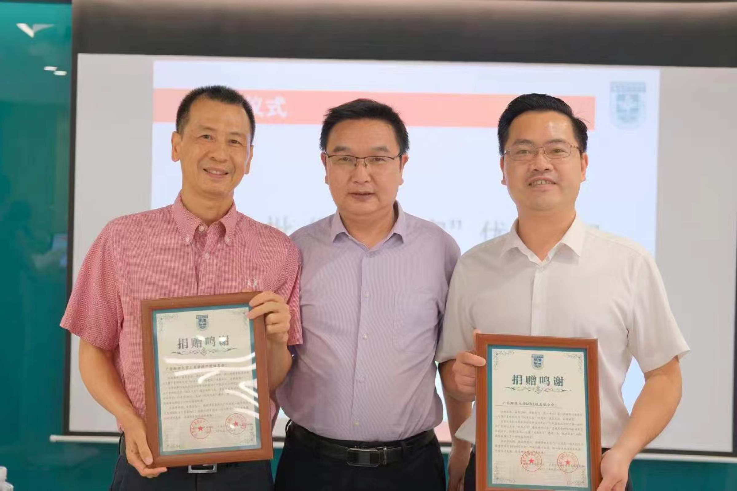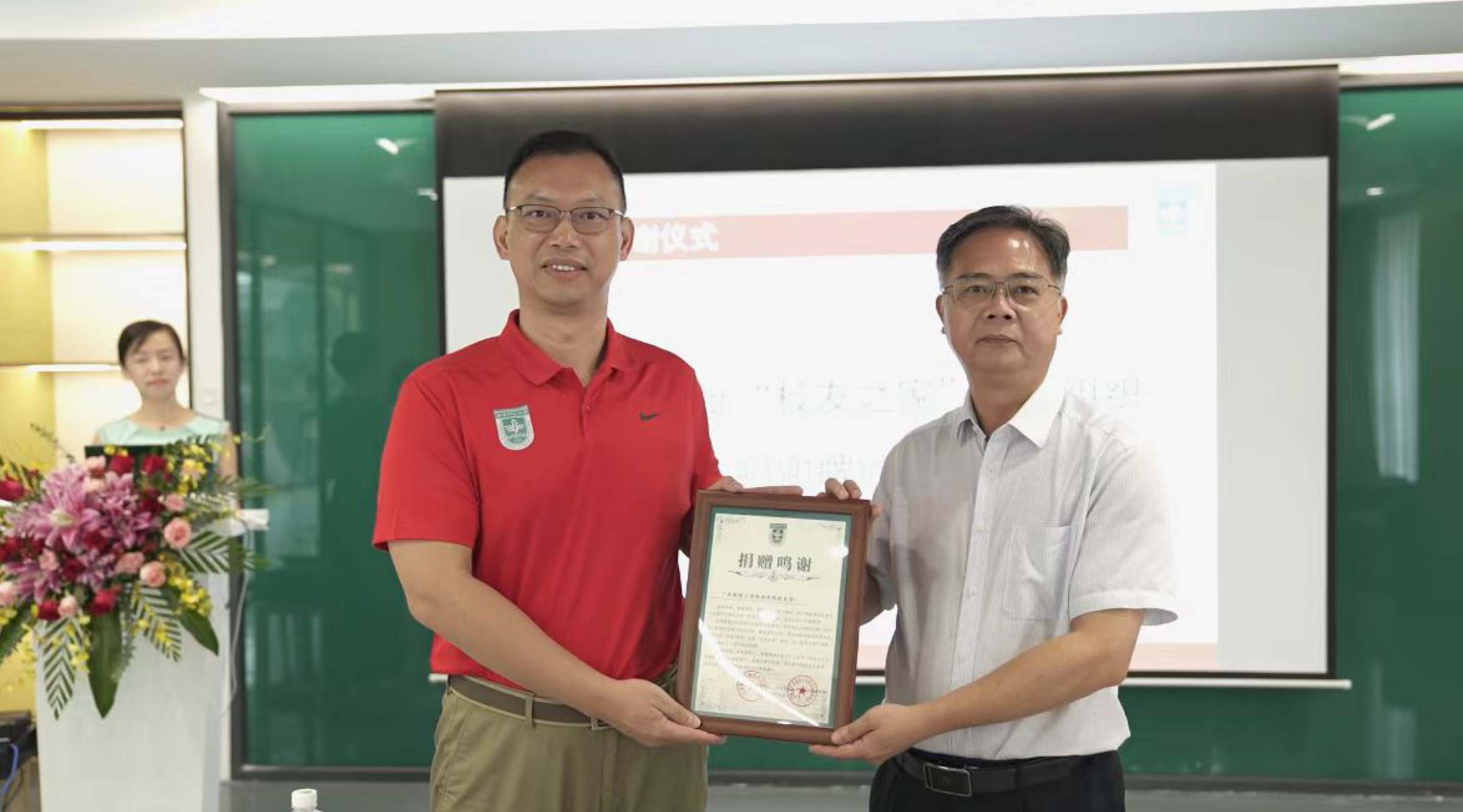 罗贤甲为广州校友会(联络处)会长朱晓明颁授鸣谢牌并颁发茶话空间钥匙,为洪武桂(1999级旅游管理)、陈崇文(2003级市场营销)校友颁授鸣谢牌,并向他们为“校友之家”作出的贡献表示感谢。