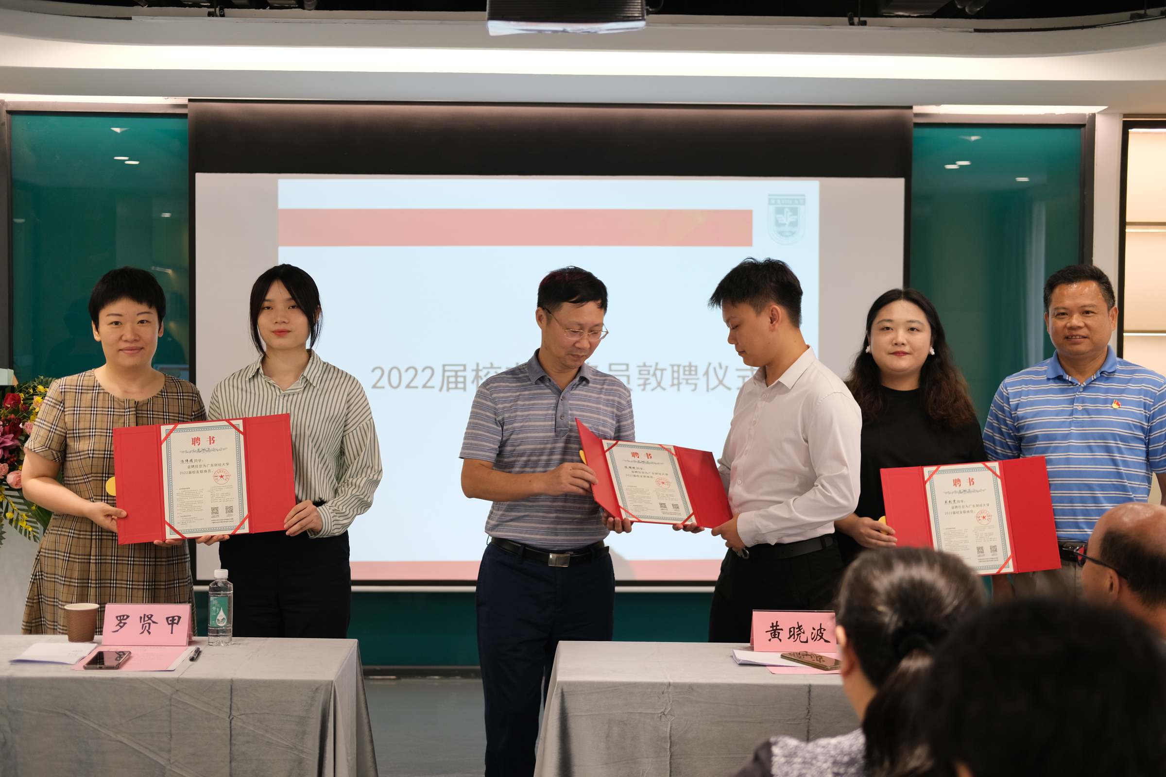 金融学院党委书记陈木河、法学院党委书记陈静、会计学院副书记陈发荣分别为金融学院、法学院、会计学院校友联络员代表颁发聘书。在与会人员共同见证下,黄晓波、罗贤甲、段丹、朱晓明为“校友之家”揭幕。至此,广东财经大学“校友之家”正式落成。