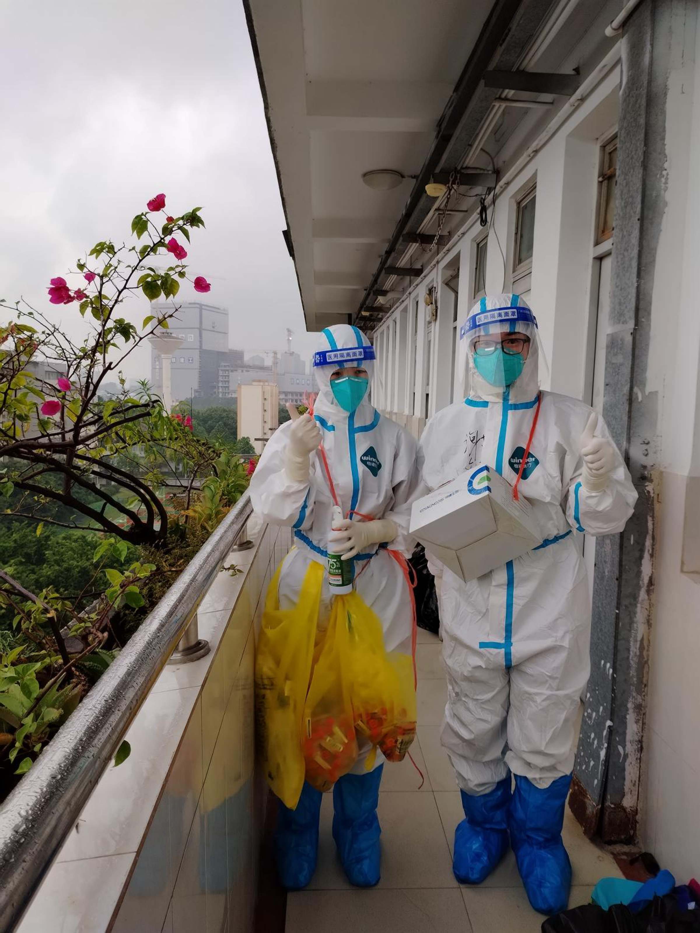 16日回校当天,她加入高风险封控区“化1”楼栋分队,与一名男老师一起负责6楼的送餐任务。开始时一天送三次,后来一天送两次。“化1”宿舍是步梯,穿着大白服连续三天高强度爬楼送餐后,她的背和腿都酸痛无比,走路时腿开始发抖。值得欣慰的是,三天后“化1”解封了。接下来她陆续被派往其他高风险封控宿舍送饭,32栋、25栋、29栋,每一栋都留下了她穿大白服的身影,留下了她的汗水和对学生的爱。