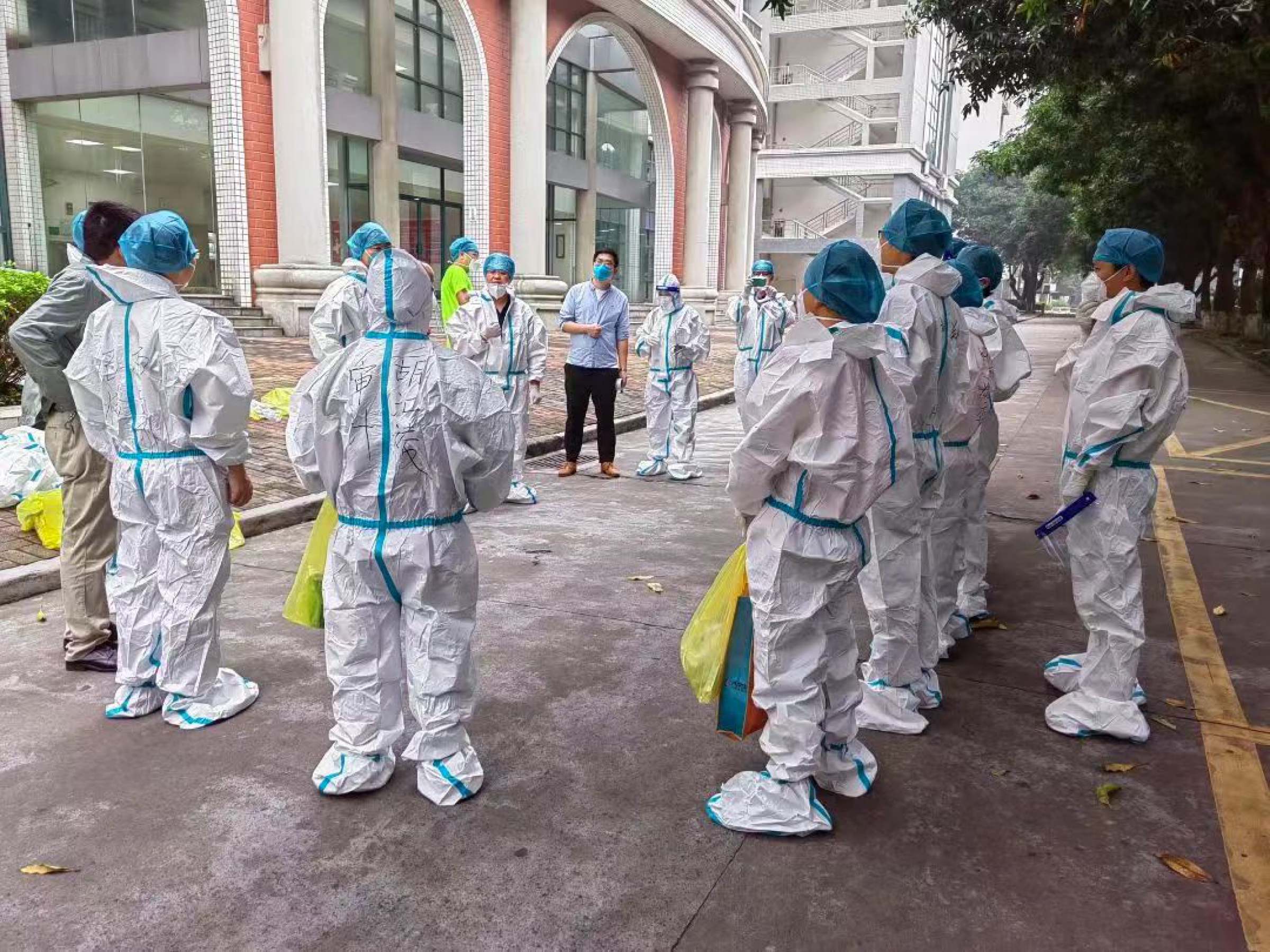 21栋学生宿舍共有400多名学生,学院分布范围较广,且没有统一的楼栋微信群;21栋学生宿舍属于楼梯楼,走道在户外且相对狭窄,加上11月的广州仍然艳阳高照,穿着厚重的大白服上门做核酸,被太阳晒着,非常闷热难耐。但他与战友们没有被困难打倒,迅速明确分工,有条不紊地开展工作,通力合作。期间,他曾遇到医护人员难抵高温身体不适需要等待支援,也遇到过有学生情绪低落或激动的情况。但他都能迎难而上,沉着应对,冷静地找到后备方案和支援的医护人员,成功安抚学生情绪,按时保质完成了核酸检测任务。