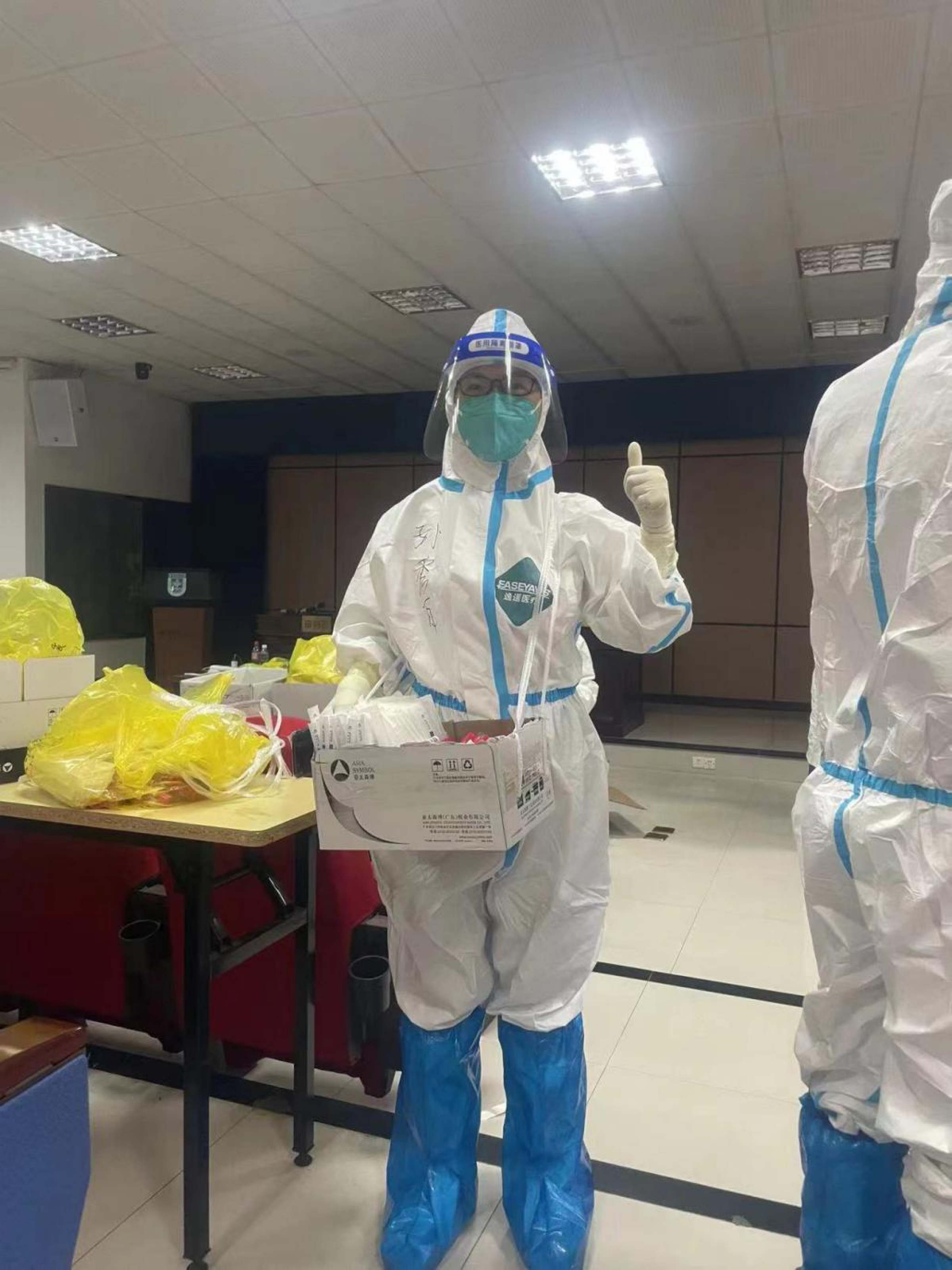 回校后,她马上穿上大白服,到高风险区30栋学生宿舍,上门做核酸检测。刚做完不久还没有吃晚饭,组织部部长郑金栈打电话来安排工作,问“累不累”,她回答“不累”,“不累的话,晚上参加27栋宿舍的送餐工作。”她又马上穿上大白服到27栋宿舍送餐。第二天七点多,早早地到综合楼前集中参加30栋宿舍的送早餐工作。完成自己所负责的楼层任务后,她又跑去帮助其他同志,那天上午她是最后一个离开30栋宿舍的。当脱下防护服时,汗水把她全身都湿透了。