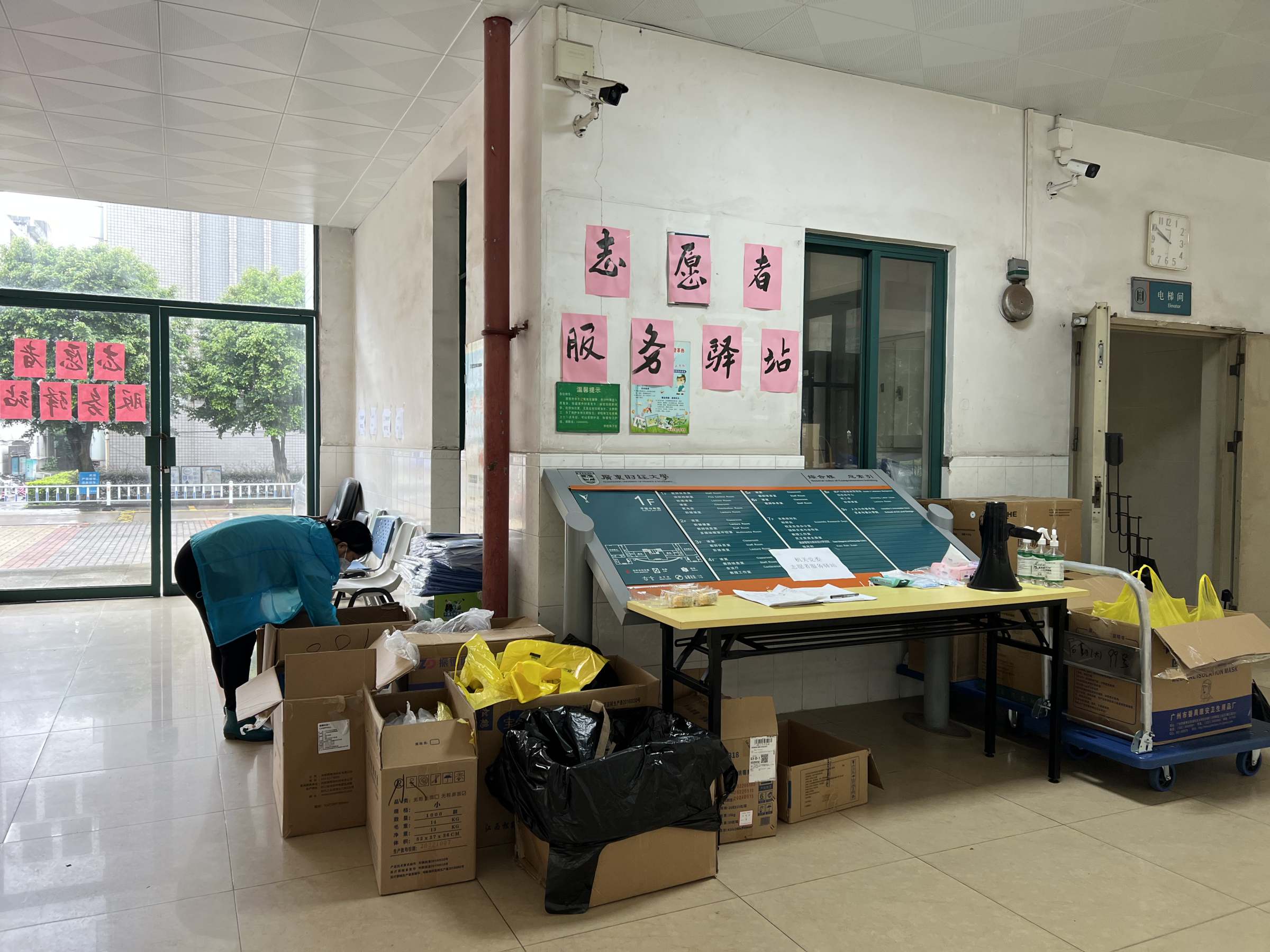 为更好保护志愿者健康,提高志愿服务的质量和效率,机关党委成立志愿者服务驿站,统筹志愿服务物资调配,为志愿者提供必要及时的后勤保障。服务驿站设在综合楼一楼中央大厅,安排专职志愿者按时上岗。一方面为高风险志愿服务队提供每天的工作套装,胶带等必需的工作用品,以及功能饮料等必要的能量补给;另一方面还提供了口罩、手套、常用药品、消毒粉等防疫物资,方便志愿者及时按需领取,只要志愿者有需要,驿站都尽力协调提供。特别是下雨那几天,由于驿站的提前预判,提前准备了一批雨衣,为志愿者防疫工作的开展提供了极大便利。小小的驿站优化了志愿服务的资源配置,补足了志愿服务“最后一米”,凝聚起浓浓的人情味,让每位志愿者感受到了学校的关怀与温暖,保障了高风险志愿者的安全,提高了工作效率和质量。