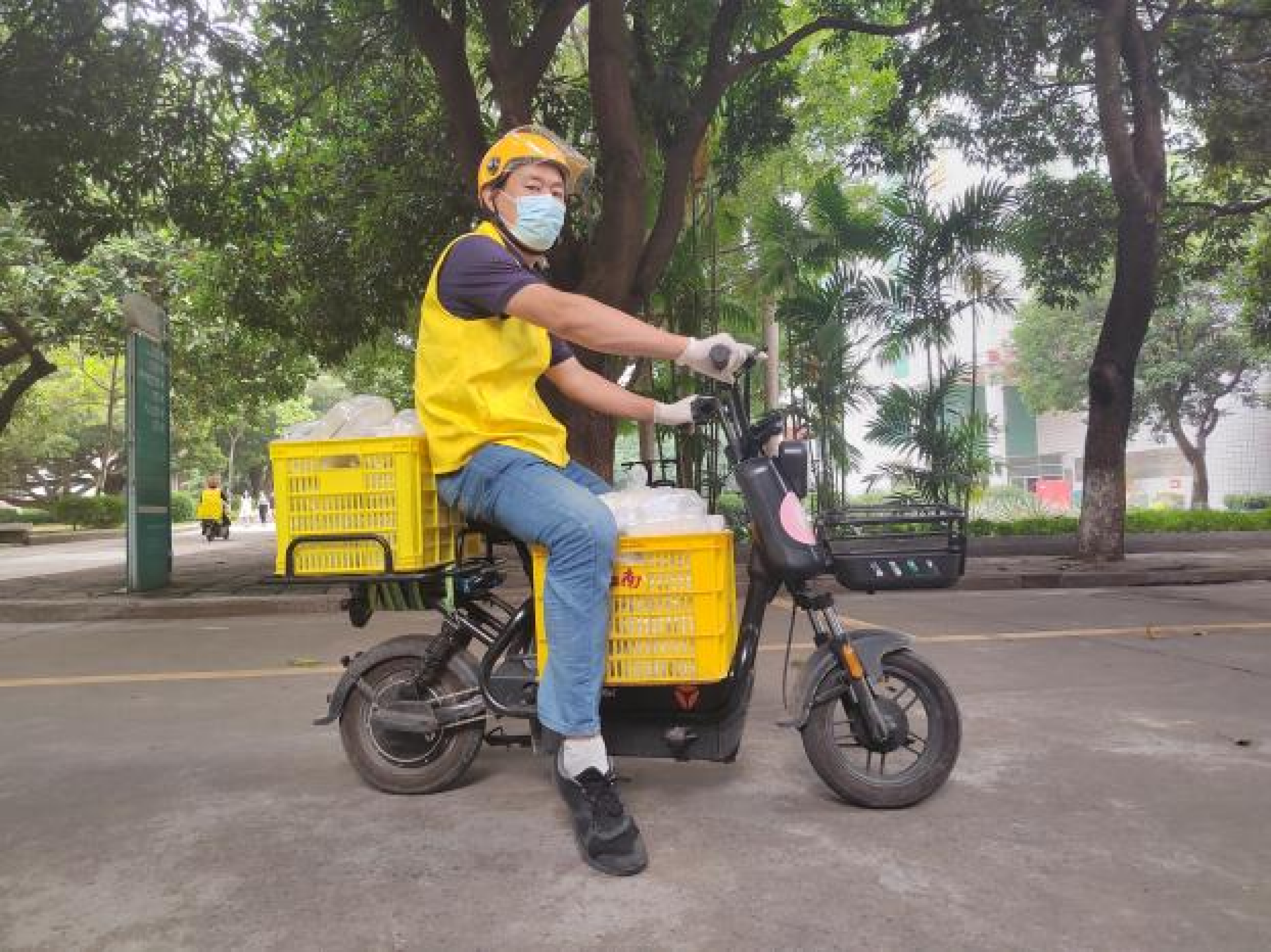 潘苹果老师是公司最年轻的90后小伙子,平时积极、活跃、有担当的他,13日接到学校的抗疫动员通知后,当天就收拾好行李,到校备战。14日交接完公司需要在校外处理的一些工作后中午到达学校,下午就立即投入高风险区的送餐工作。每次送餐工作都提前到,在送餐准备区和分餐工作人员一起分配物资并点数,然后再穿好防护服上楼送餐。10多天哪里有需要就到哪里去,每一次都是去高风险区。30栋解封后立即去32栋支援送餐,18栋封楼后又立即去18栋送餐,18栋没有电梯,他送餐送到六楼,一开始是需要人力一次次带物资上楼,后来18栋装了升降机我就开始辅助操作升降机。