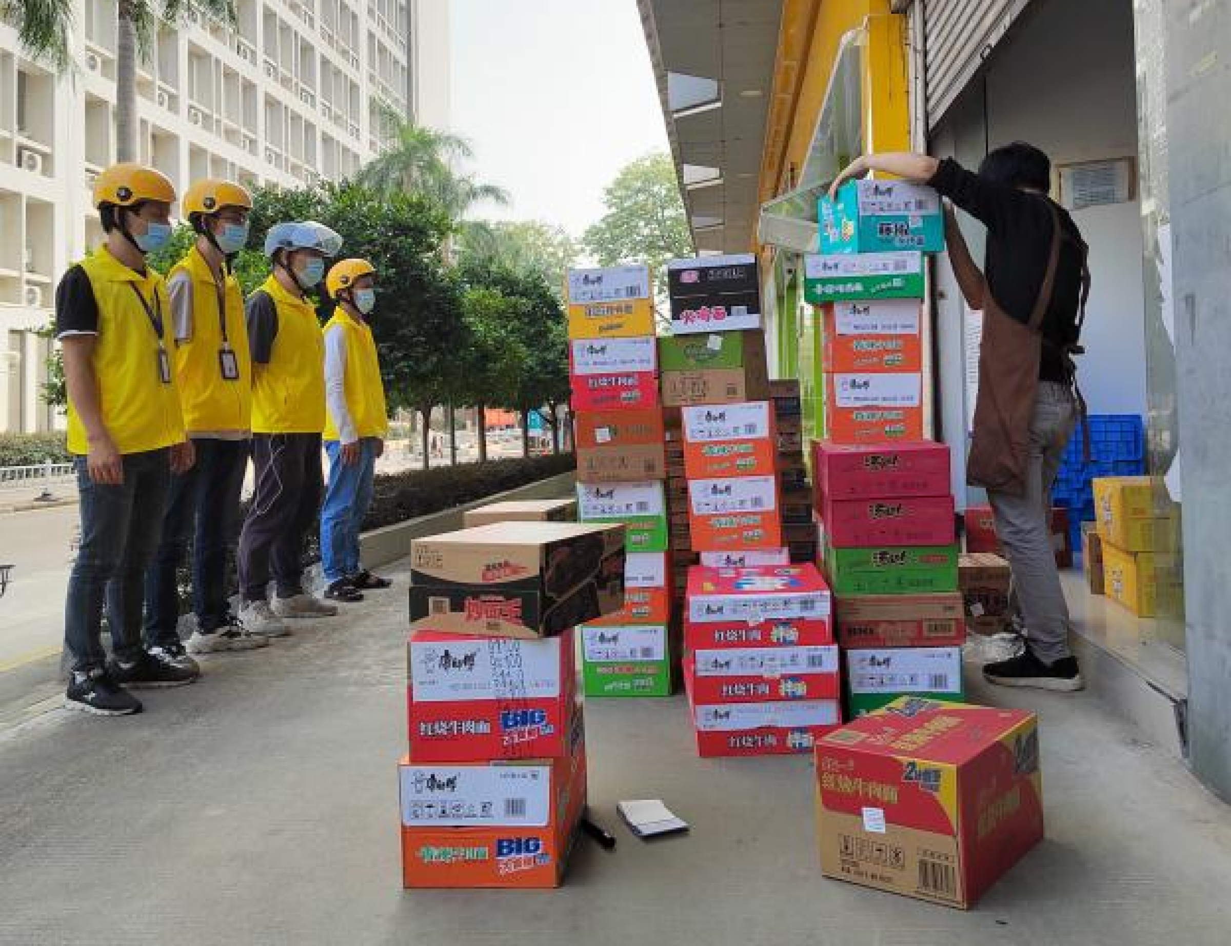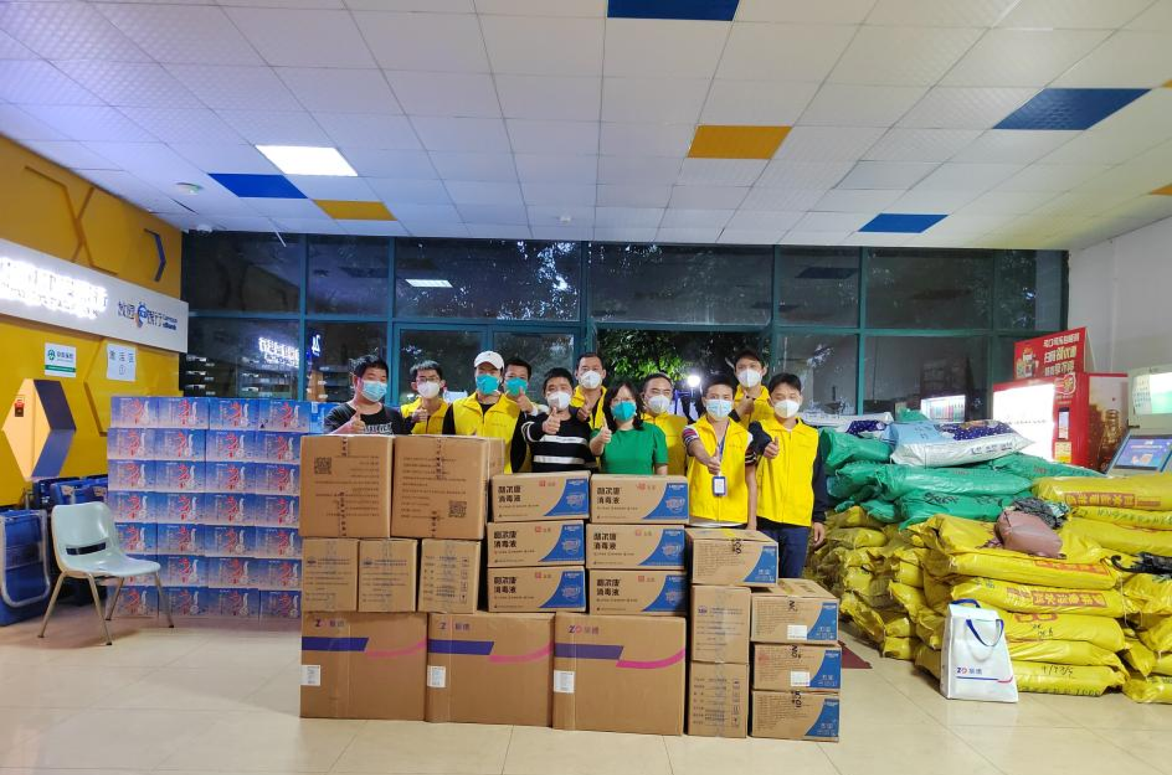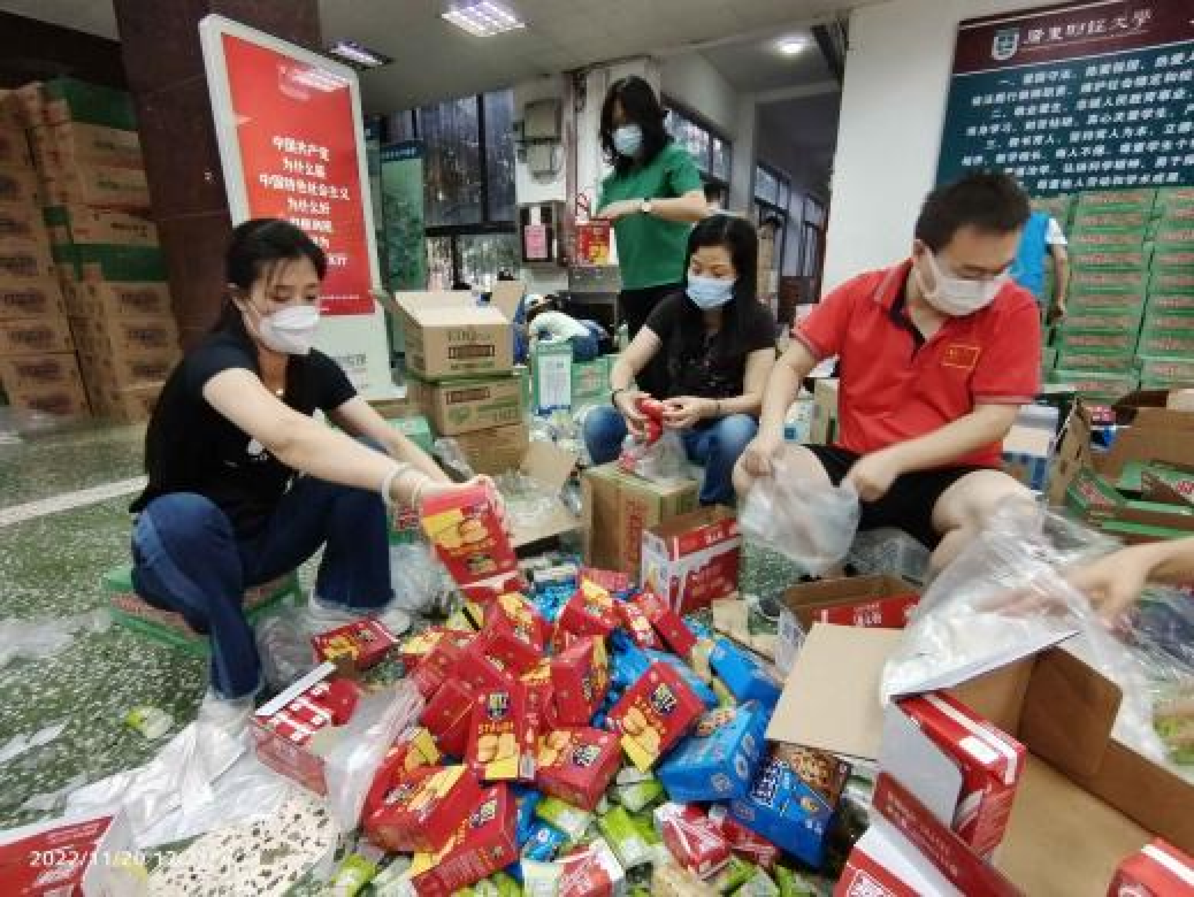 在物资方面,农特店捐赠的150件华农原实牛奶当天下午送达,捐赠的6000个陕西苹果和10箱蔬菜也于当晚7点半送达;公司马上组织人力进行分装,于11号当天晚上8点多就按每个人2个的标准送到了30栋学生的手上。农特店捐赠的200箱宝露瓶装水也于11月12日晚上到达;牛奶、苹果、瓶装水为学校收到的首批捐赠物资。此外,在海珠区实施道路临时交通管控的情况下,公司克服多种困难协调海珠区内最近的资源,又紧急调配78箱方便面于11月11日进校给临时封控的30栋学生做早餐;11月13日又紧急调配200箱方便面给32栋学生做早餐;11月13日按机关党委的要求,需要紧急补充胶纸、剪刀等防疫物资,当天晚上防疫物资即从其他区域成功进货到店。11月17日,农特店又向学校捐赠了150套日用品(每套包括:毛巾、牙膏、牙刷、洗发露、沐浴露、纸巾等6样物品)和1000斤四会皇帝柑。11月25日公司外卖配送服务项目合作方广州笑容环境管理服务有限公司(以下简称笑容公司)捐赠的利永康75%医用酒精300瓶、复质(喷雾)600瓶、福体健N95口罩2400个、医用外科口罩4800个到校。